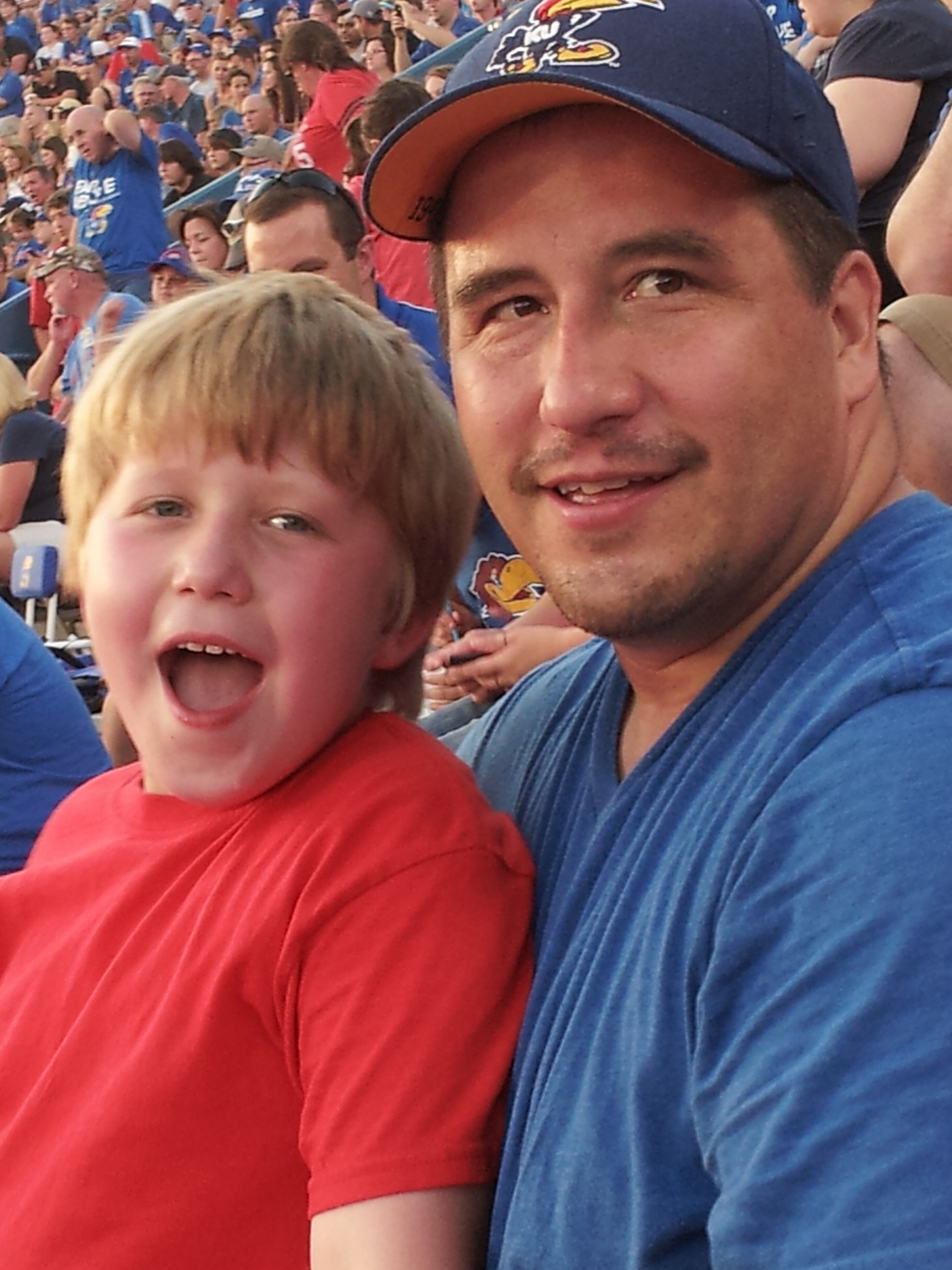 Alex Godinez, 7, and his dad enjoy Kansas University’s first football game of the 2013 season despite the late-summer heat. Sara Godinez submitted the photo.