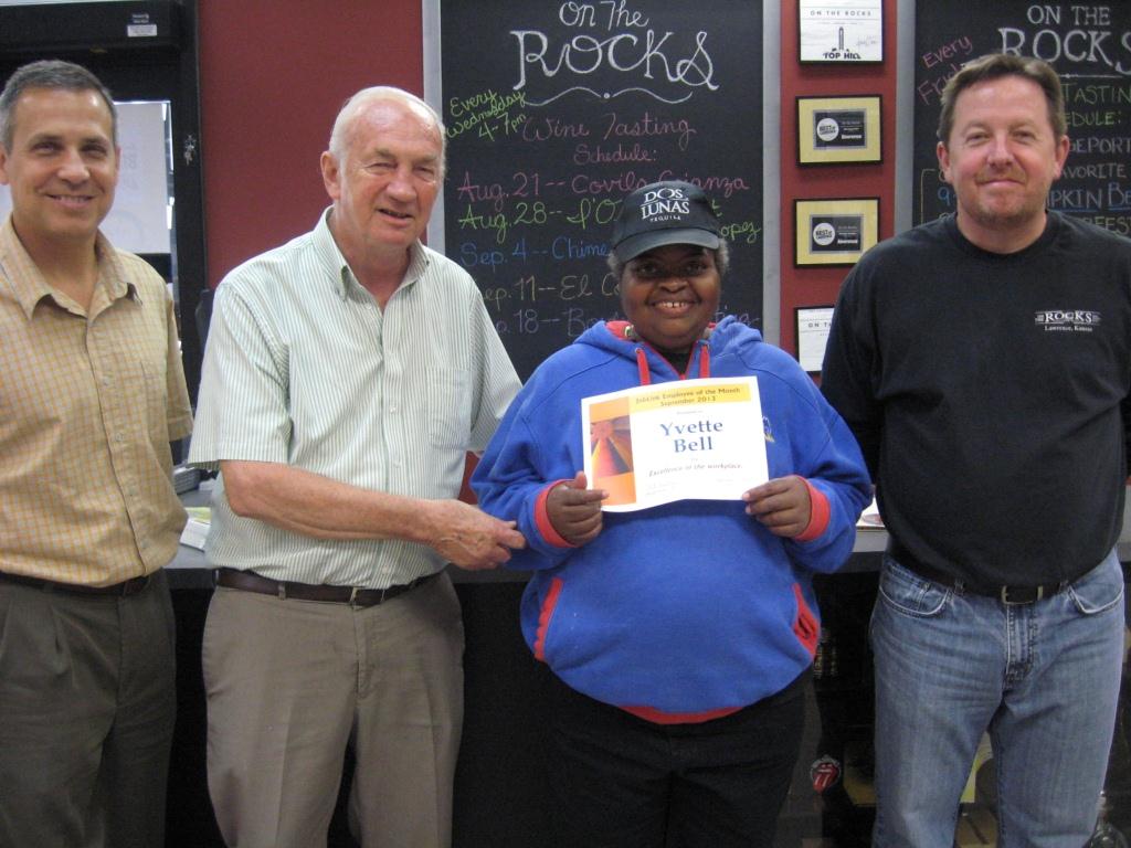 JobLink is celebrating its employee of the month for September, Yvette Bell, at On the Rocks. From left are Phil Bentzinger, Jack Leipzig, Bell and Matt Easley. Bentzinger is the director of JobLink, Leipzig is a JobLink consultant and Easley owns On the Rocks. Kari Bentzinger submitted the photo.