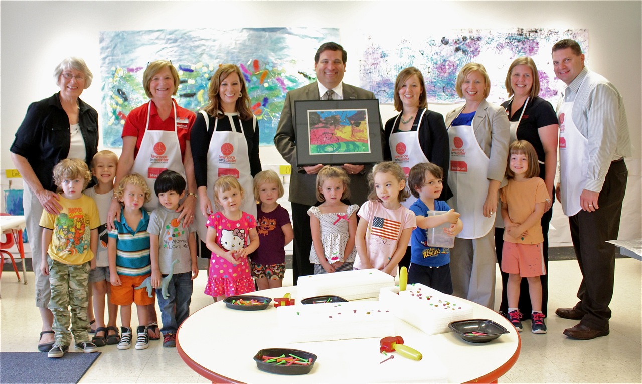 Lawrence Arts Center preschoolers presented visitors from Meritrust Bank with a piece of their own artwork after welcoming them as new sponsors and volunteers. Marlo Angell submitted the photo.