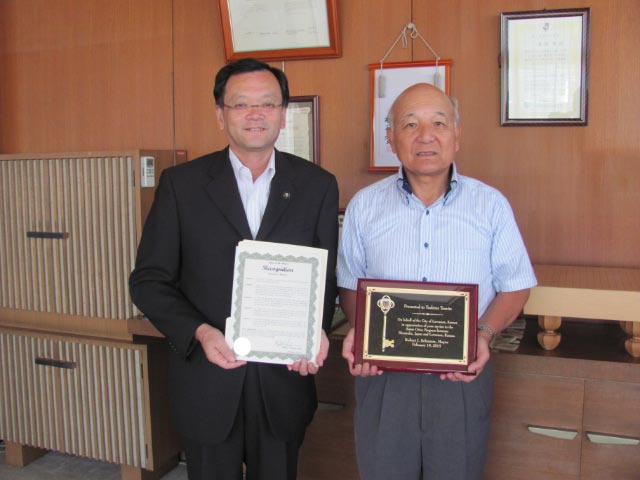 Mayor Katsuhiro Ochiai and Yoshimi Tomita of Hiratsuka, Lawrence’s sister city in Japan, pose with the plaque awarded by the Lawrence City Commission. Mr. Tomita was honored for his 26-year dedication to the sister-city relationship. Carol Shankel submitted the photo.