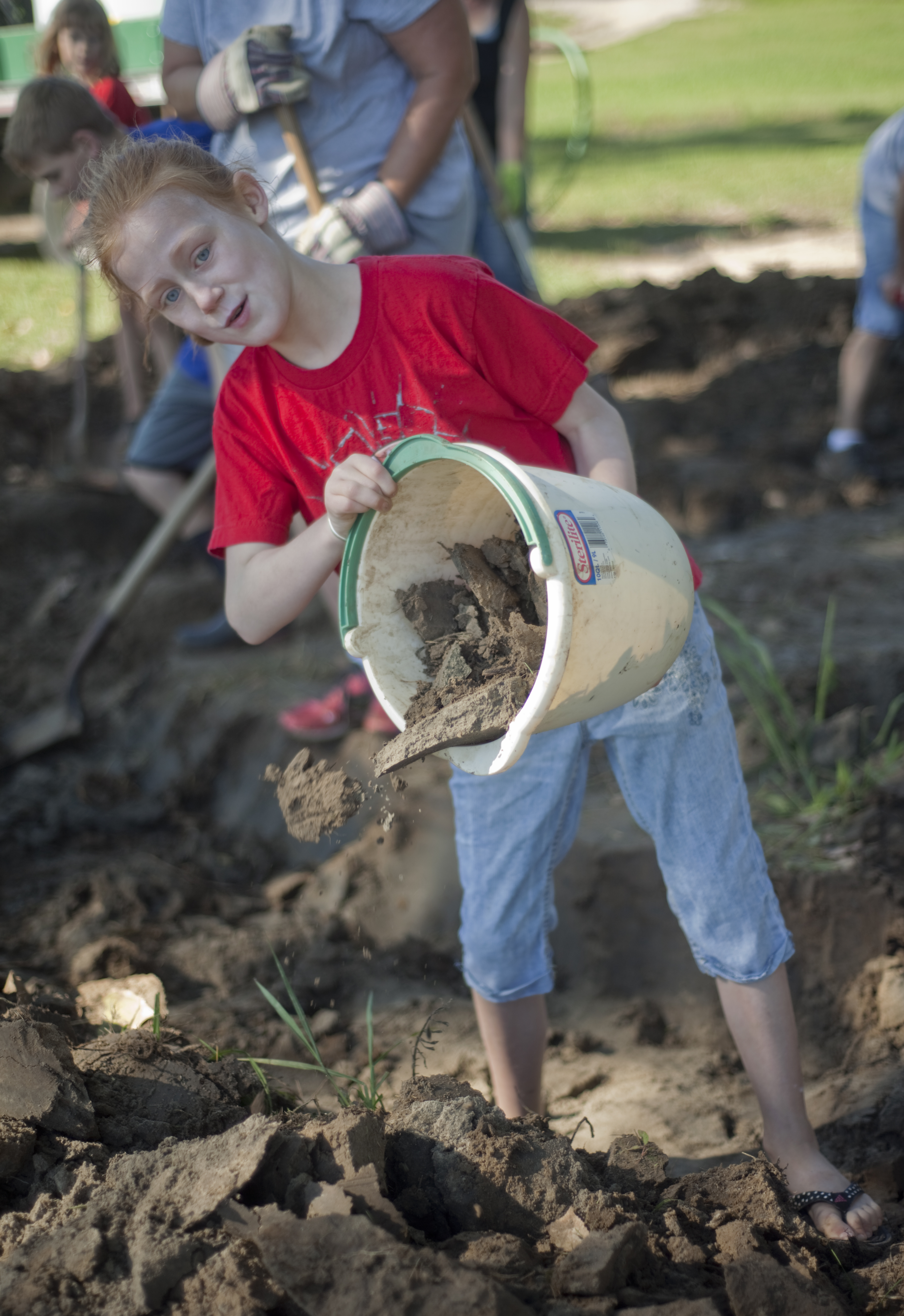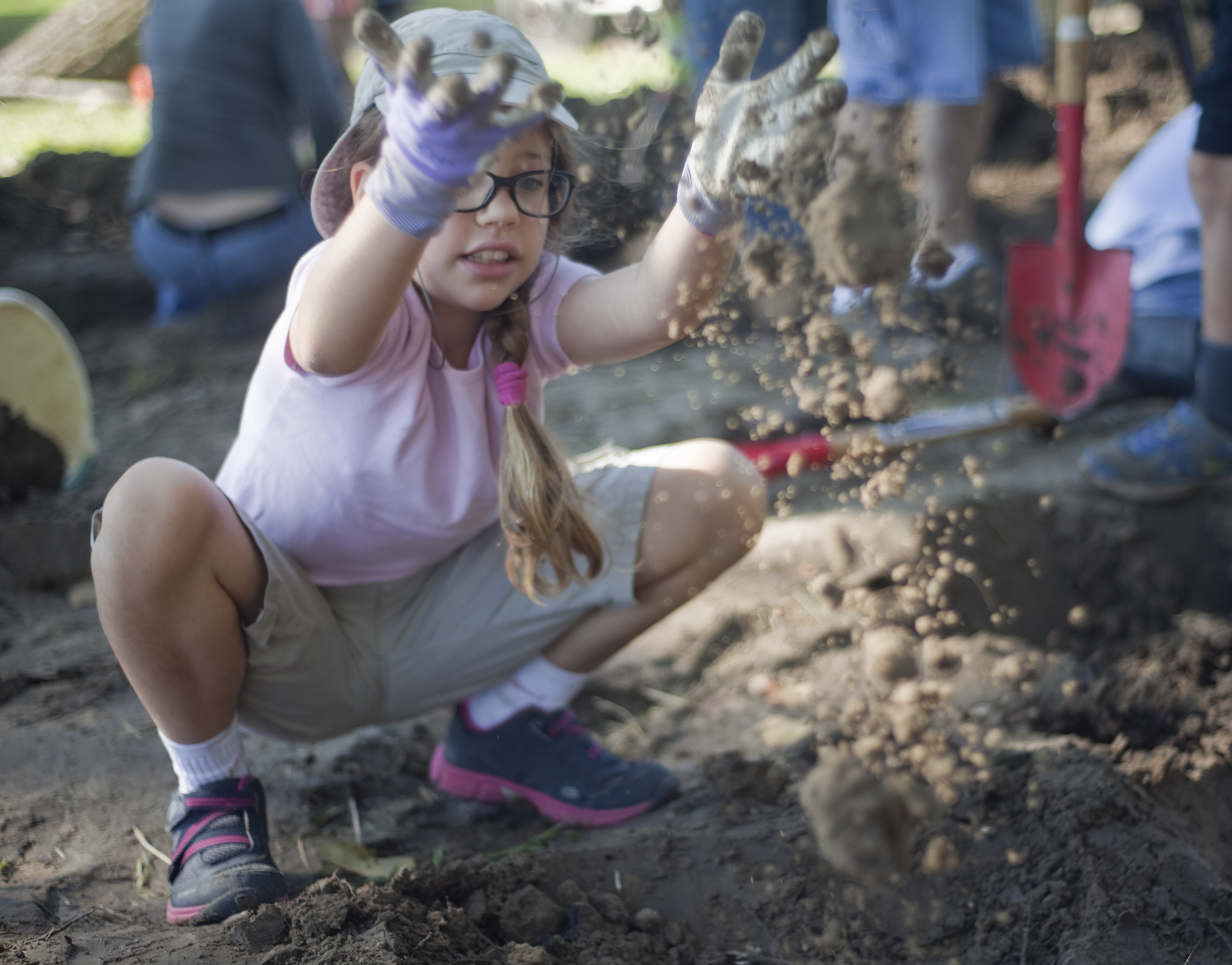Marina Profeti, 8, Lawrence, tosses dirt out of a hole as she participates in a mud fort activity on the banks of the Kansas River Tuesday, Aug. 12, 2014.