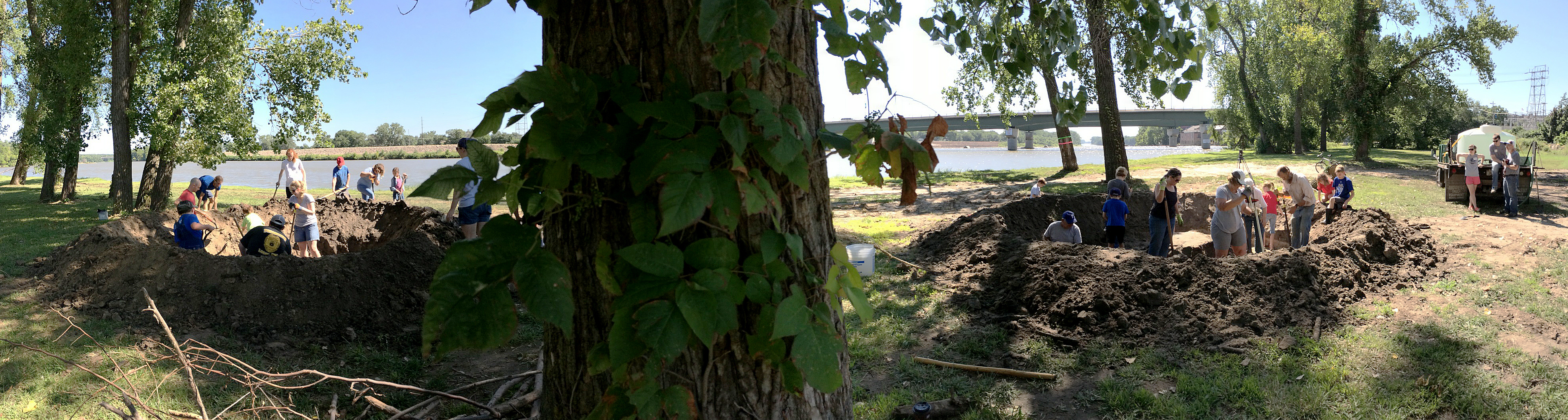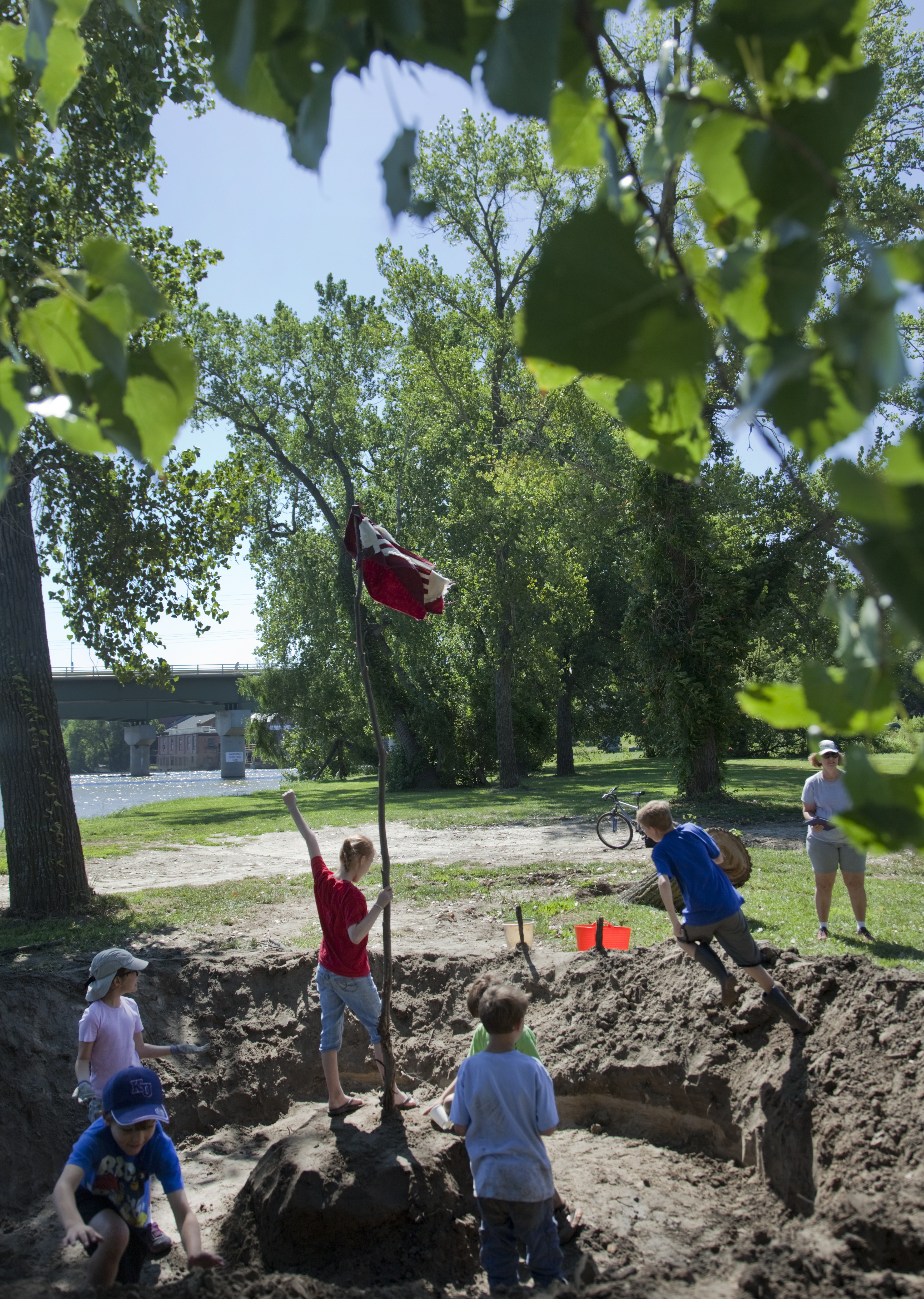 Participants in the "Kids, Let's Build A Mud Fort" dig out protective areas on the banks of the Kansas River Tuesday, Aug. 12, 2014.