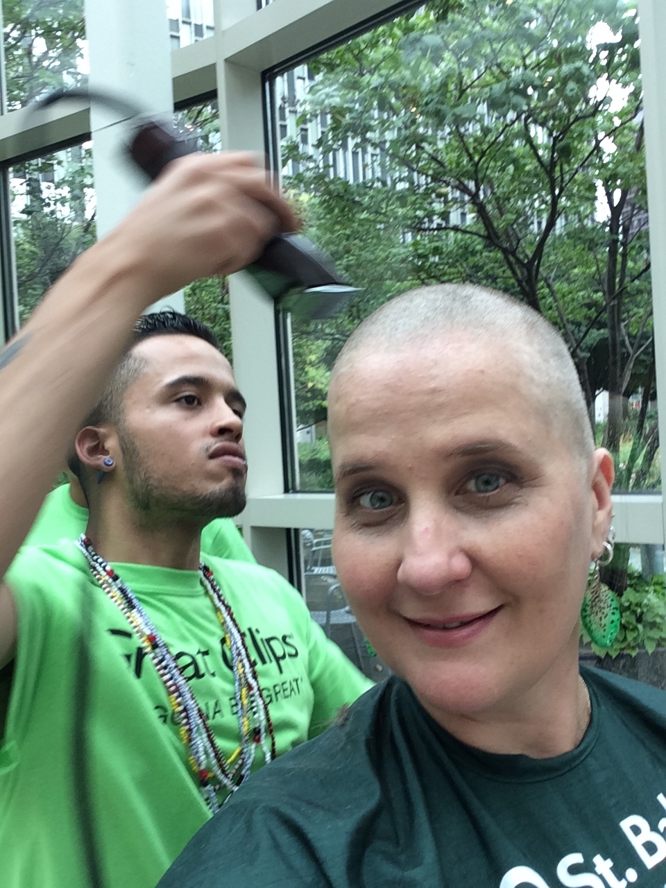 At the 46 Mommas event in Boston on Sunday, Lawrence office manager Karla Knudson got her head shaved in honor of her 17-year-old daughter, Annika, who had cancer in 2009. Knudson raised more than $2,500 for the St. Baldrick's Foundation, the largest private funding supporter of childhood cancer research in the U.S. Knudson is pictured with her head almost shaved.