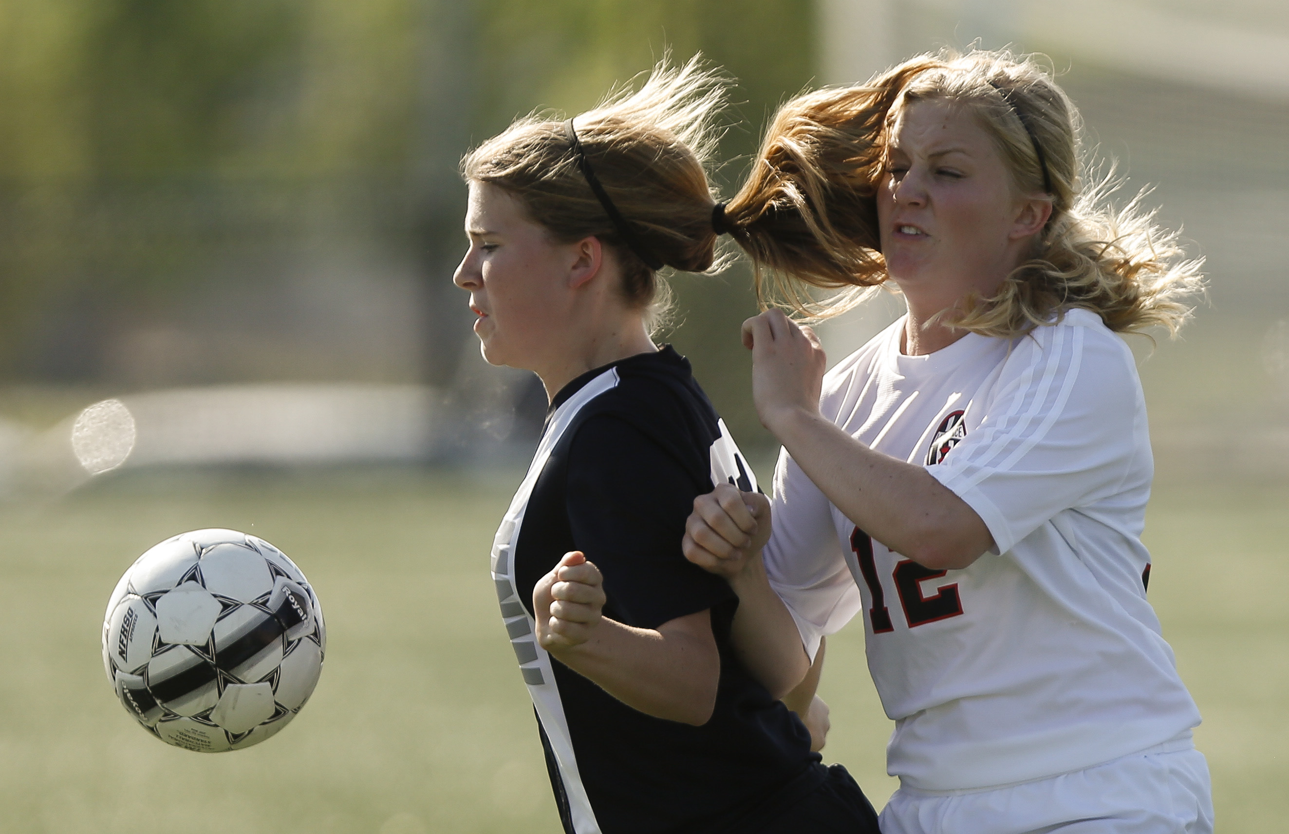 Lawrence High's Keeli Billings and Shawnee Mission Northwest's Kirsten Mehrtens collide while competing for the ball during the first half, Tuesday, May 6, 2014 at Lawrence High School.