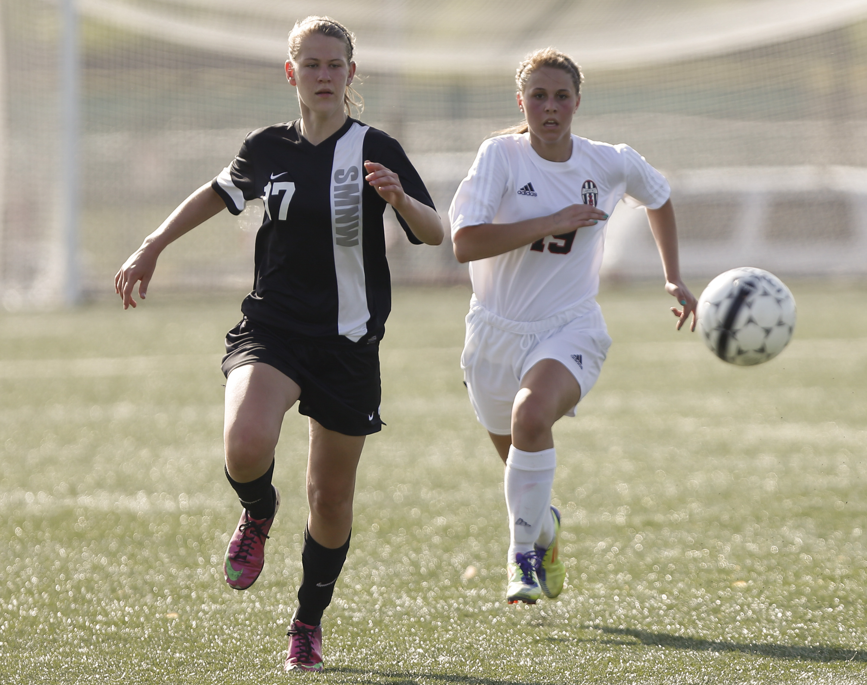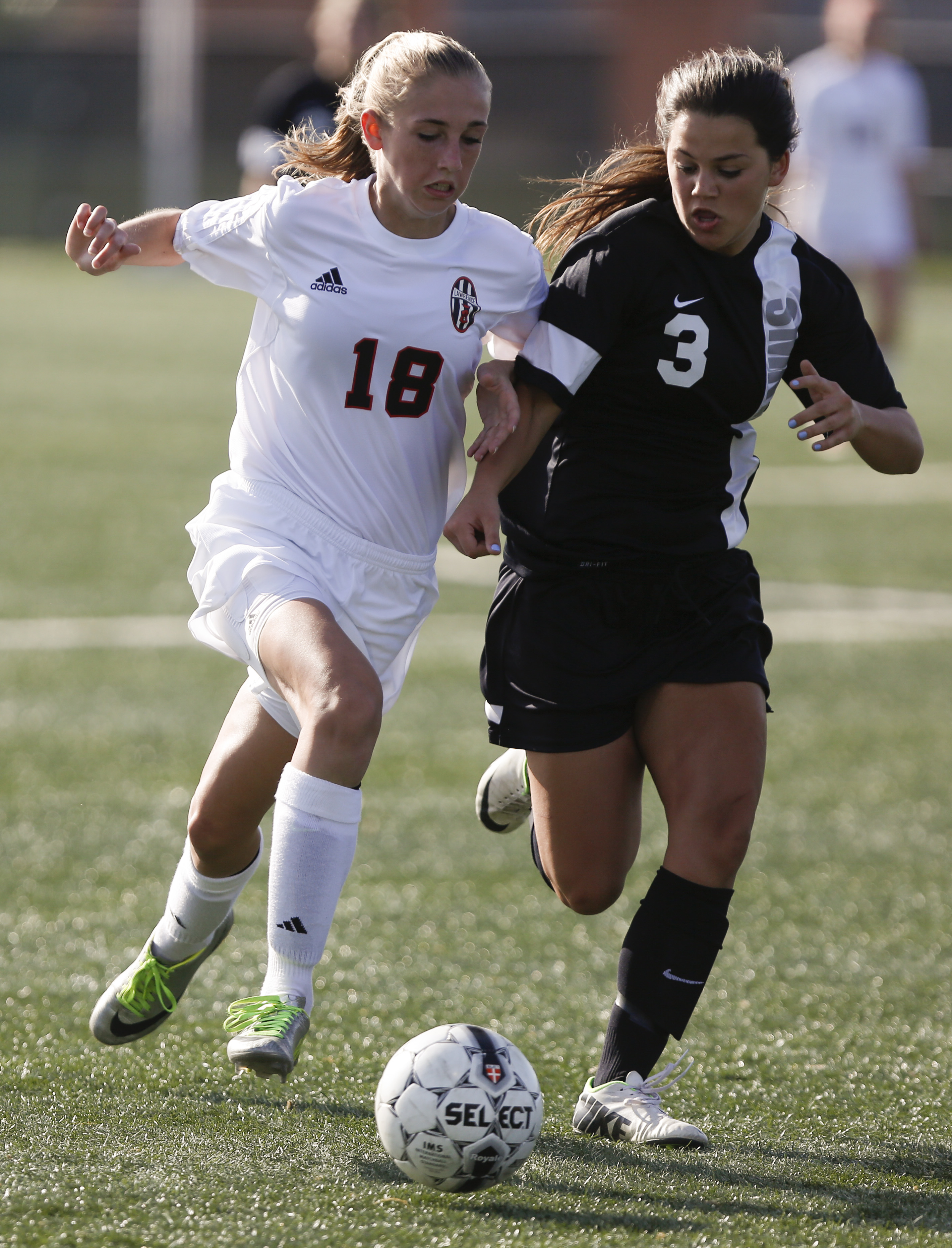 Lawrence High's Addison Campbell and Shawnee Mission Northwest's Jennifer Smith run down a ball during the first half, Tuesday, May 6, 2014 at Lawrence High School.
