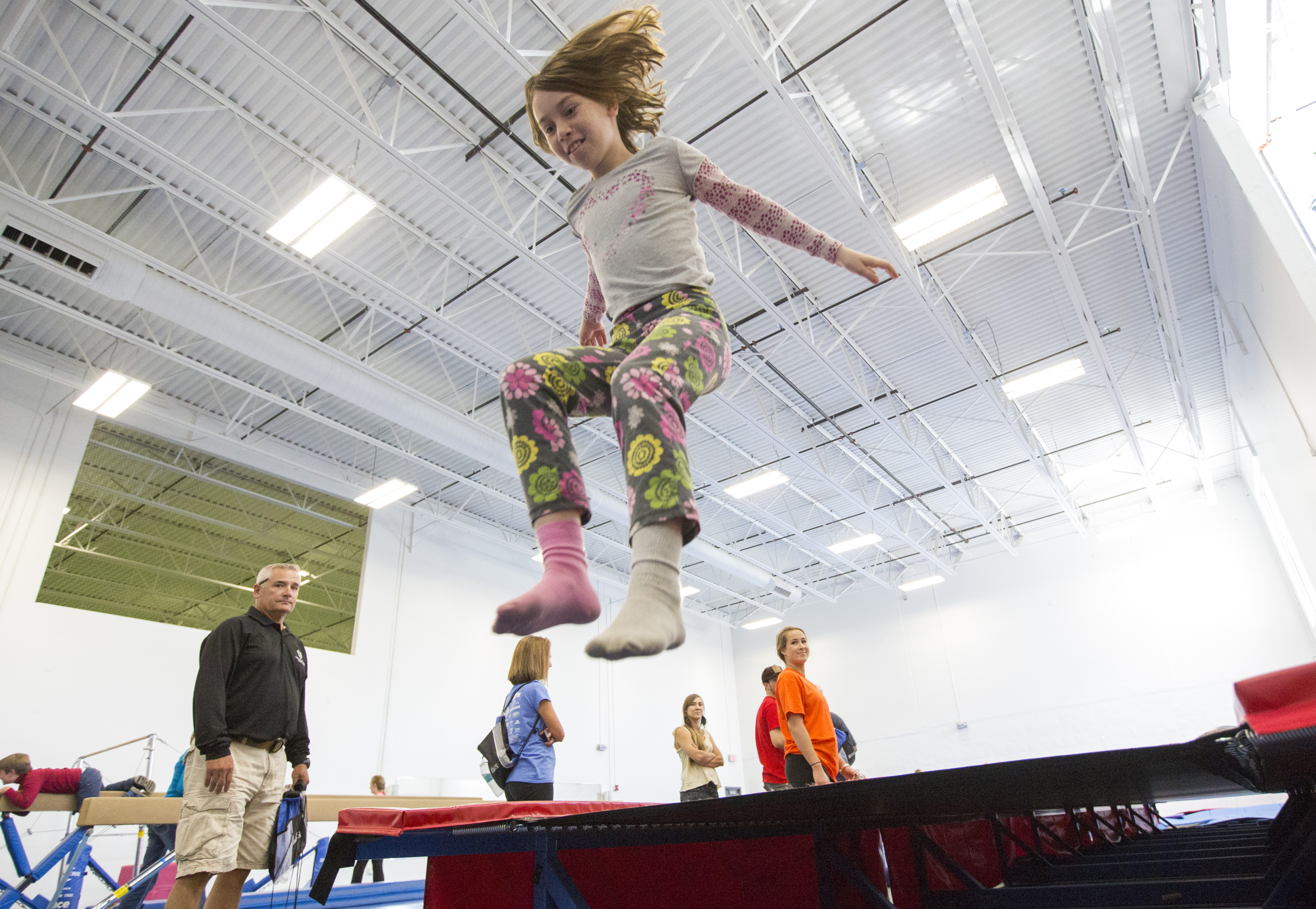 Ten-year-old Lawrence resident Emma Shockey takes a flying leap off the Tumble Trak, a trampoline like running track in the gymnastics room at the new recreational center, Sports Pavilion Lawrence, Sunday afternoon during its official grand opening. The new rec center features eight basketball courts, which can be converted into 16 volleyball courts, a weight room, a gymnastics room, exercise equipment and an indoor track.