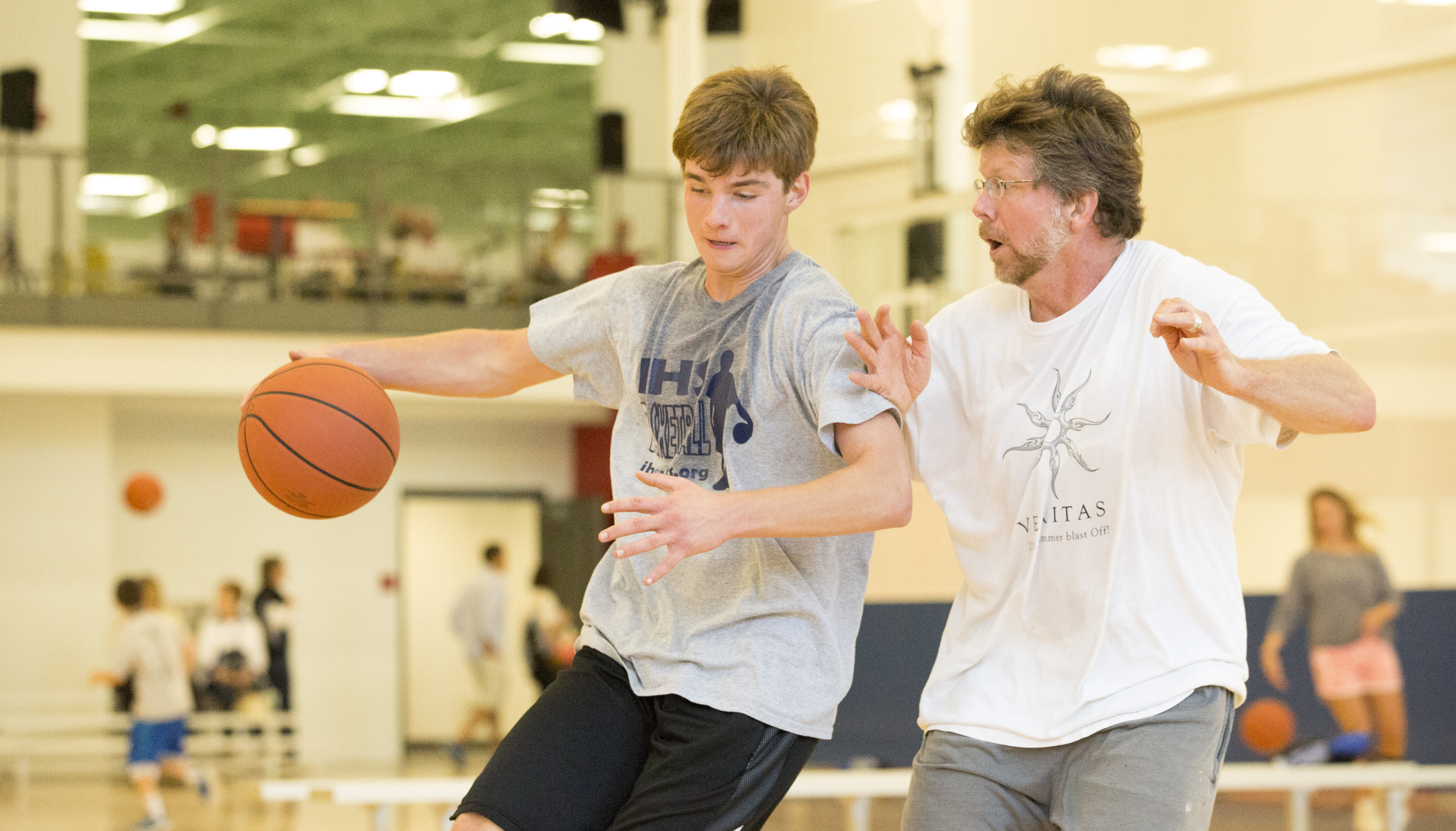 Isaiah Garrett, 16, left, challenges his father Shannon, both of Lawrence, to a game of one-on-one as they try out the basketball courts at the new recreational center, Sports Pavilion Lawrence, Sunday afternoon during its official grand opening. The new rec center features eight basketball courts, which can be converted into 16 volleyball courts, a weight room, a gymnastics room, exercise equipment and an indoor track.