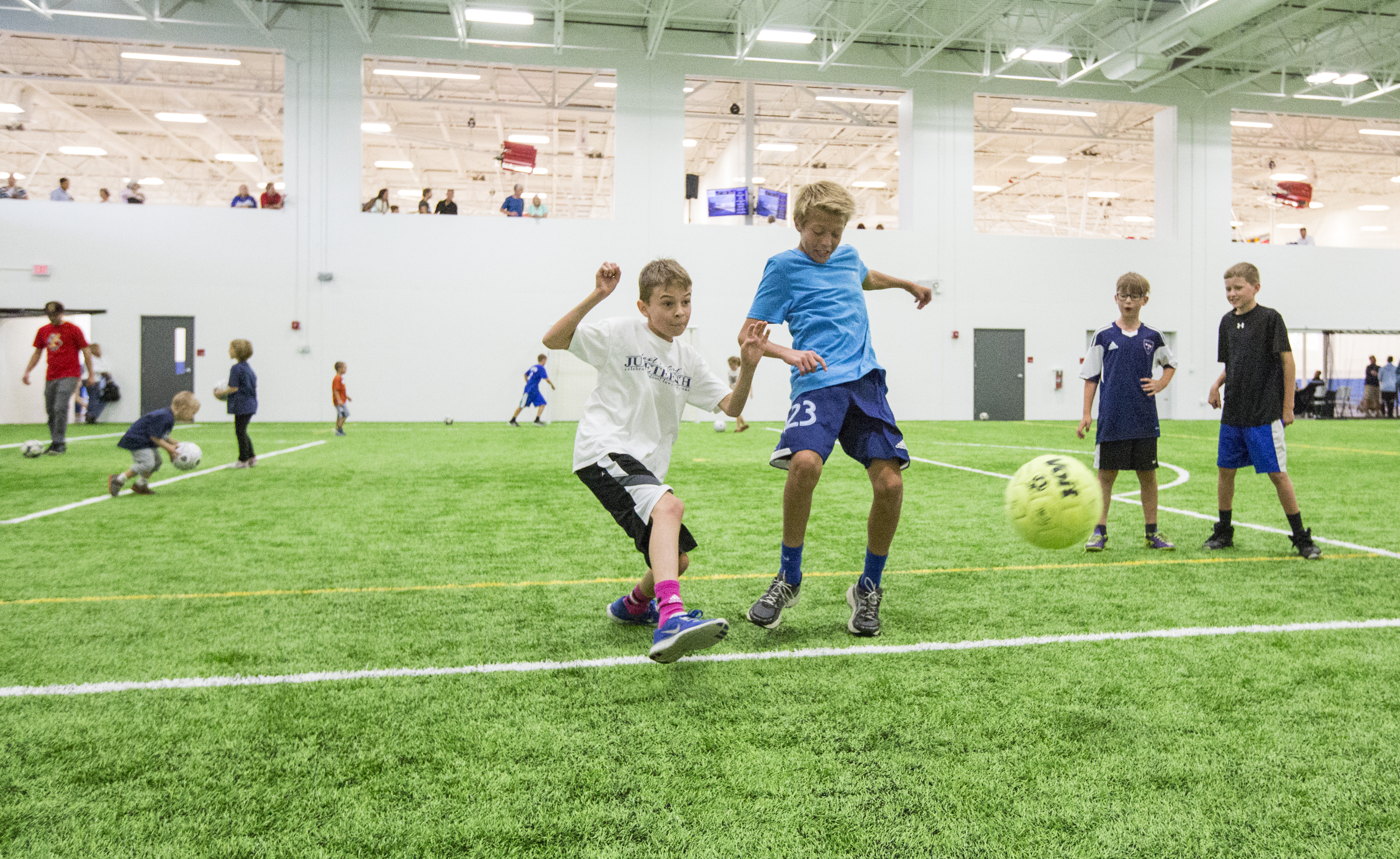 Lawrence residents Hunter Leonard, 12, left, and Jacob Appleman, 12, try out the indoor soccer field during the grand opening of the new Sports Pavilion Lawrence, Sunday, Oct. 5, 2014.
