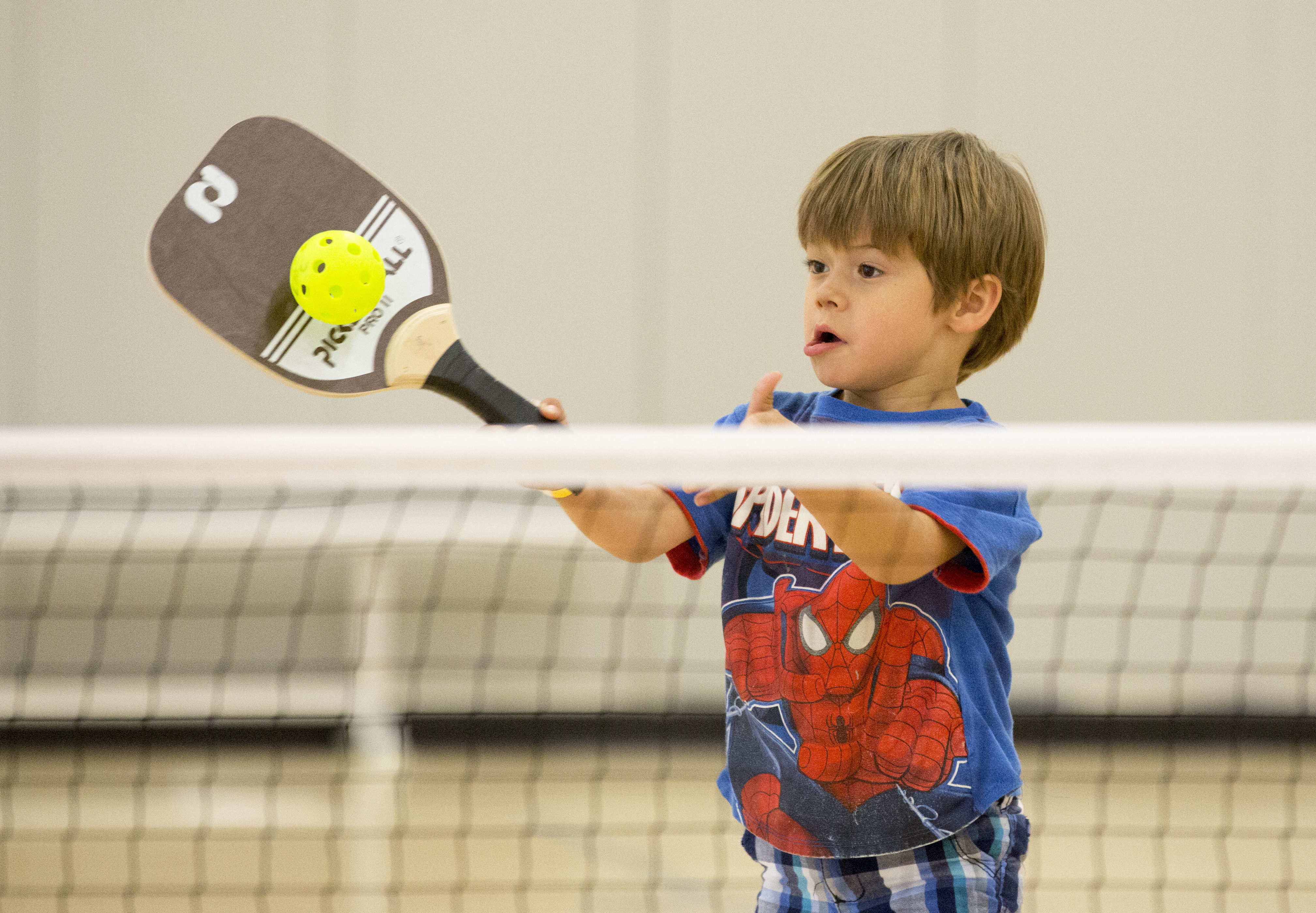 Five-year-old Jason Wika, of Lawrence, tries his hand at pickle ball at the new Sports Pavilion Lawrence during its grand opening, Sunday, Oct. 5, 2014.