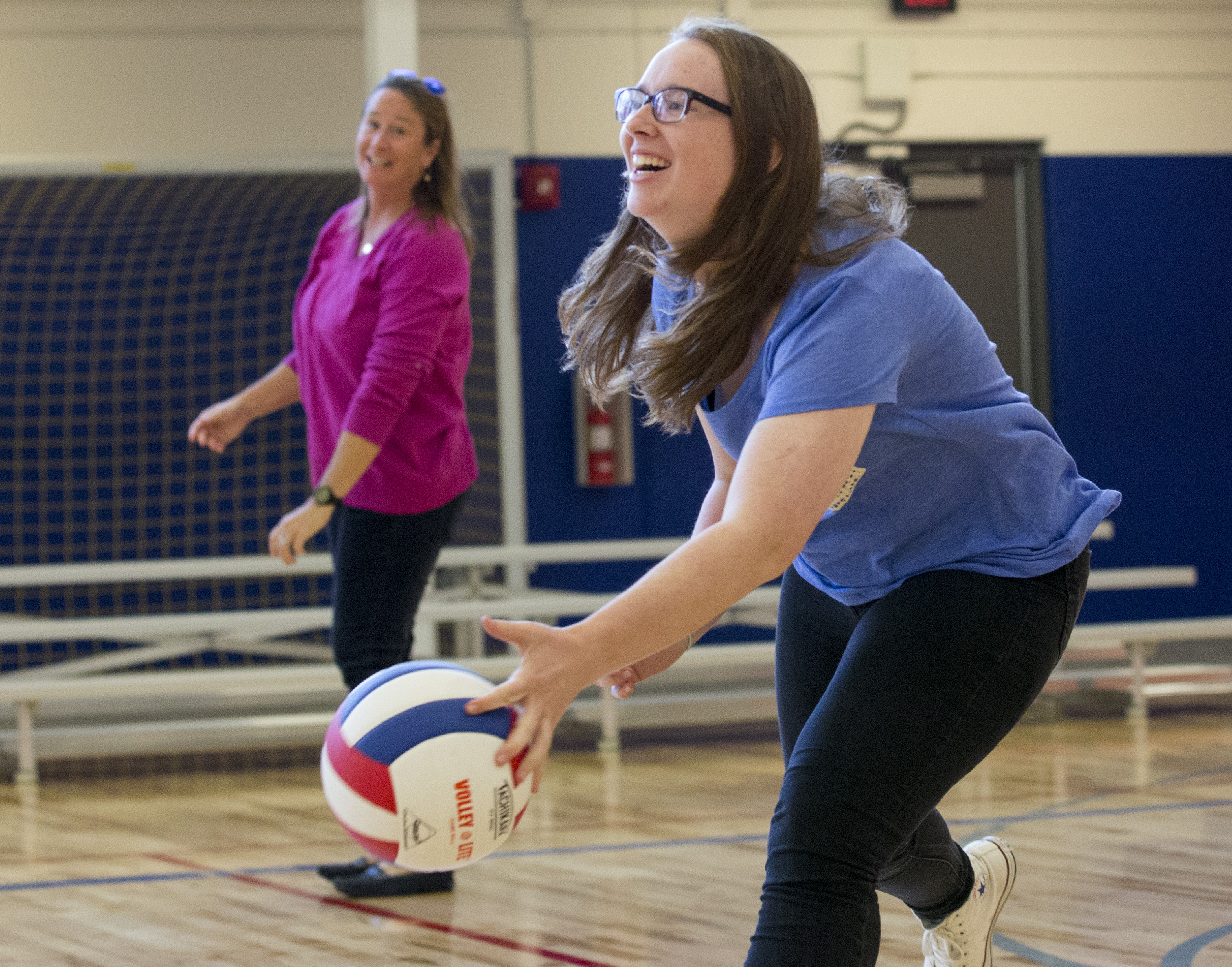 Hutton Fritzel, of Lawrence, chases down a volleyball at the new Sports Pavilion Lawrence during the facility's grand opening, Sunday, Oct. 5, 2014.