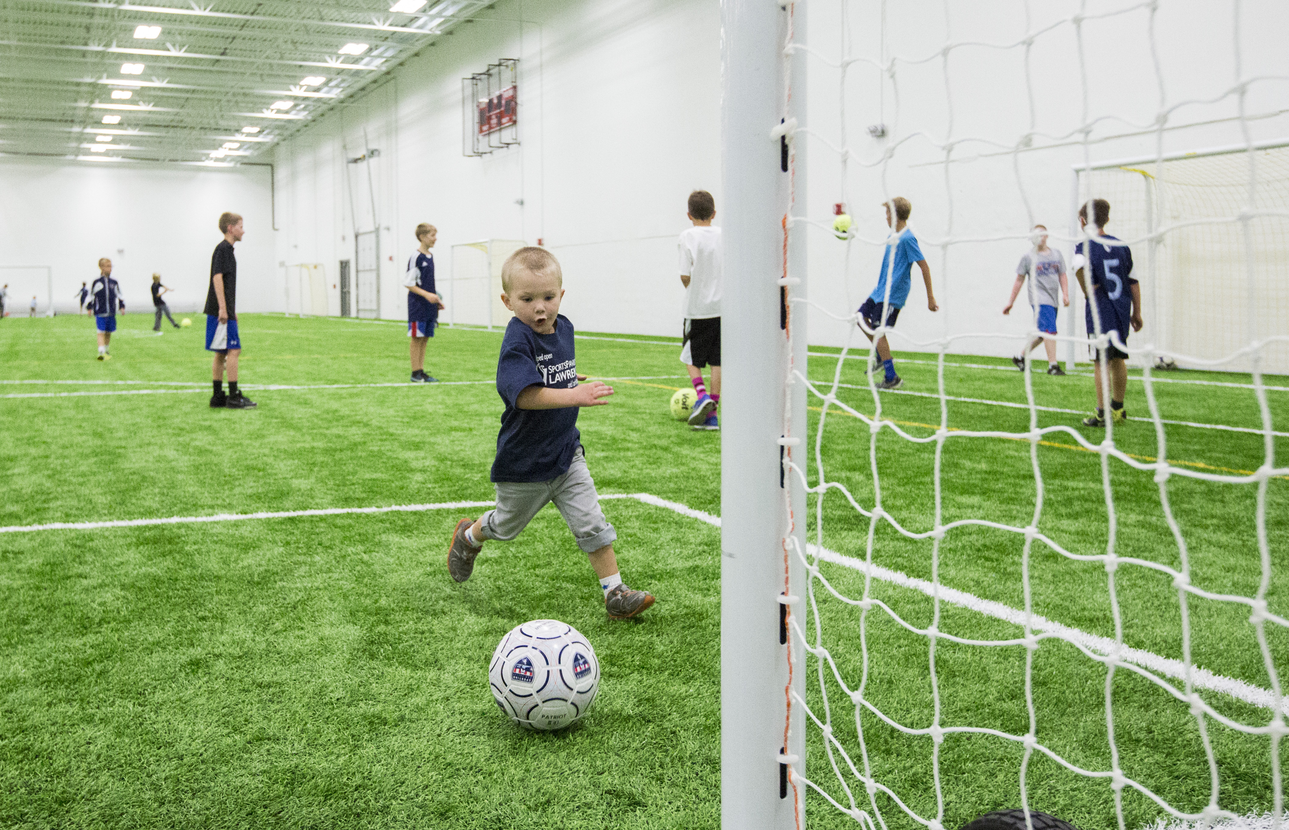 Three-year-old Oliver Norris, of Lawrence, tries out the indoor soccer field at the new Sports Pavilion Lawrence during the facility's grand opening, Sunday, Oct. 5, 2014.