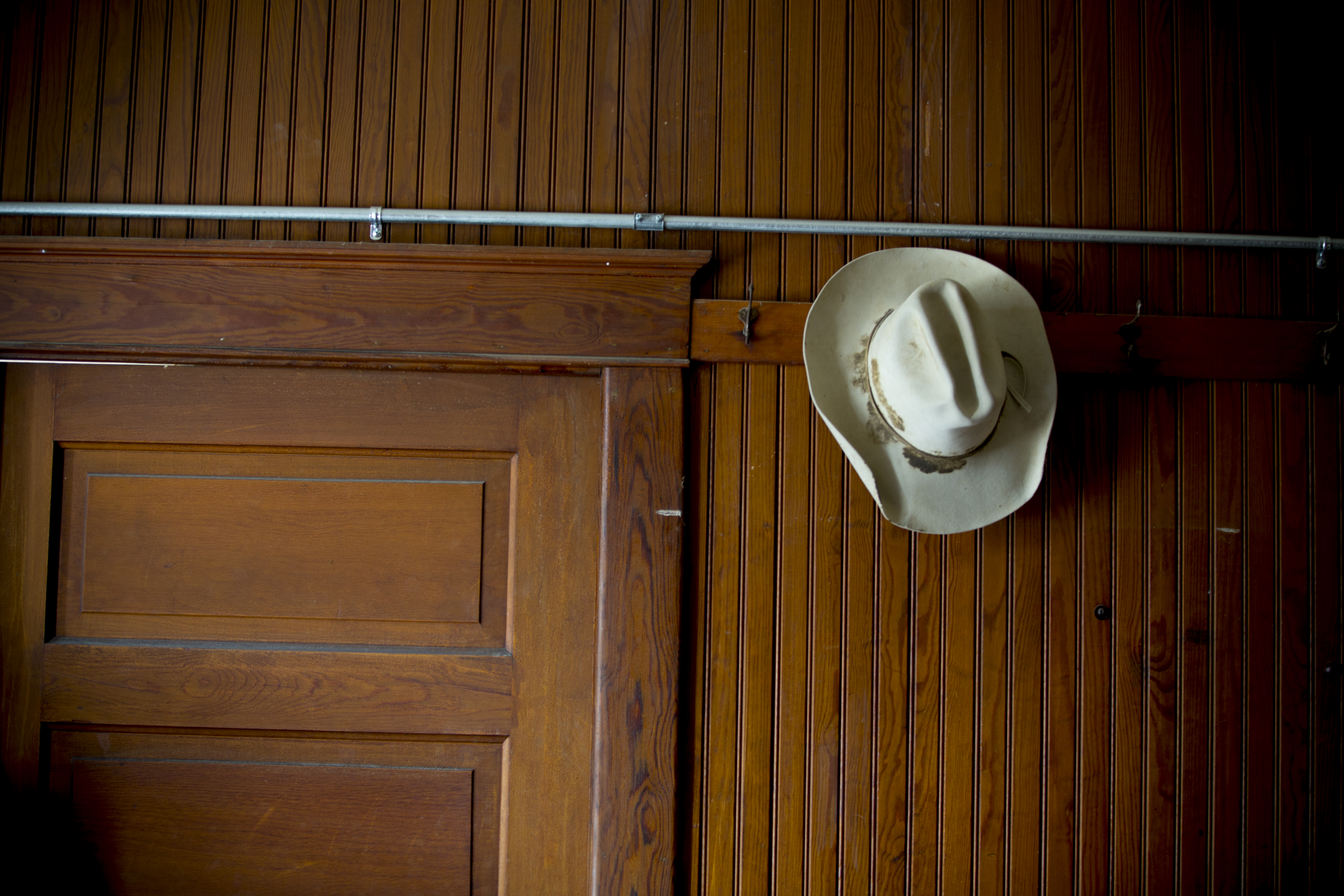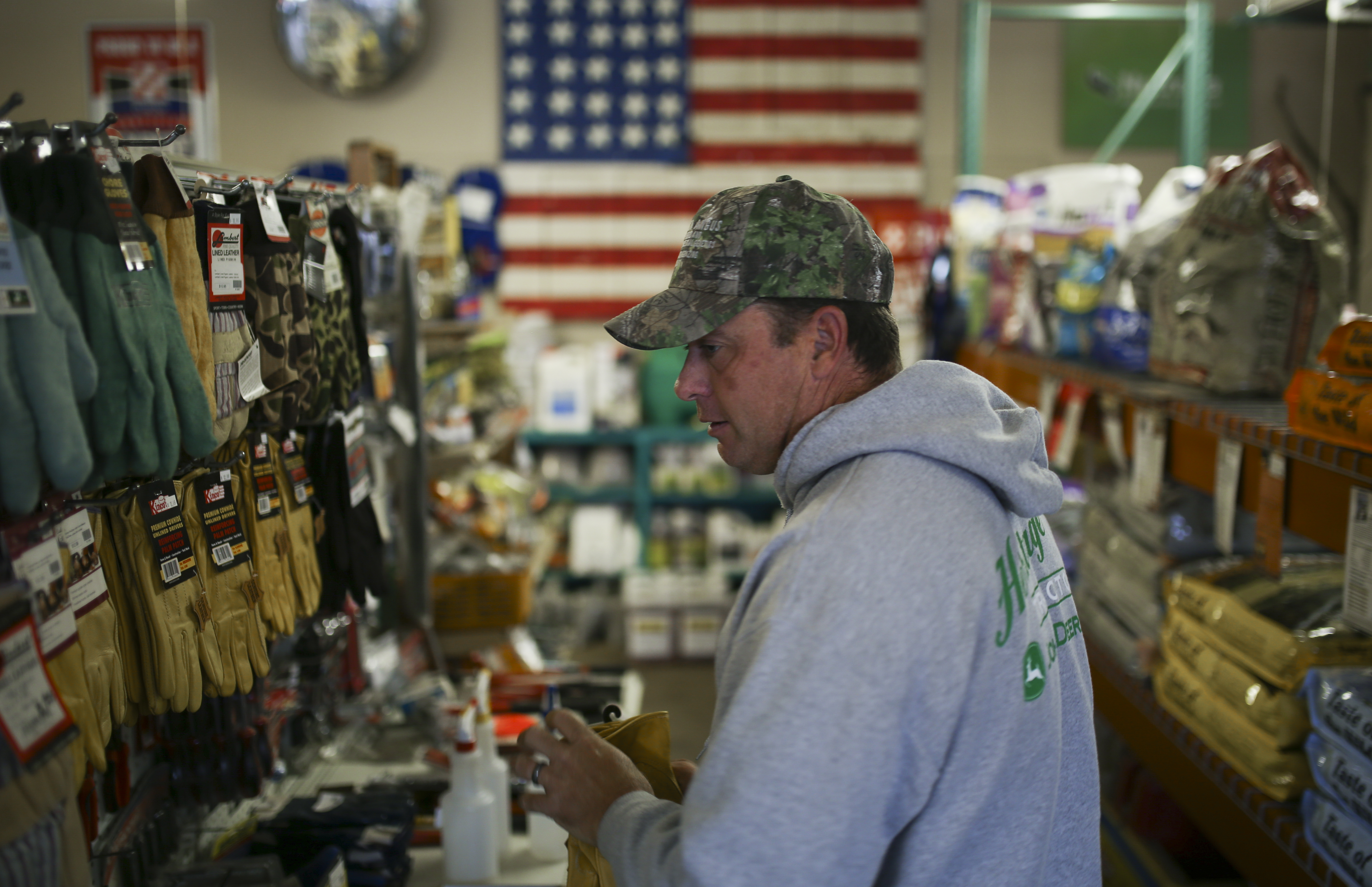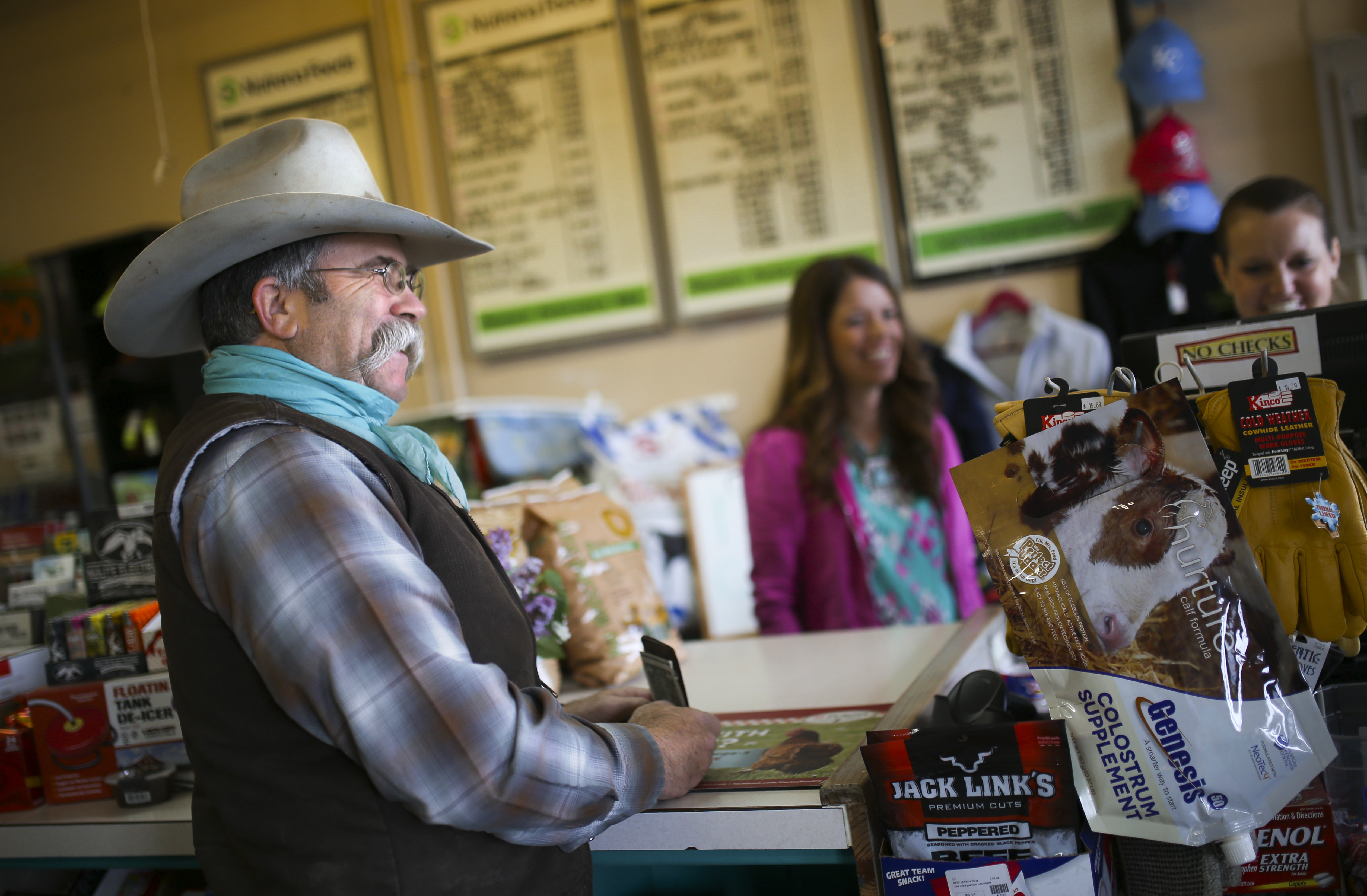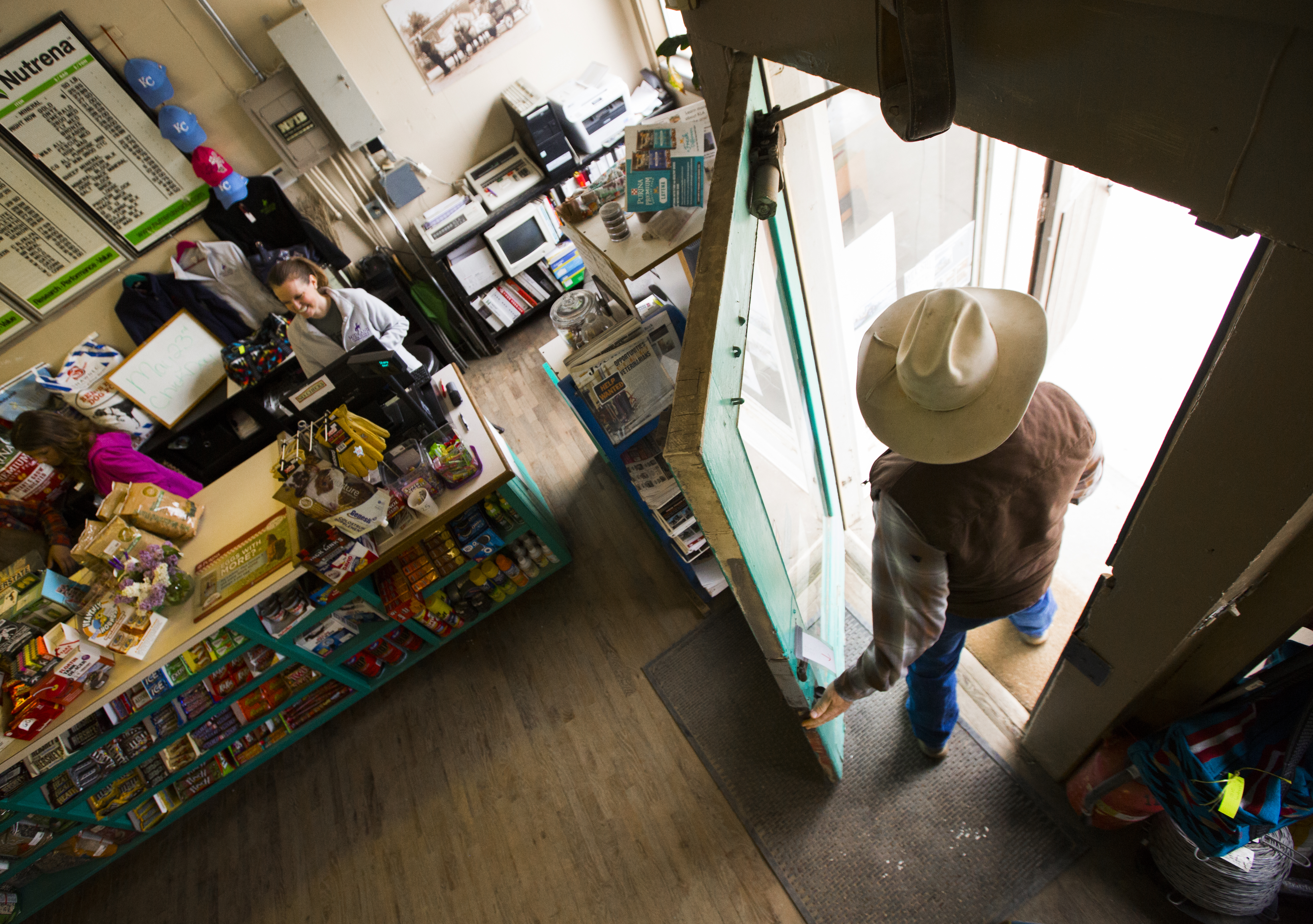 Kirk Sours, a cattleman from Tonganoxie and regular at the Midland Farm Store, leaves the business after dropping in on Wednesday morning, April 15, 2015. Owner Jill Tregemba says that what often fascinates her new customers is that the store has a feel that throws them back in time.
