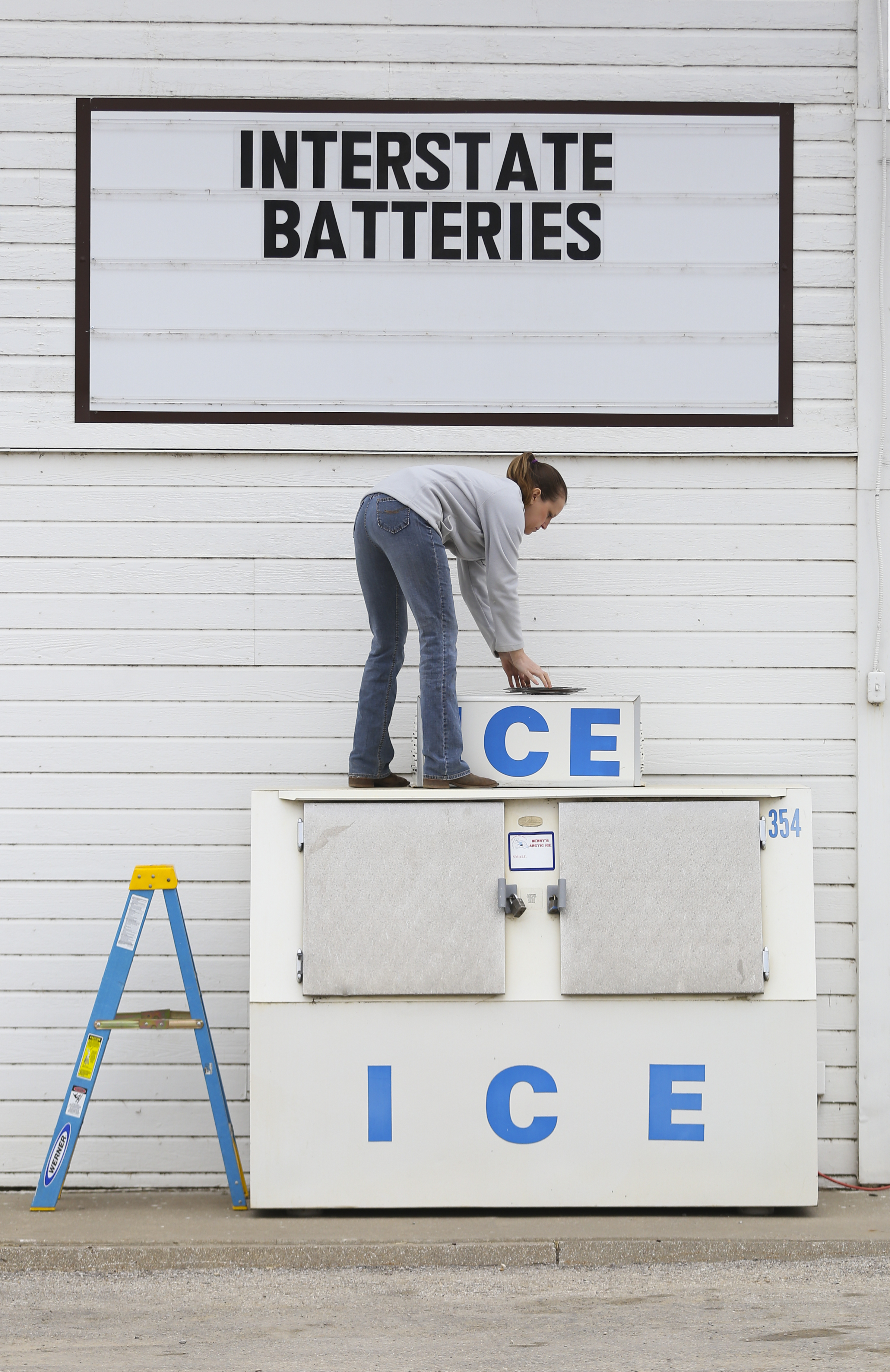 Midland employee Mindy Rousselo stands on top of the ice cooler outside to change the store's sign to promote battery sales on Wednesday, April 15, 2015.
