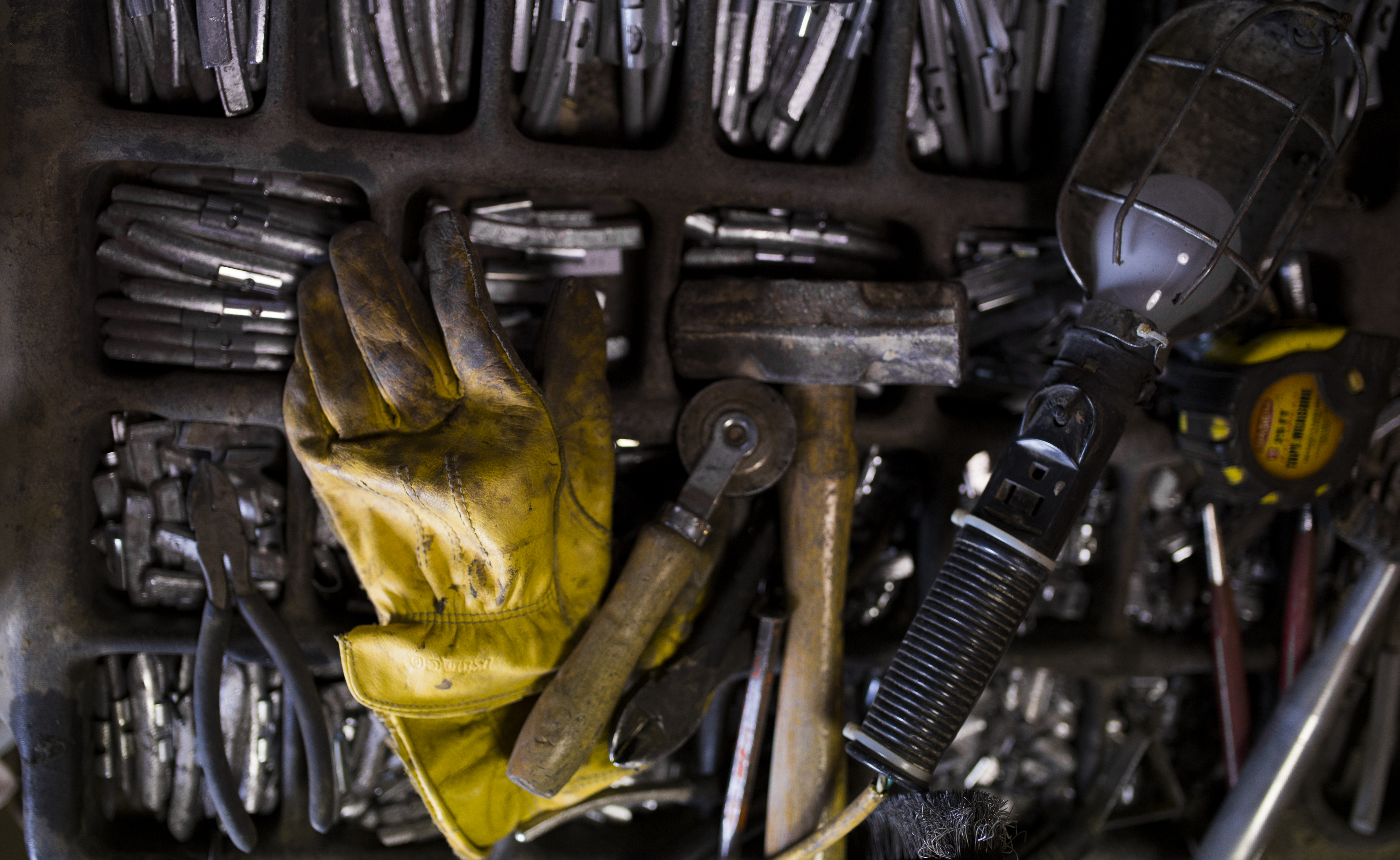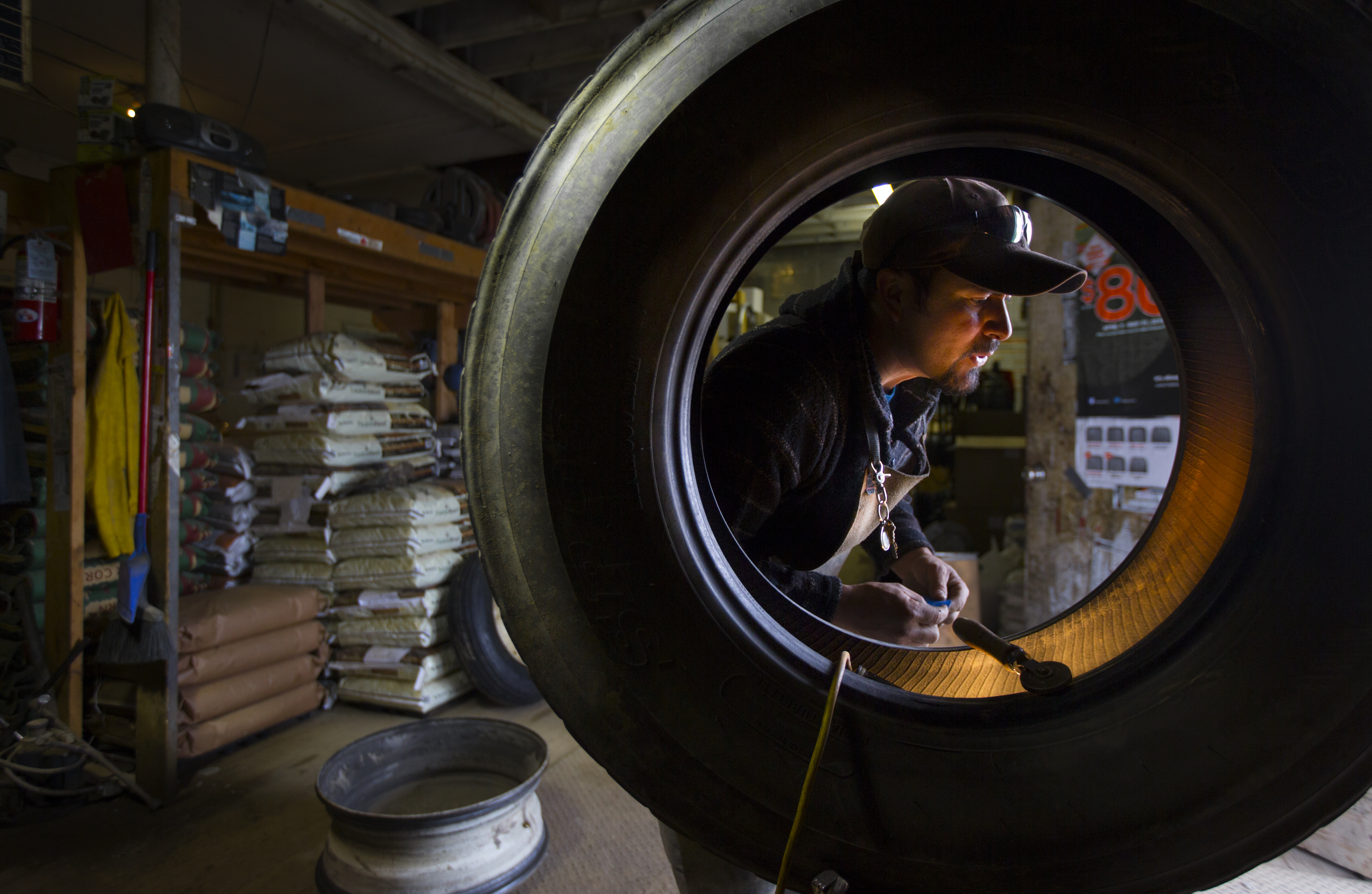Midland Farm Store tire shop worker Bruce Romero looks to plug a hole inside a tire, on Monday, April 13, 2015.