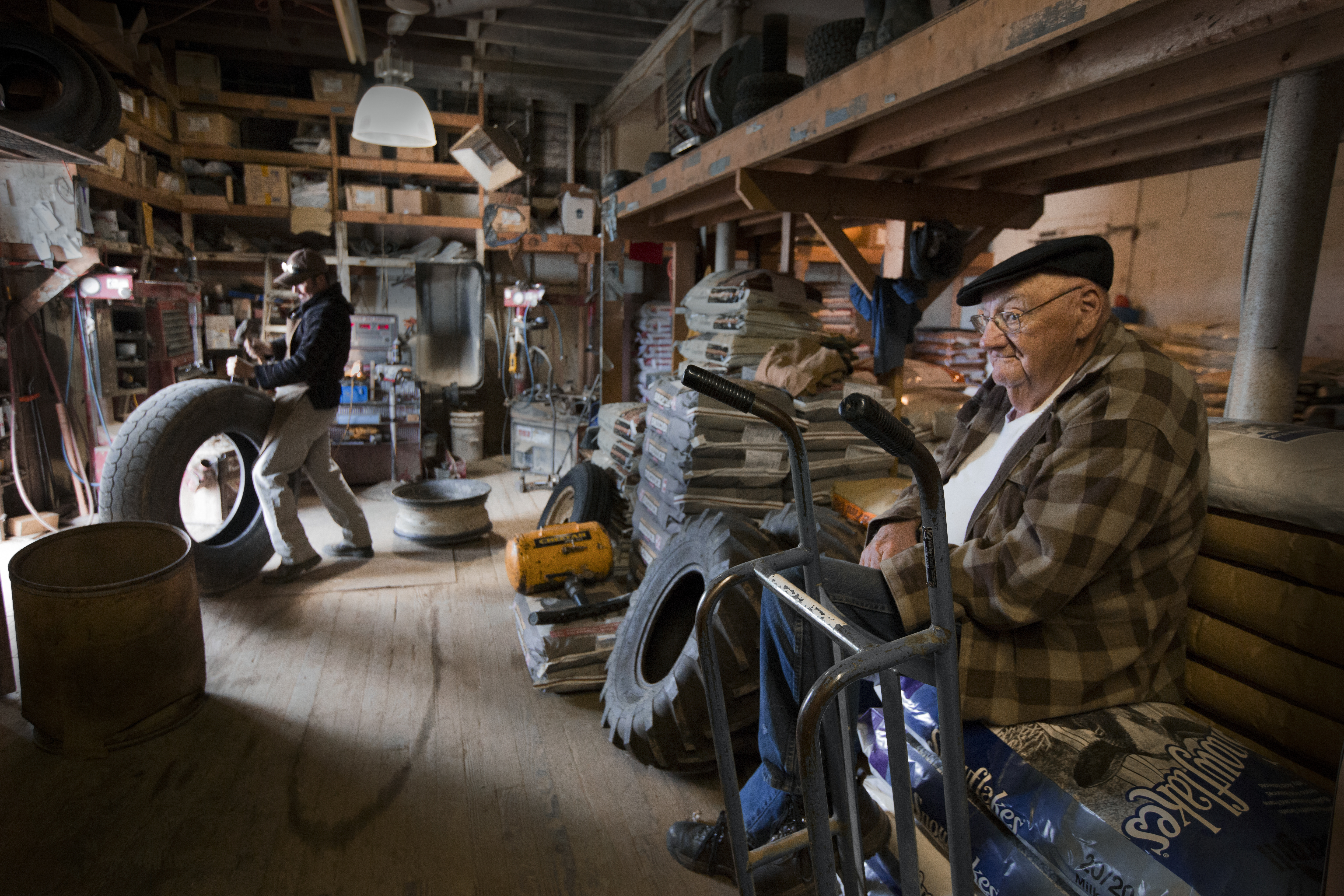 Eighty-year-old Herman Edwards, a Jefferson County resident, sits on a bag of feed as he waits for a tire to be repaired by Midland Farm Store tire shop employee Bruce Romero on Monday, April 13, 2015 at the Midland Farm Store. Store owner Jill Tregemba explained that her older customers often appreciate the nostalgia that the store creates.
