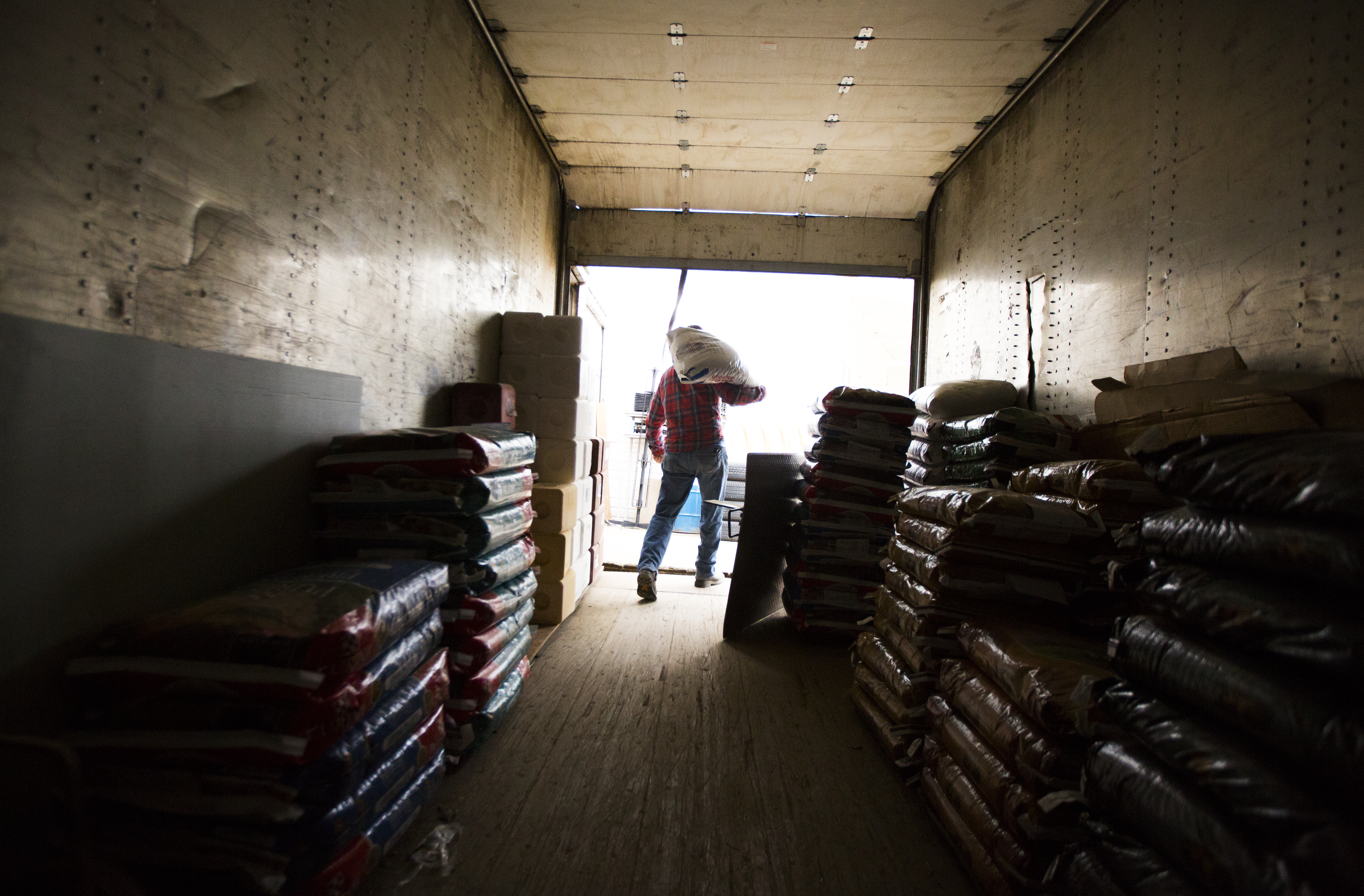Midland Farm Store employee Bruce Romero carries a bag of feed from the store supply in semi trailers on Wednesday, April 15, 2015 at the Midland Farm Store.