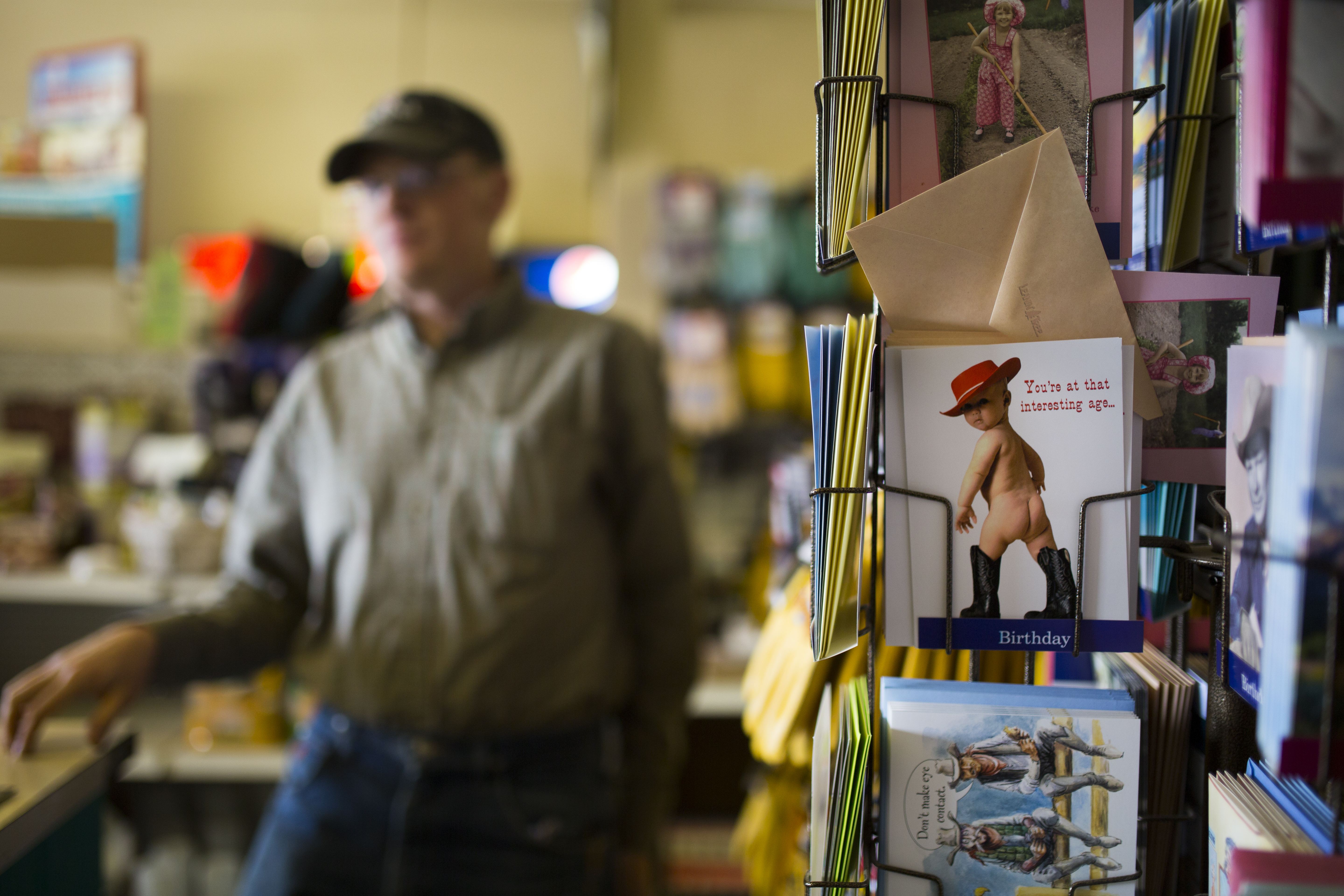 A young cowboy glances over his shoulder from a stack of western-themed cards on Monday, April 13, 2015 at the Midland Farm Store.