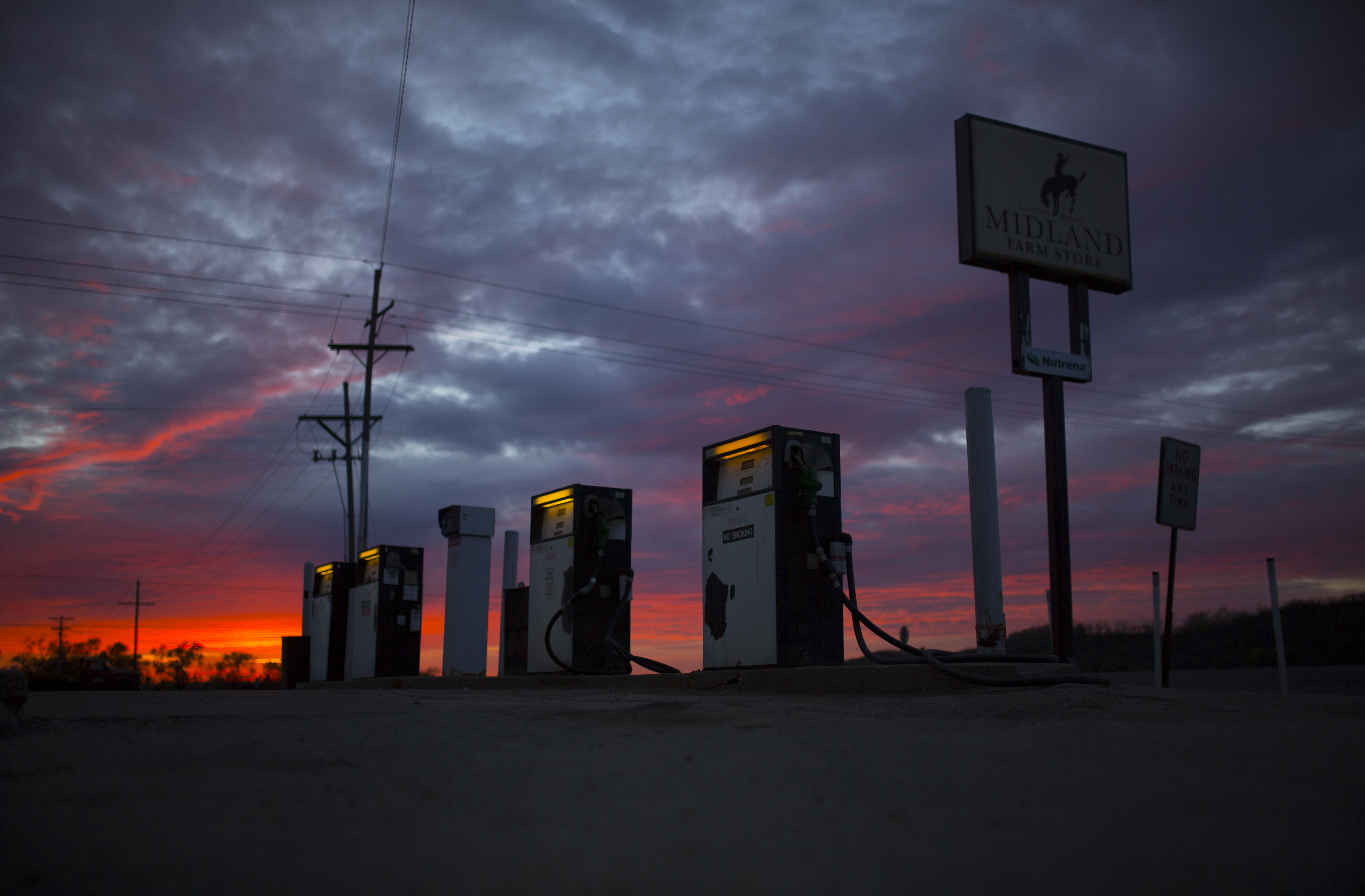 A Kansas sunset goes down behind a row of diesel pumps outside the Midland Farm Store on Tuesday, April 14, 2015.