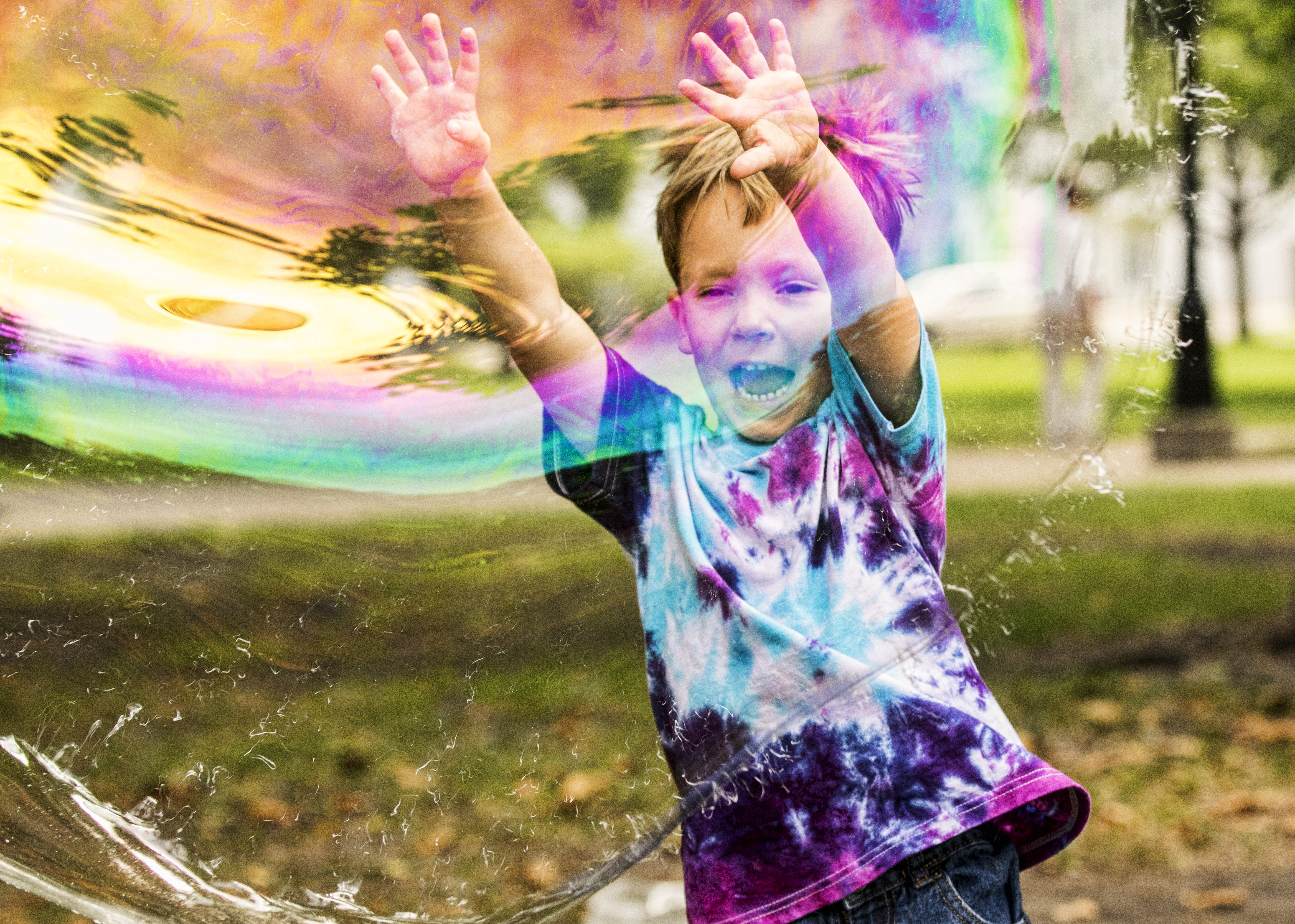 Four-year-old Benny Hess, of Lawrence, bursts a large bubble by running through it at the 2015 Fall Arts and Crafts Festival on Sunday in South Park in downtown Lawrence. The festival featured music, food, giant bubbles, mini horse rides and plenty of arts and crafts for everyone.