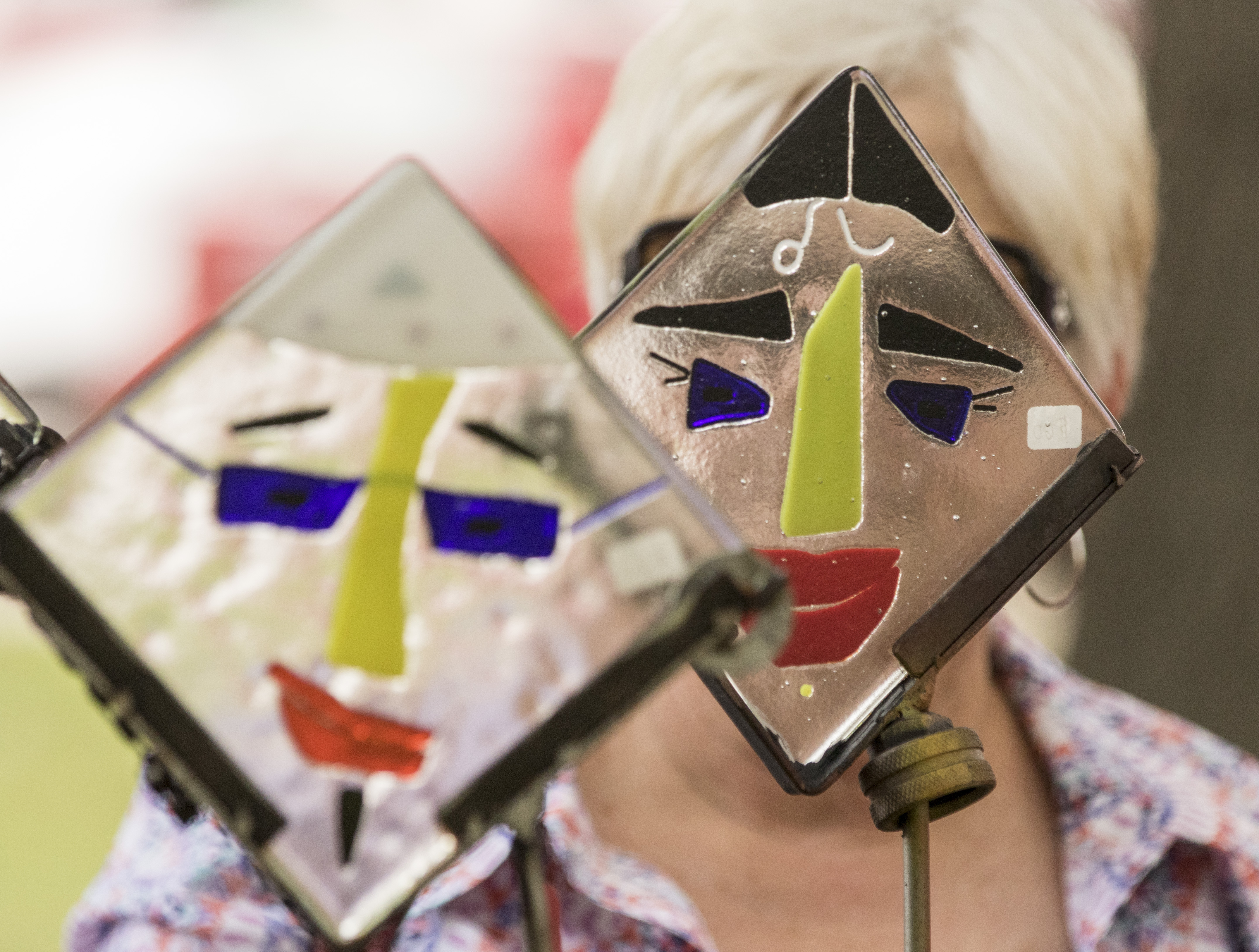 Toni Dudley, of Lawrence, browses through faces constructed out of glass that were created by Beth Tucker, of Leavenworth, at the 2015 Fall Arts and Crafts Festival on Sunday in South Park in downtown Lawrence. The festival featured music, food, giant bubbles, mini horse rides and, of course, plenty of arts and crafts for everyone.