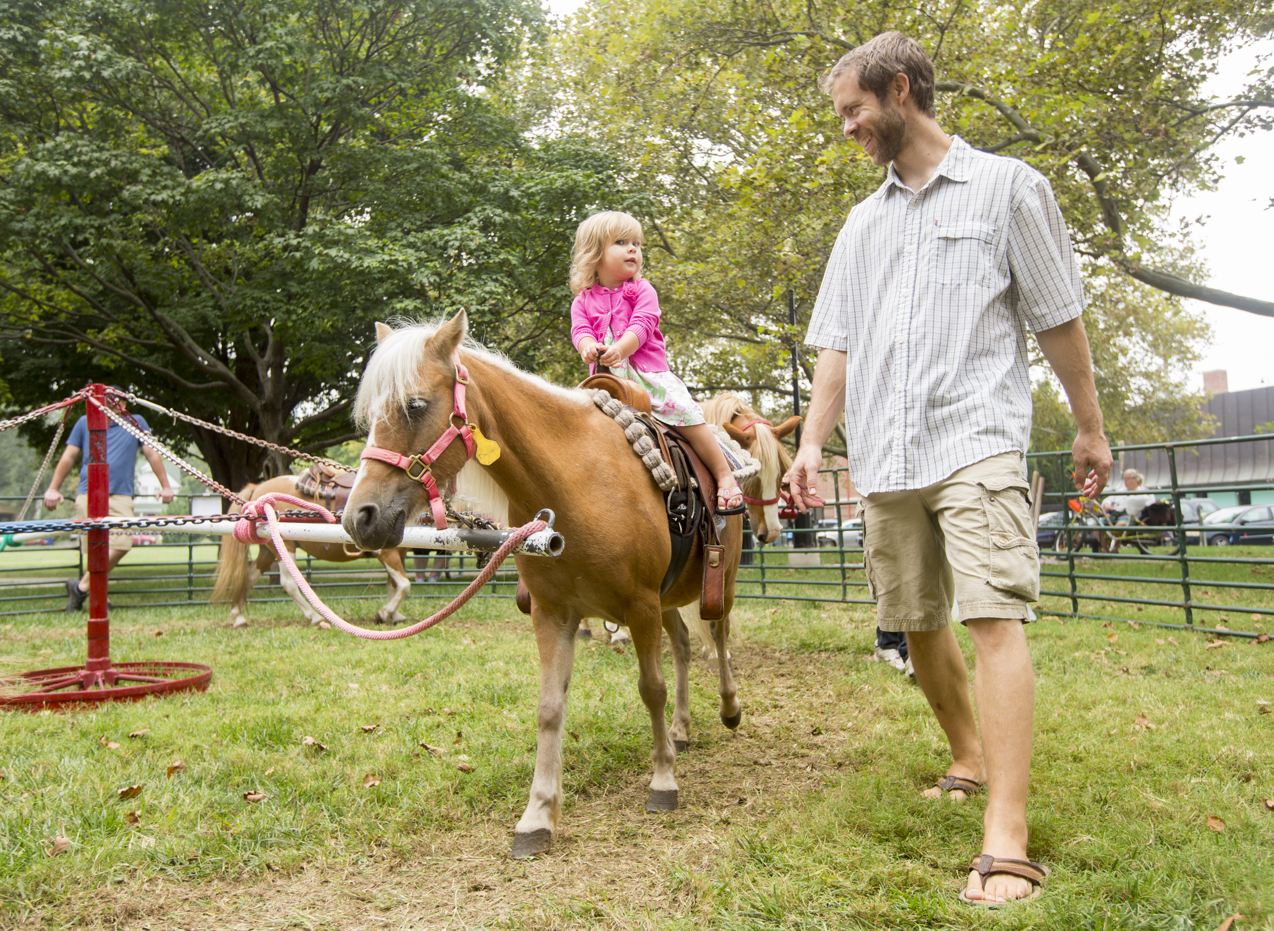 Jacob Dietrich walks alongside his daughter Ella, 2, both of Lawrence, as she rides a miniature horse at the 2015 Fall Arts and Crafts Festival on Sunday in South Park in downtown Lawrence. The festival featured music, food, giant bubbles, mini horse rides and, of course, plenty of arts and crafts for everyone.