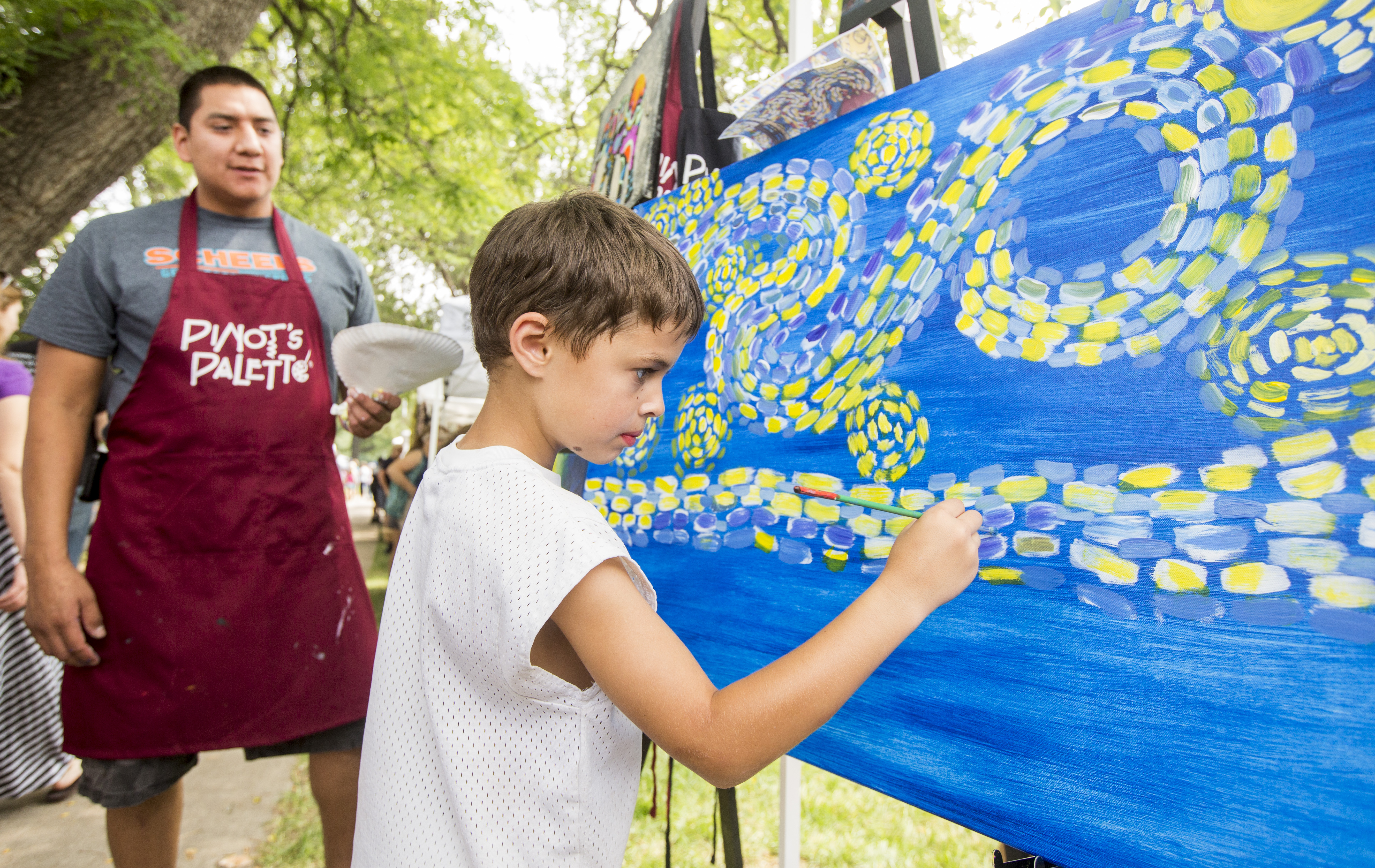 Under the supervision of Ramone Addington, Nathan White, 8, of Olathe, helps paint a piece titled KU Starry Night at a booth by Pinot's Palette at the 2015 Fall Arts and Crafts Festival on Sunday in South Park in downtown Lawrence. When finished, the painting will be sold in a silent auction for charity. The festival featured music, food, giant bubbles, mini horse rides and, of course, plenty of arts and crafts for everyone.
