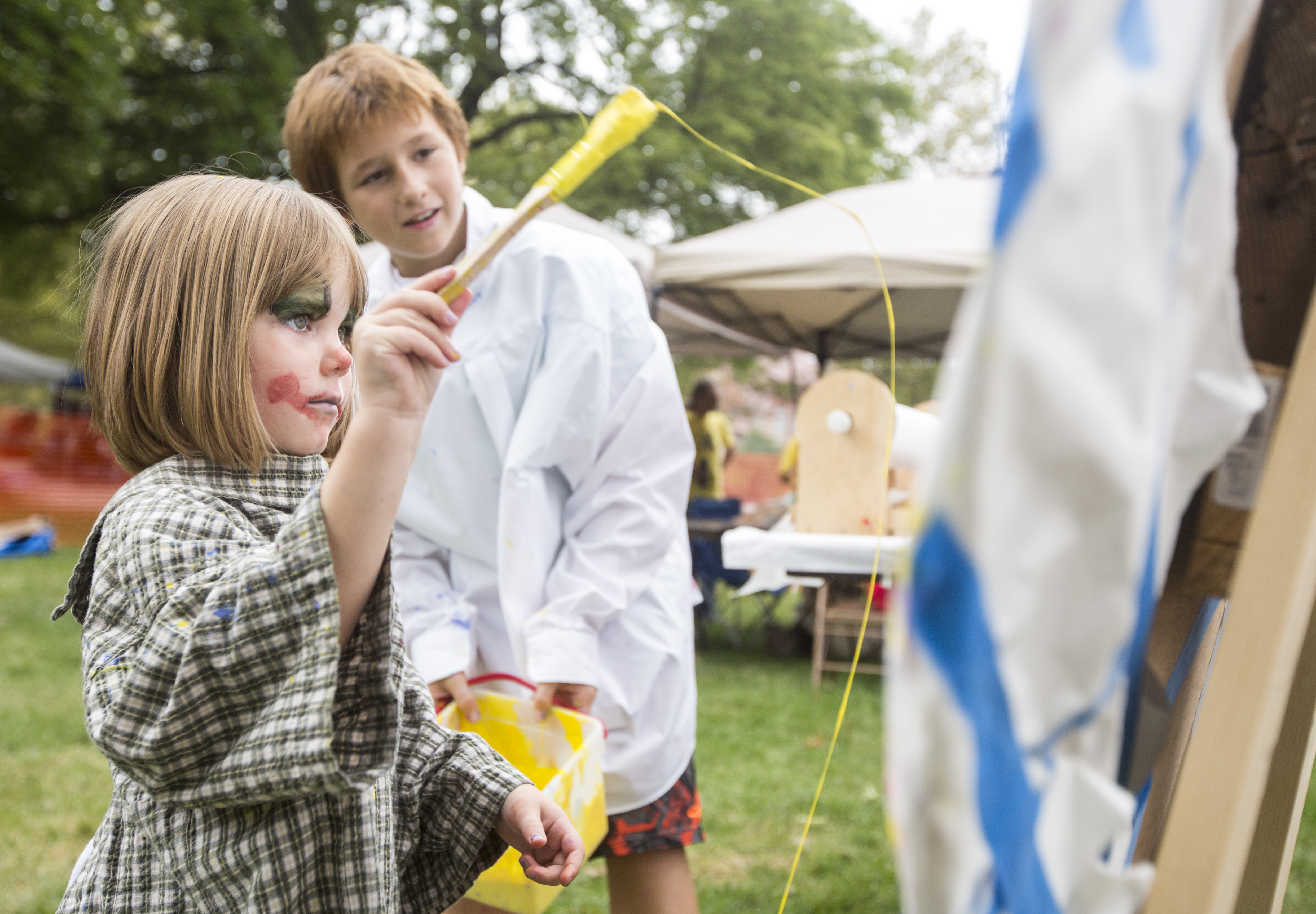 Three-year-old Brenyn Roberts, of Lawrence, flips yellow paint at a spinning canvas as Cade Crady, 11, of Eudora, watches at the 2015 Fall Arts and Crafts Festival on Sunday in South Park in downtown Lawrence. The festival featured music, food, giant bubbles, mini horse rides and, of course, plenty of arts and crafts for everyone.