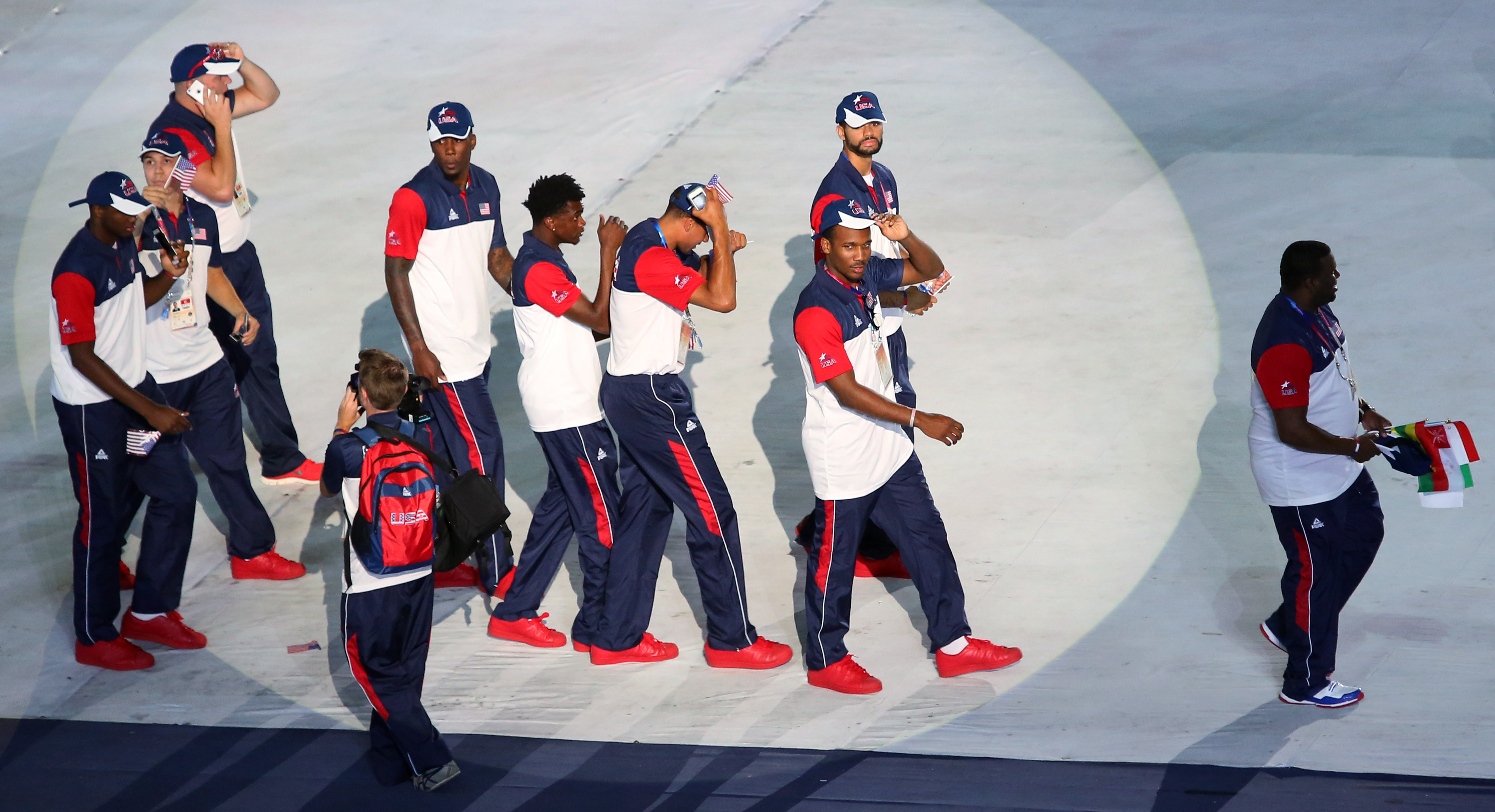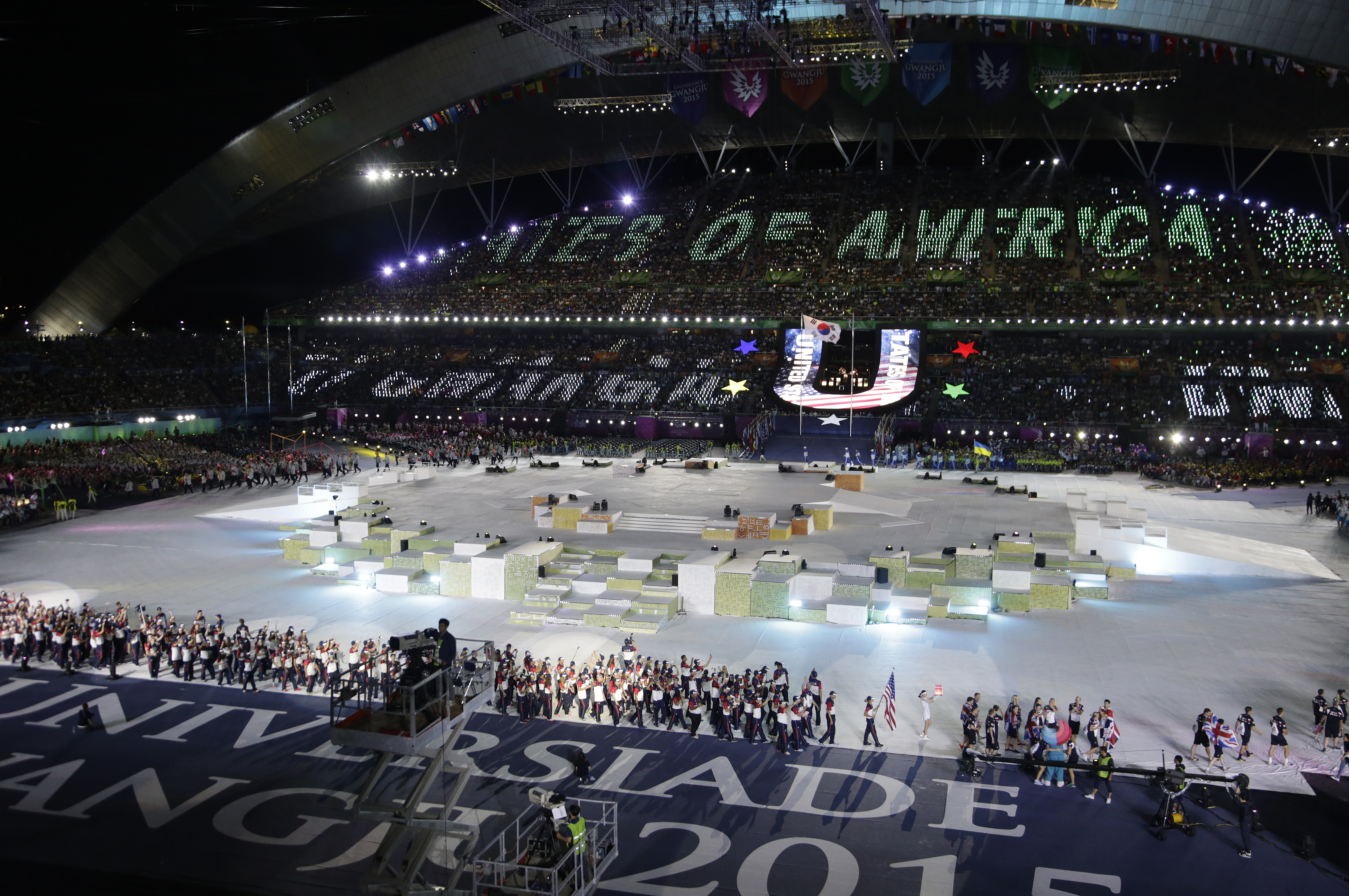 The spotlight hits members of the Team USA basketball team enter Gwangju Universiade Main Stadium during the opening ceremony of the 28th World University Games July 3 in Gwangju, South Korea.