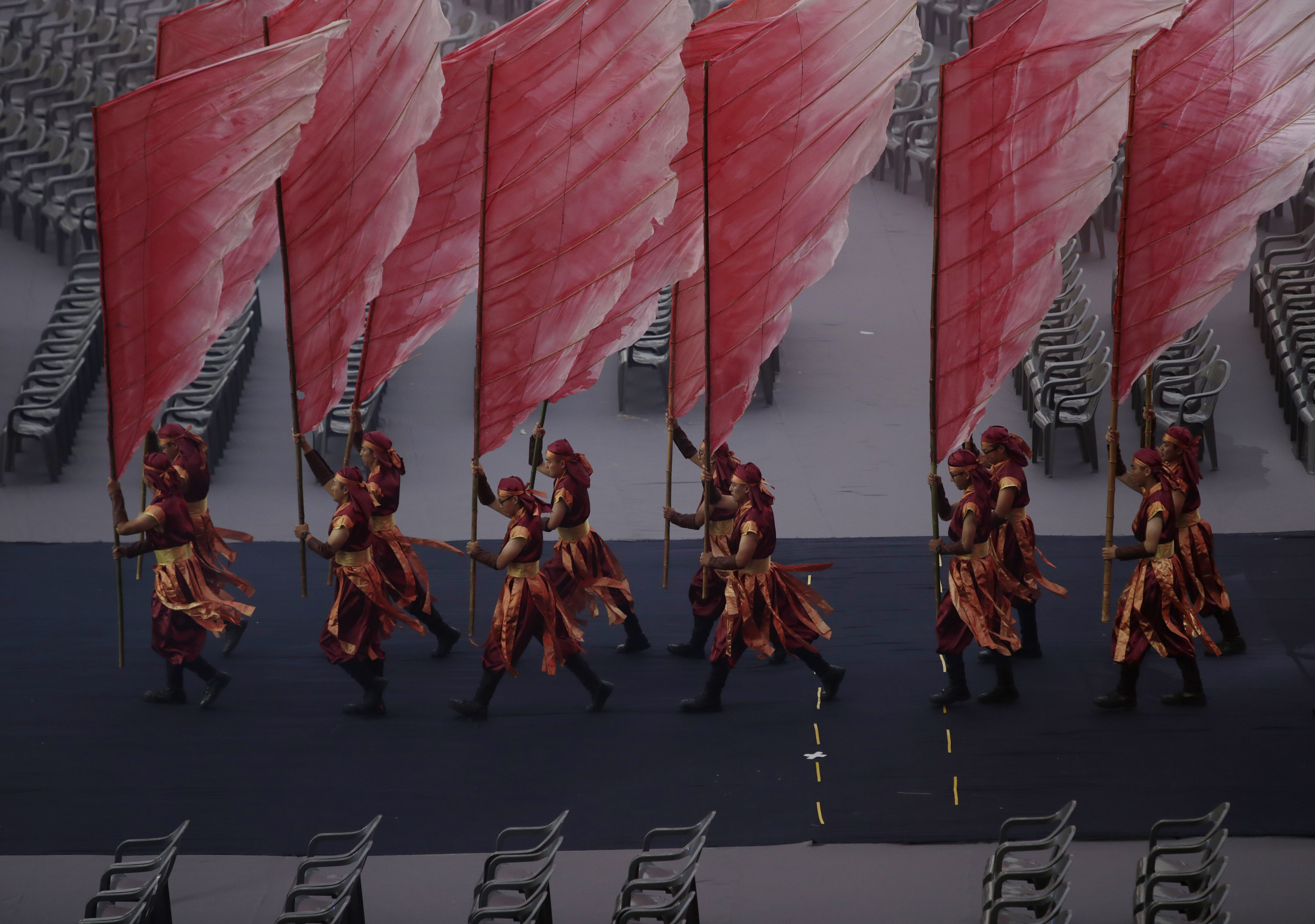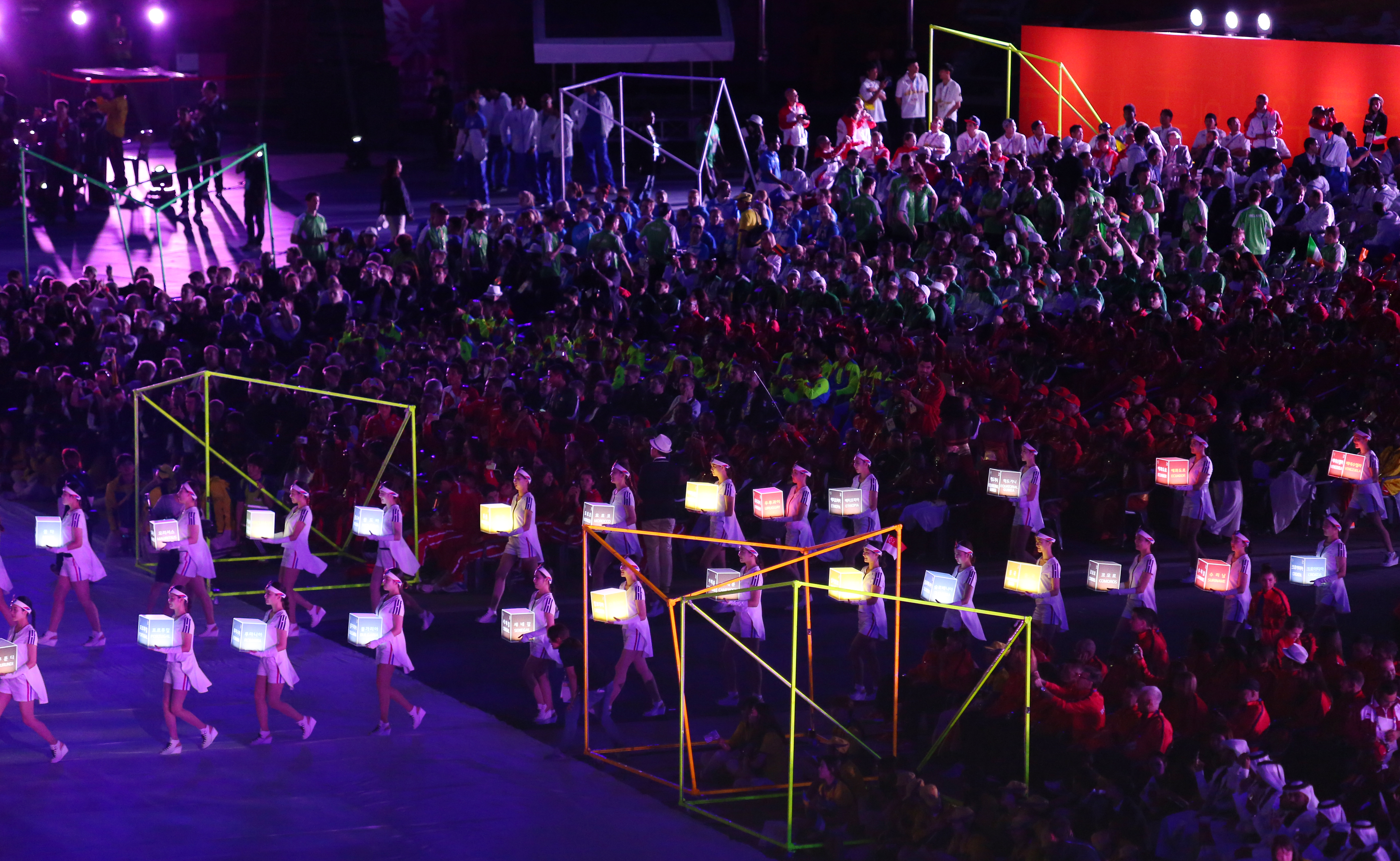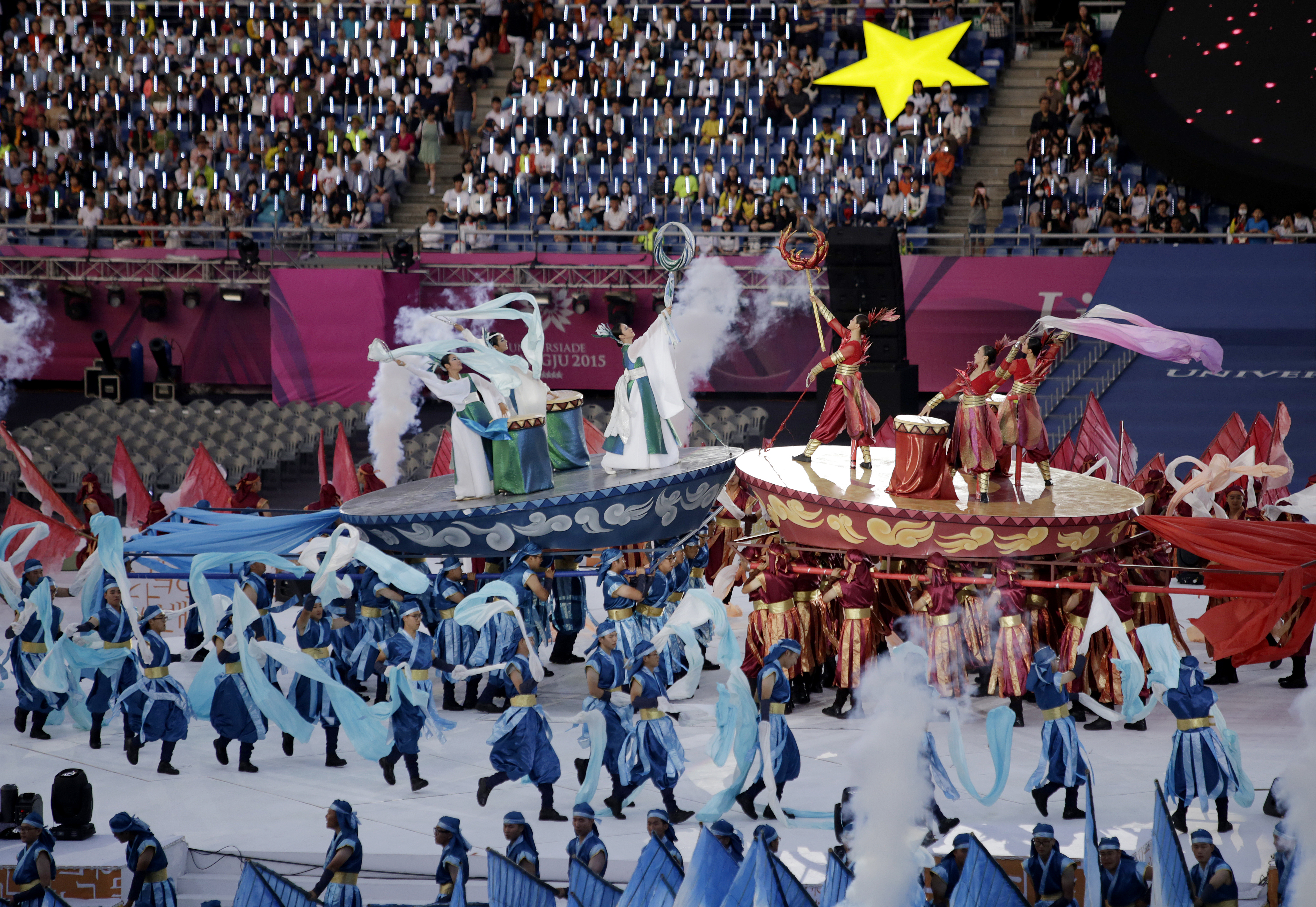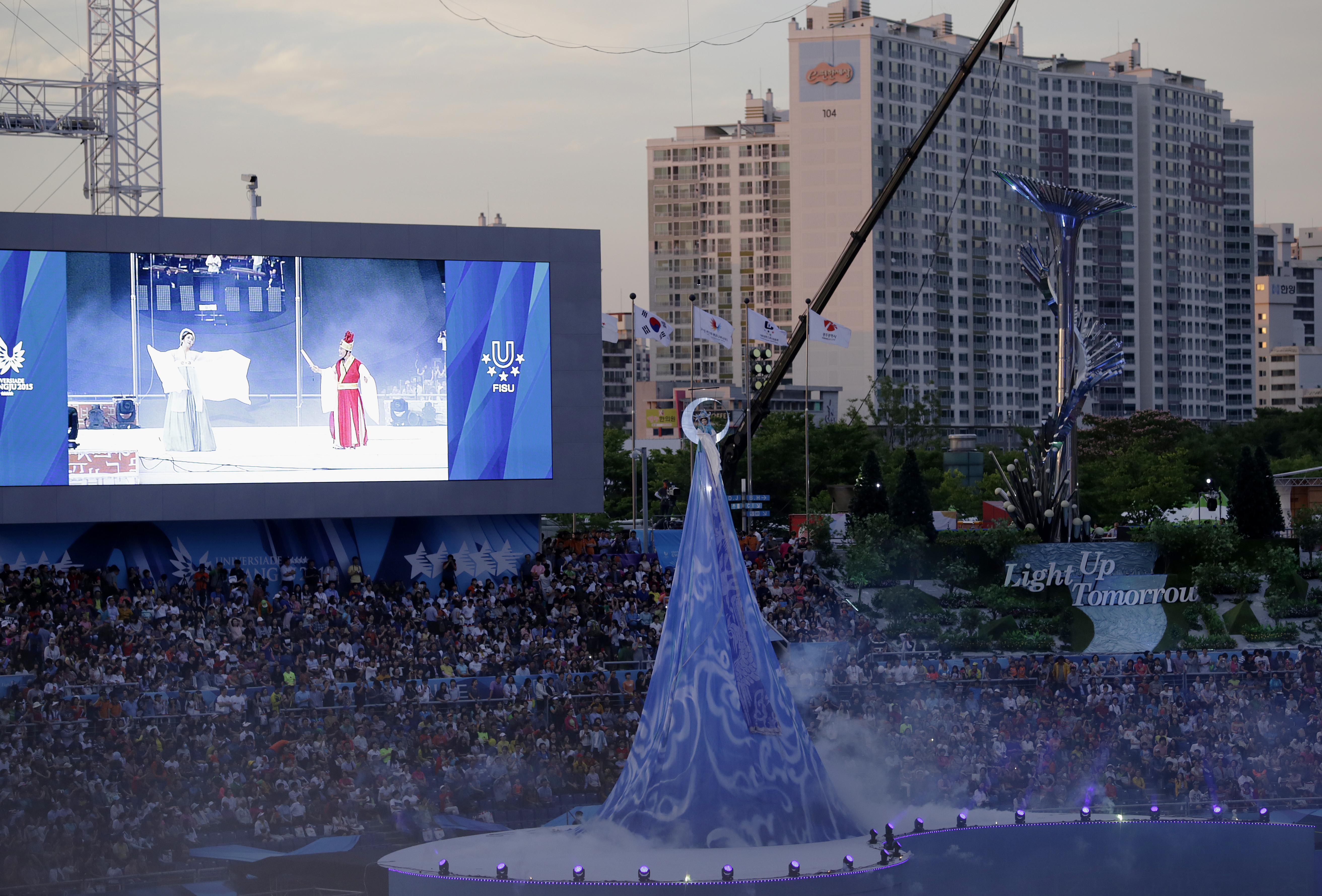 Performers enter into Gwangju Universiade Main Stadium and by seats soon to be filled with approximately 14,000 athletes from around the world, during the opening ceremony of the 28th World University Games July 3 in Gwangju, South Korea.