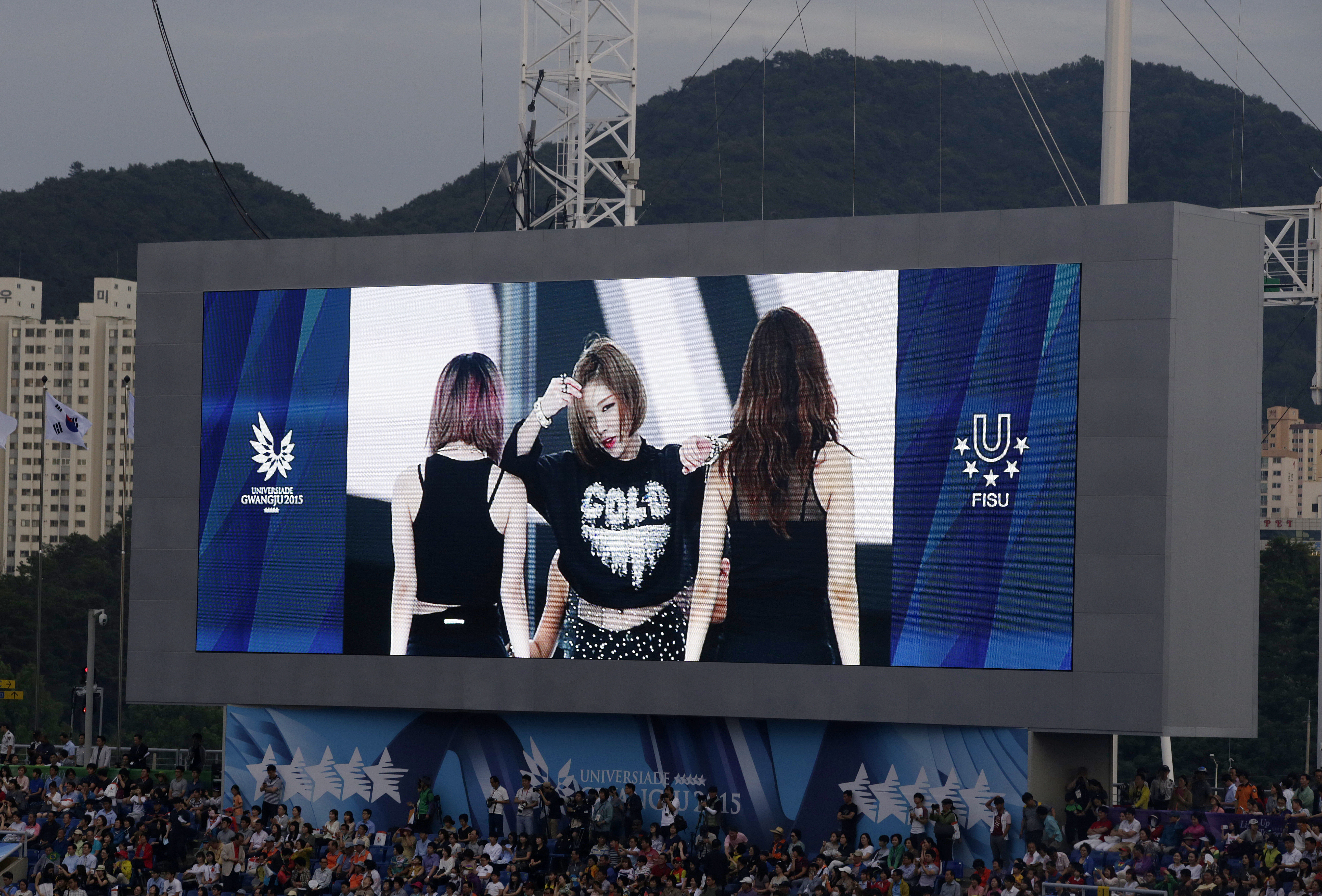 The Brown Eyed Girls are displayed on the video monitor inside Gwangju Universiade Main Stadium during the opening ceremony of the 28th World University Games July 3 in Gwangju, South Korea.
