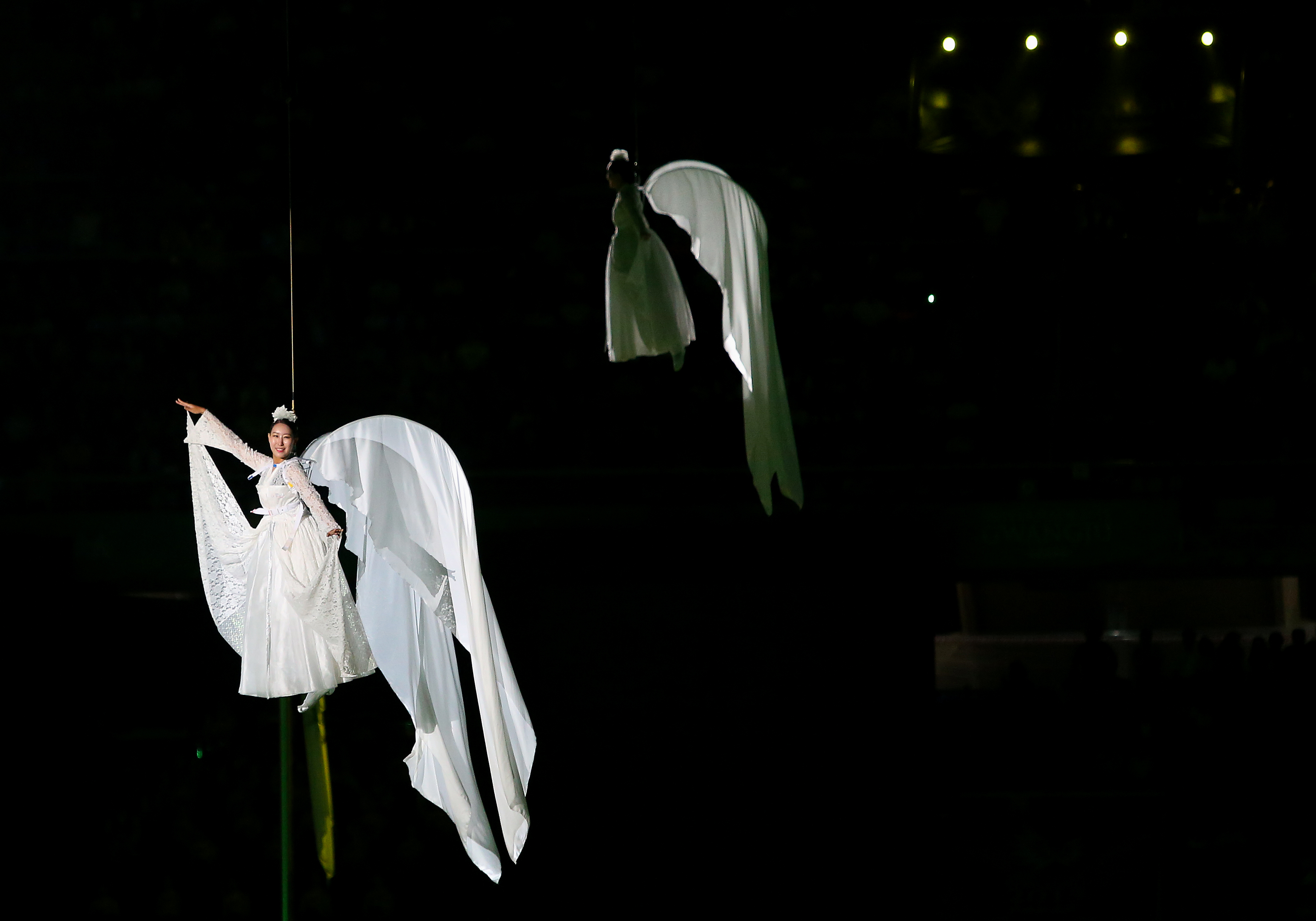 Performers glide high above the floor of Gwangju Universiade Main Stadium during the opening ceremony of the 28th World University Games July 3 in Gwangju, South Korea.