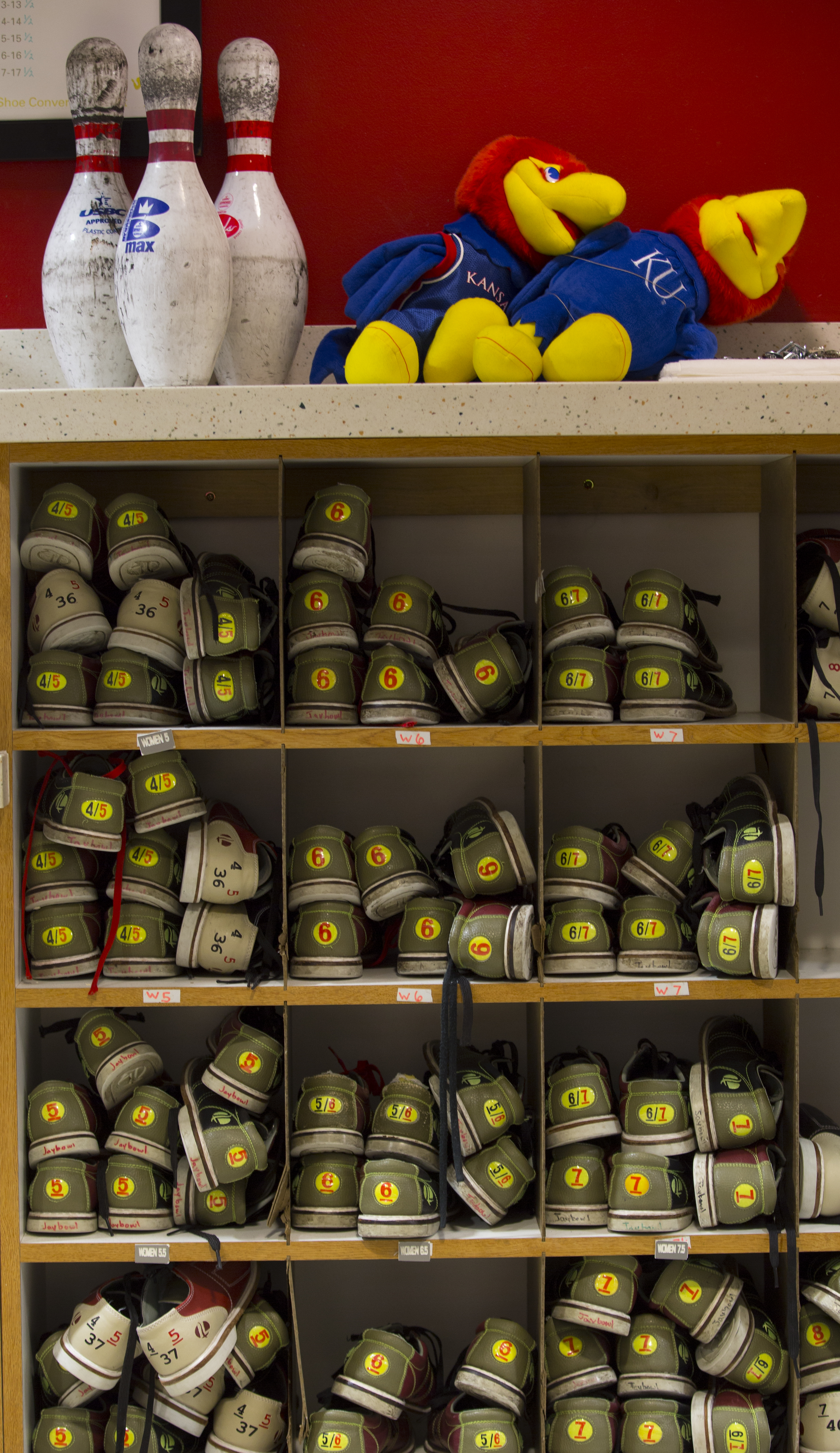 Bins filled with shoes await bowlers on Tuesday, April 14, 2015 at Jaybowl in the Kansas Union.