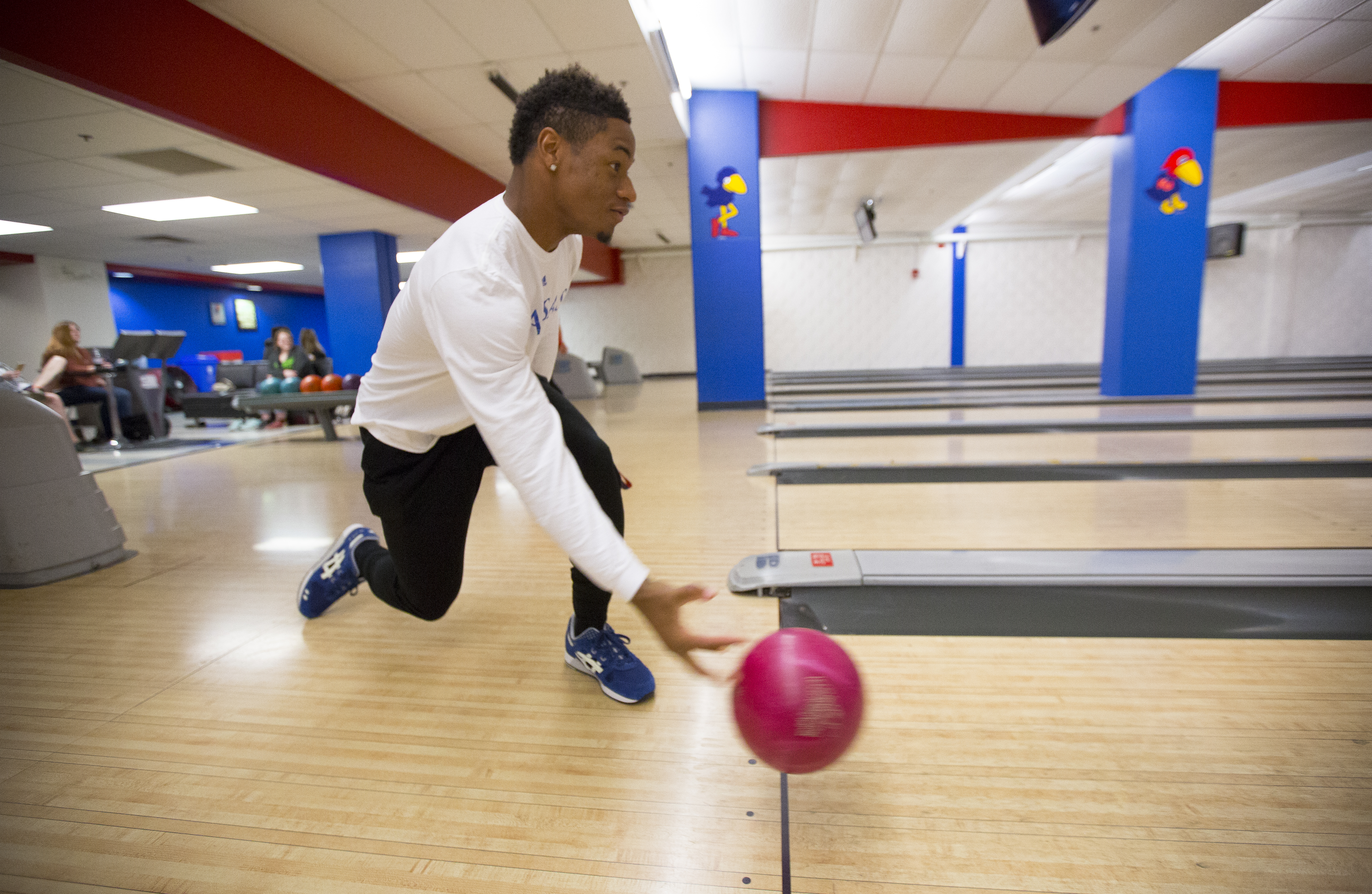 Kansas University freshman Darious Crawley, Houston, Texas, rolls down the lane during a bowling class on Tuesday, April 14, 2015 at Jaybowl. The bowling alley, which has been around since 1953, will close in early May.