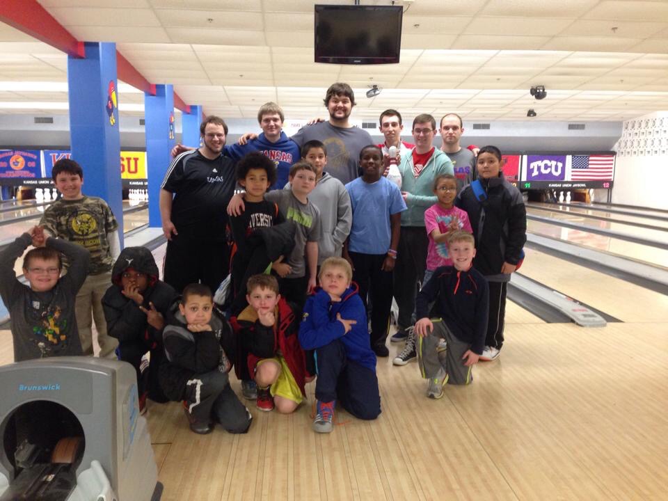 The KU bowling team pictured at Jaybowl in 2014 at an event the team put on for members of the Boys and Girls Club.