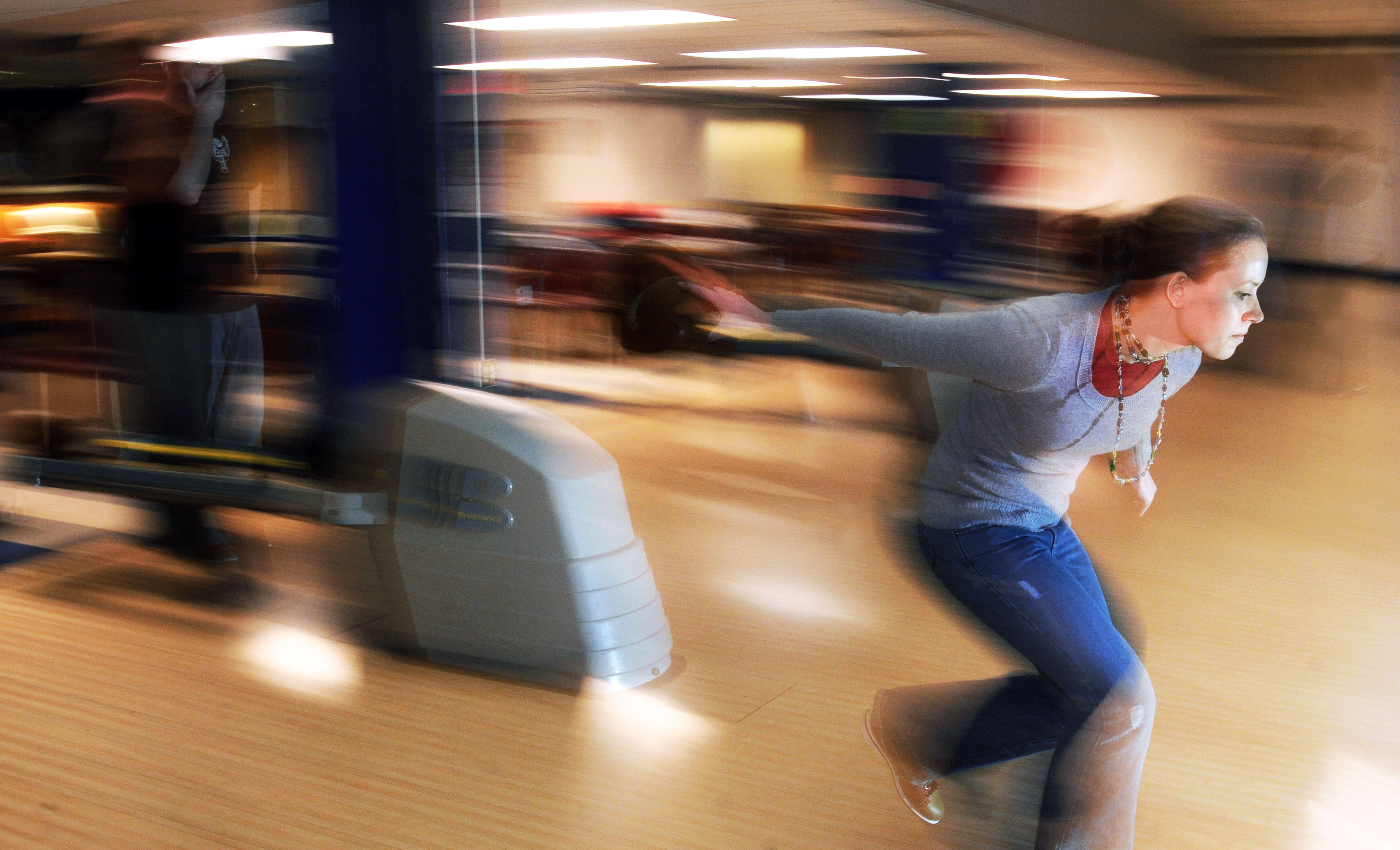 Kansas University senior Lindsey Wiegele, Shawnee, bowls at the Jaybowl in the Kansas Union. The Kansas Union's board of directors passed a proposal that would allow sales of 3.2 beer in the Jaybowl and Hawks Nest on the lowest level of the union. The proposal must be approved by the provost's office.