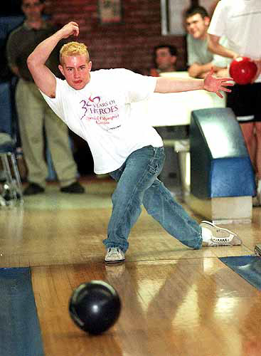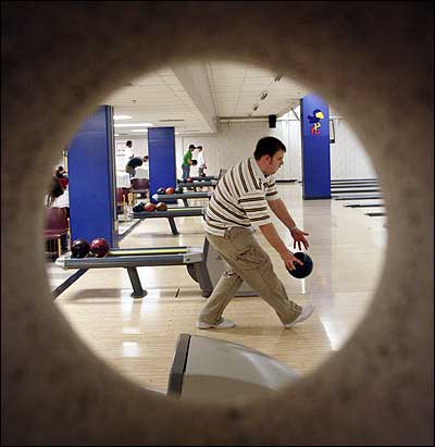 Zac McIntyre, seen through an opening in the wall of Jaybowl in the Kansas Union, makes his approach. A group of Kansas University students is pushing for beer to be served in the Kansas Union. "If people want alcohol here, then they will want to start having it at football games," said McIntyre, a 21-year-old Lawrence freshman, on Tuesday. "It might start more problems."