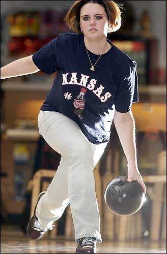 Kelly Zapf bowls a line at Jaybowl. Zapf, from Rochester, N.Y., chose KU over Nebraska despite the fact she gets no scholarship money to bowl for the Jayhawks.