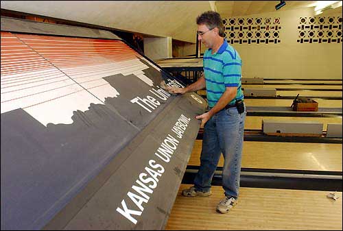 KU bowling club coach Mike Fine looks over the refurbished Jaybowl. The remodeled facility is set to open on Sept. 3