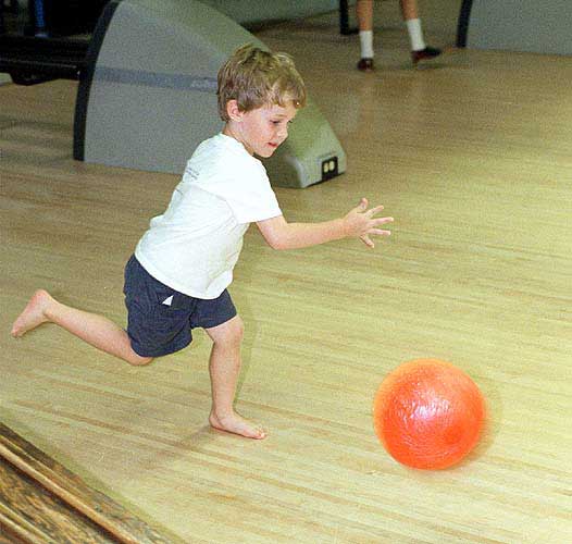 Aubrey Frook, 5, gives it his all during a bowling session at Royal Crest Lanes, Ninth and Iowa streets. Although Aubrey's family had a choice of open lanes Thursday, availability may change now that Kansas University's Jaybowl is closing for a year.