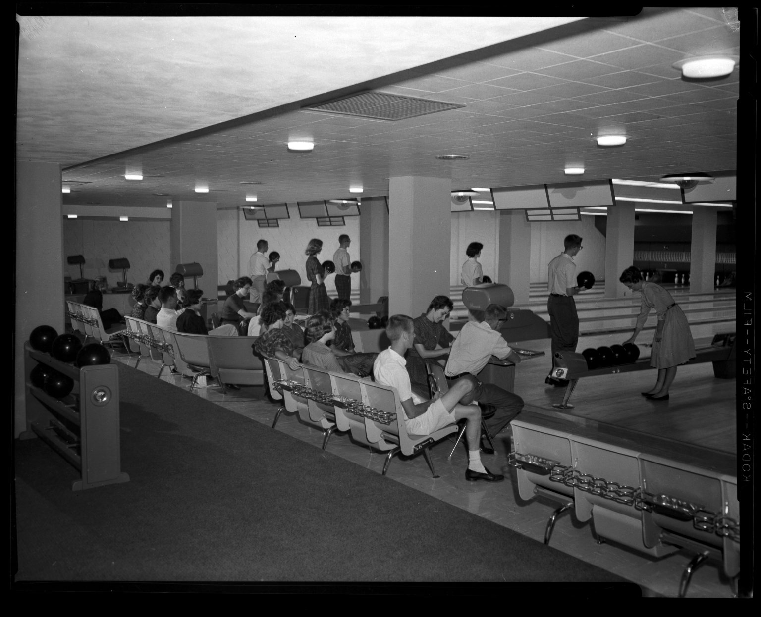 People bowl and socialize at the Jaybowl during the 1950s. Photo courtesy of Spencer Research Library, Kansas University Libraries.