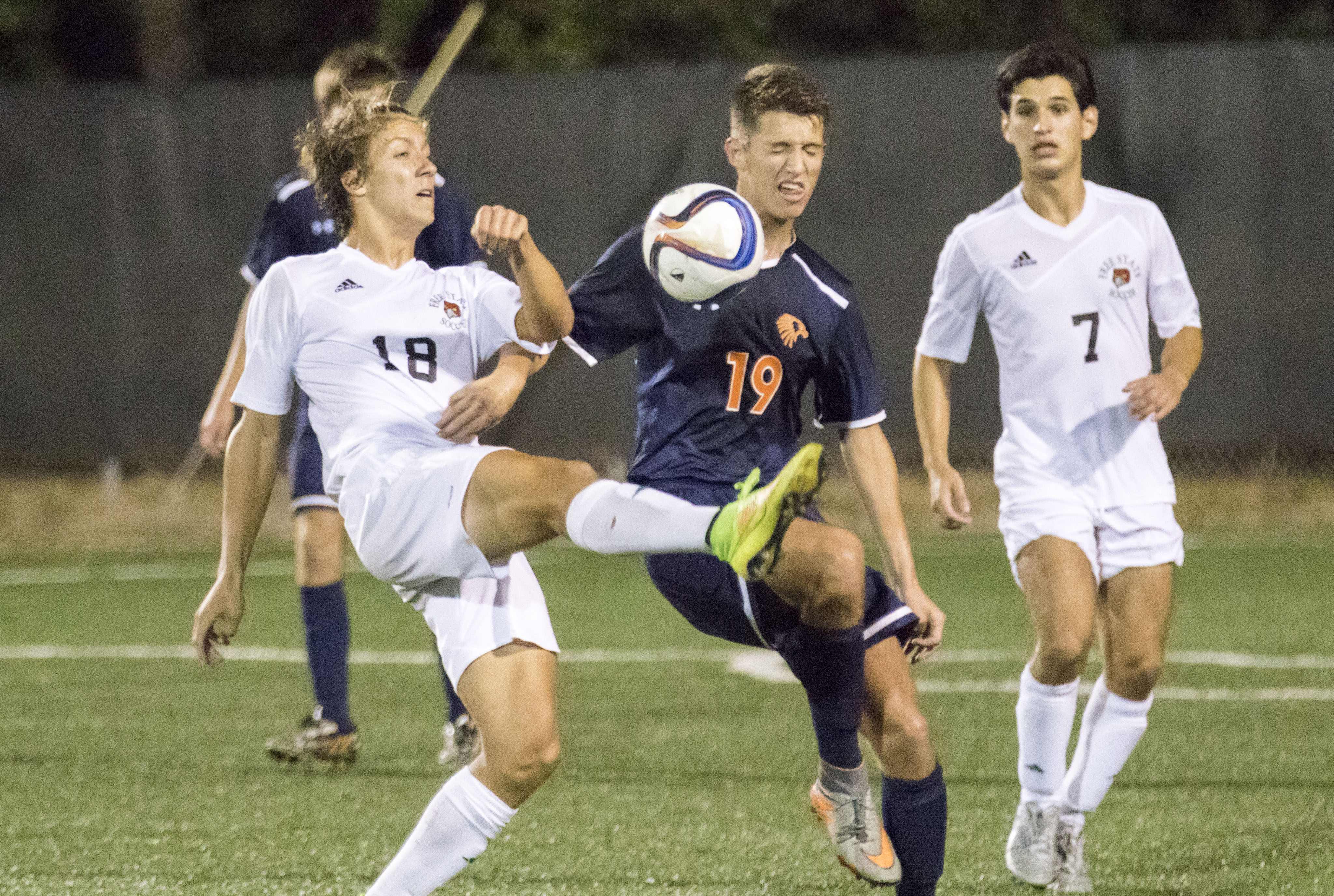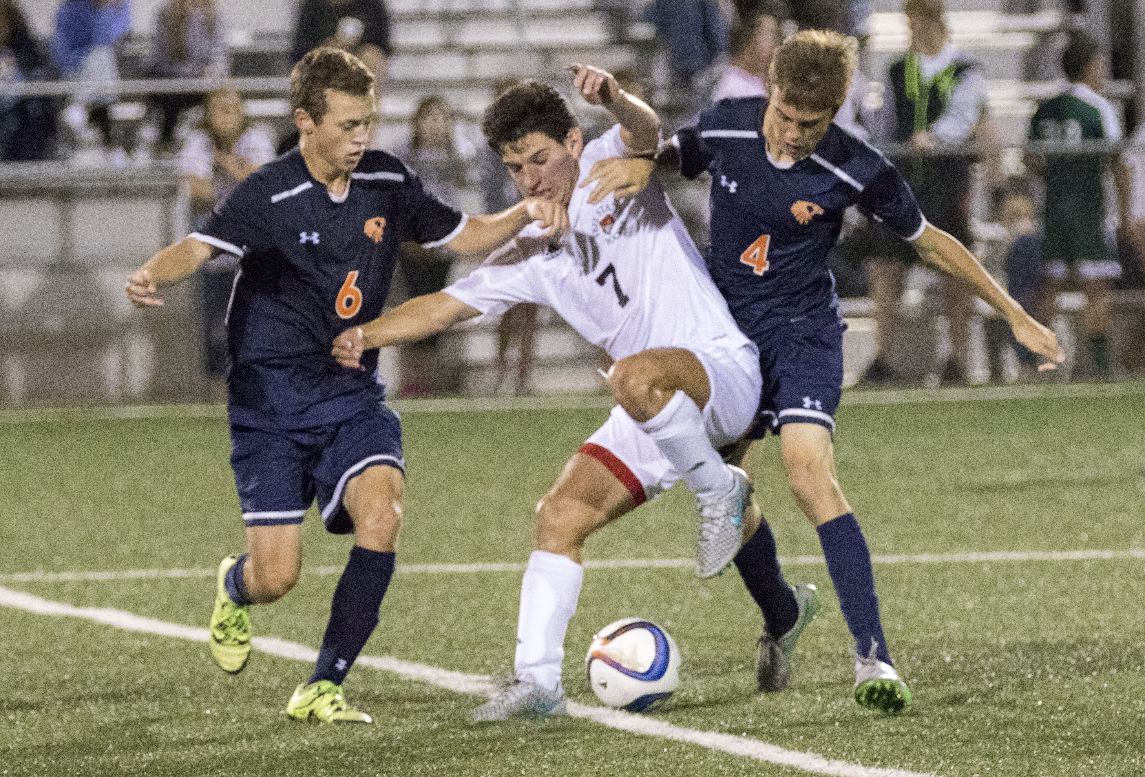 Free State senior Eduardo Carballido Flores (7) is hounded by Olathe East's Shane Kopplin (6) and Jeremy Edds (4) during their soccer match Tuesday evening at FSHS.