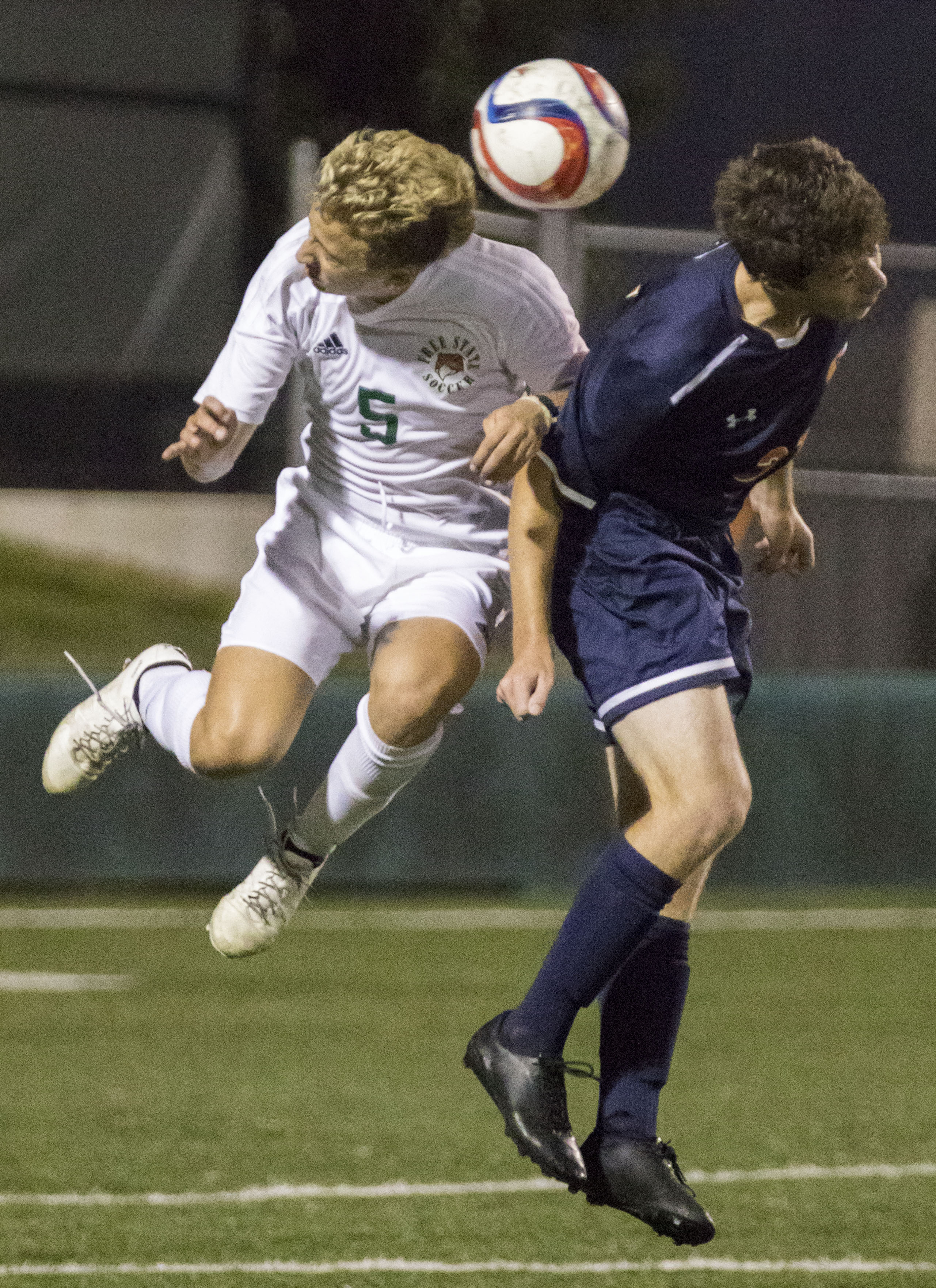 Free State sophomore Charlie Newsome (5) and Olathe East's Tim Williams battle in the air to control the ball during their soccer match Tuesday evening at FSHS.