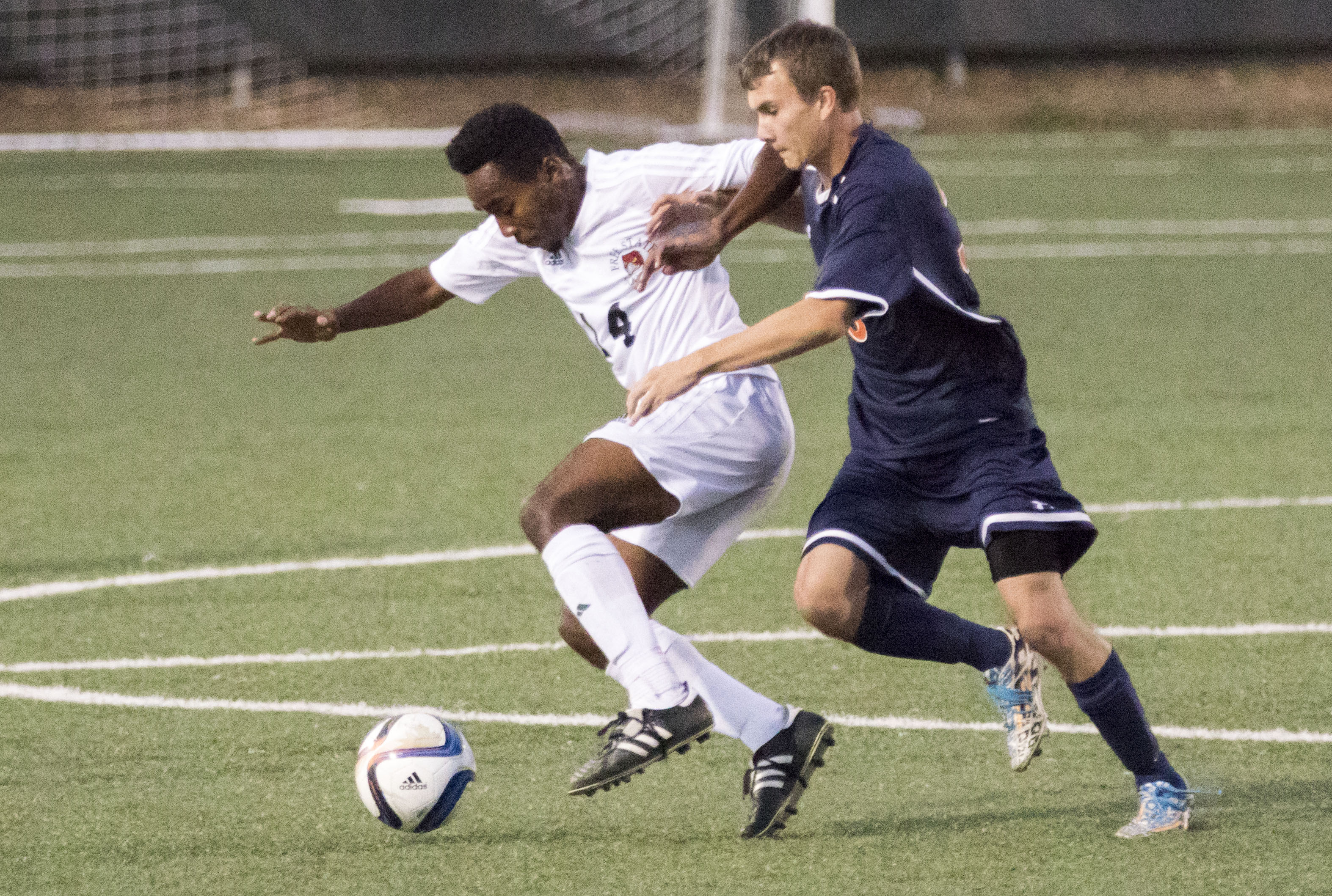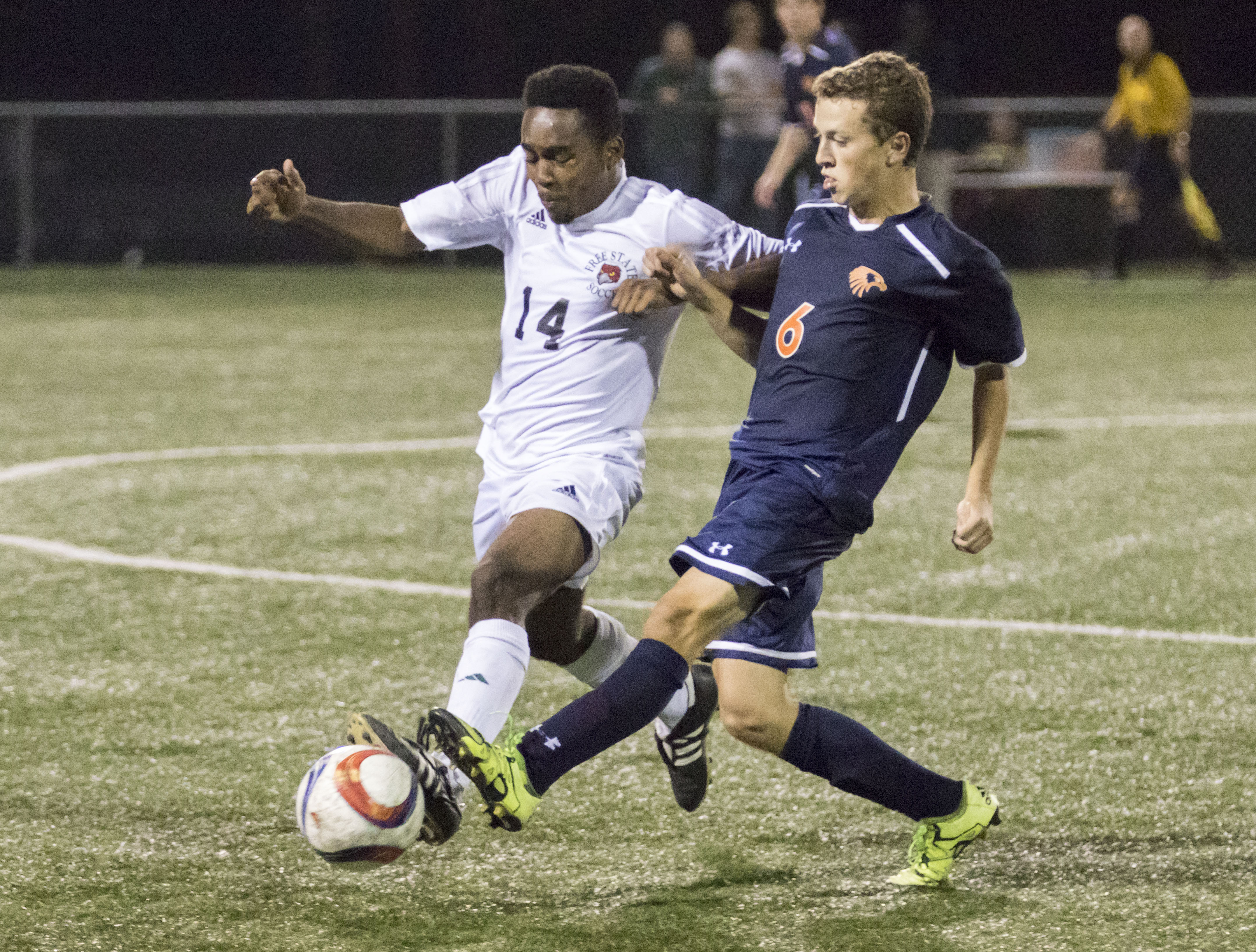 Free State senior Ernesto Hodison (14) holds off Olathe East senior Aaron Murray as they chase down the ball during their soccer match Tuesday evening at FSHS.