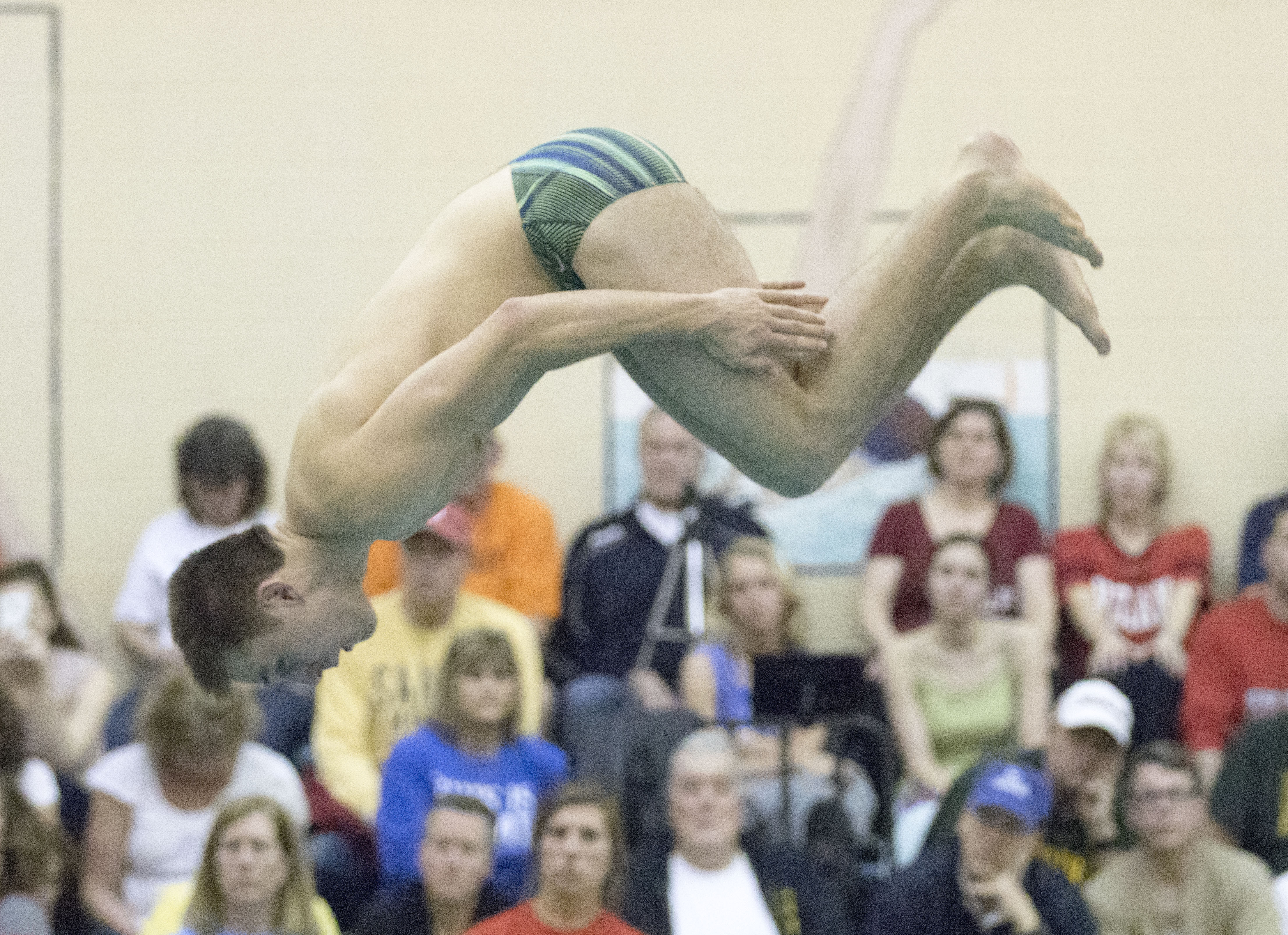 Free State High junior Chad Bourdon flips in the air as the crowd watches while competing in the one meter diving finals at the Sunflower League Boys Swimming and Diving Championships Saturday afternoon in Olathe.