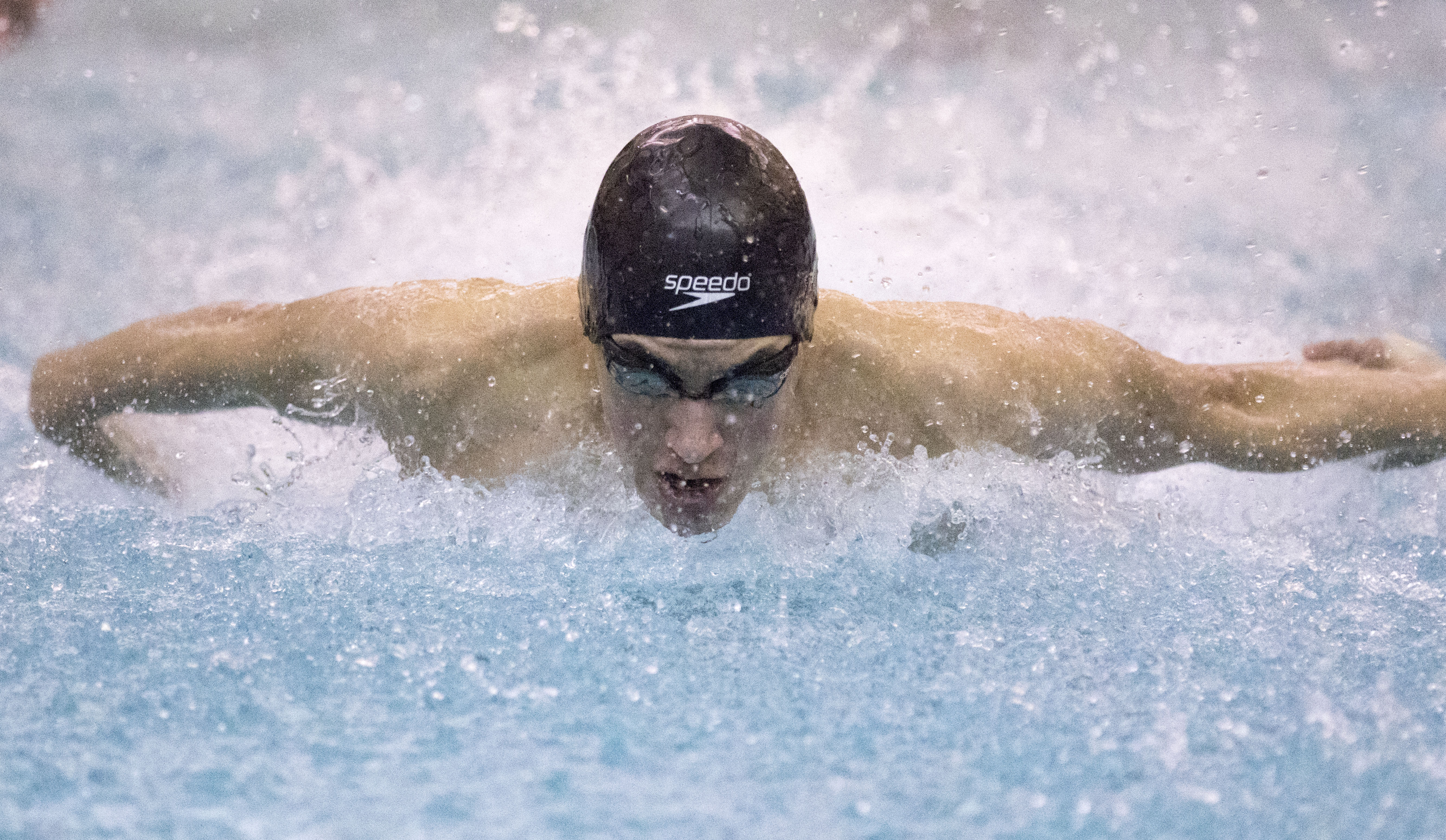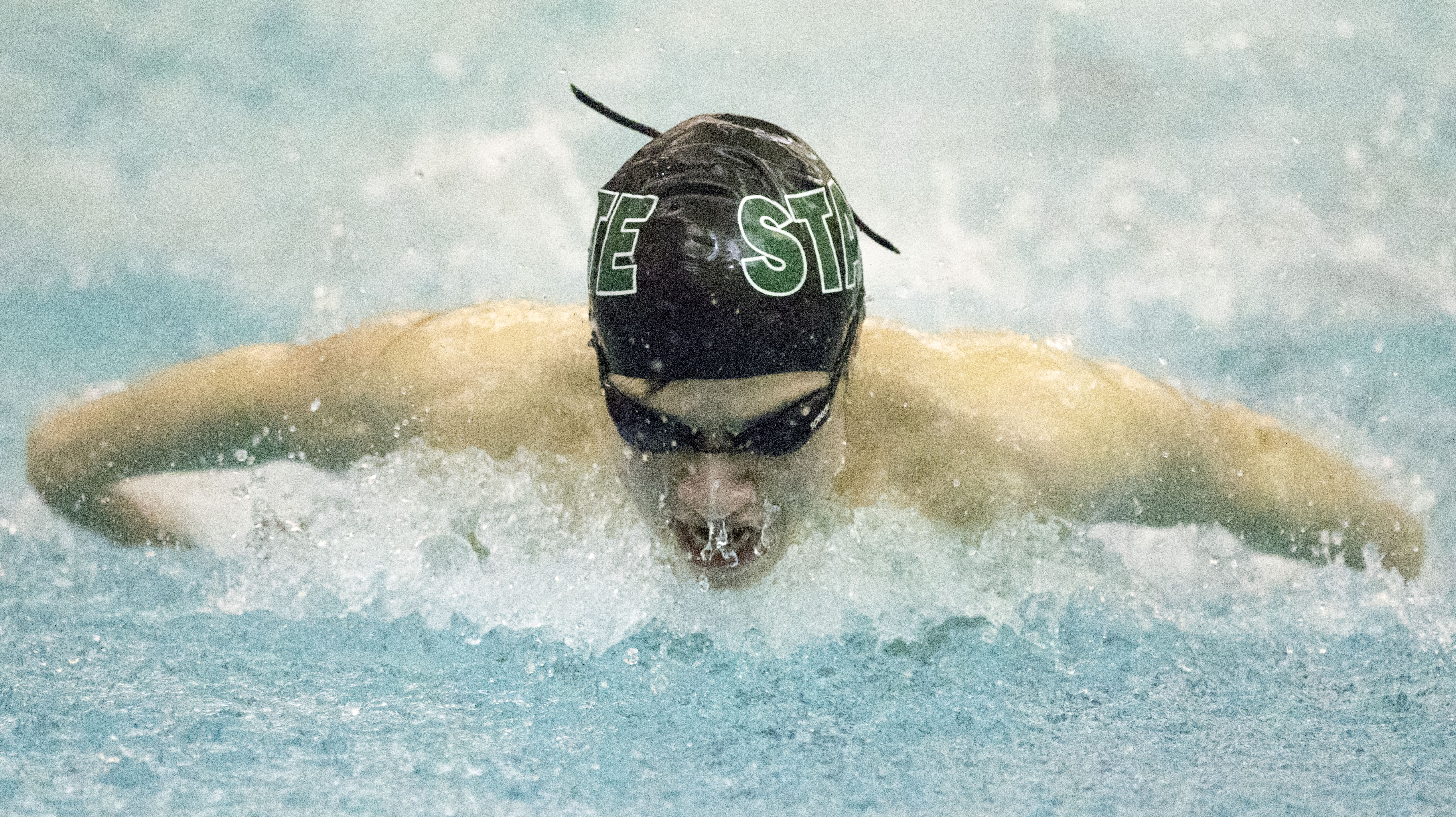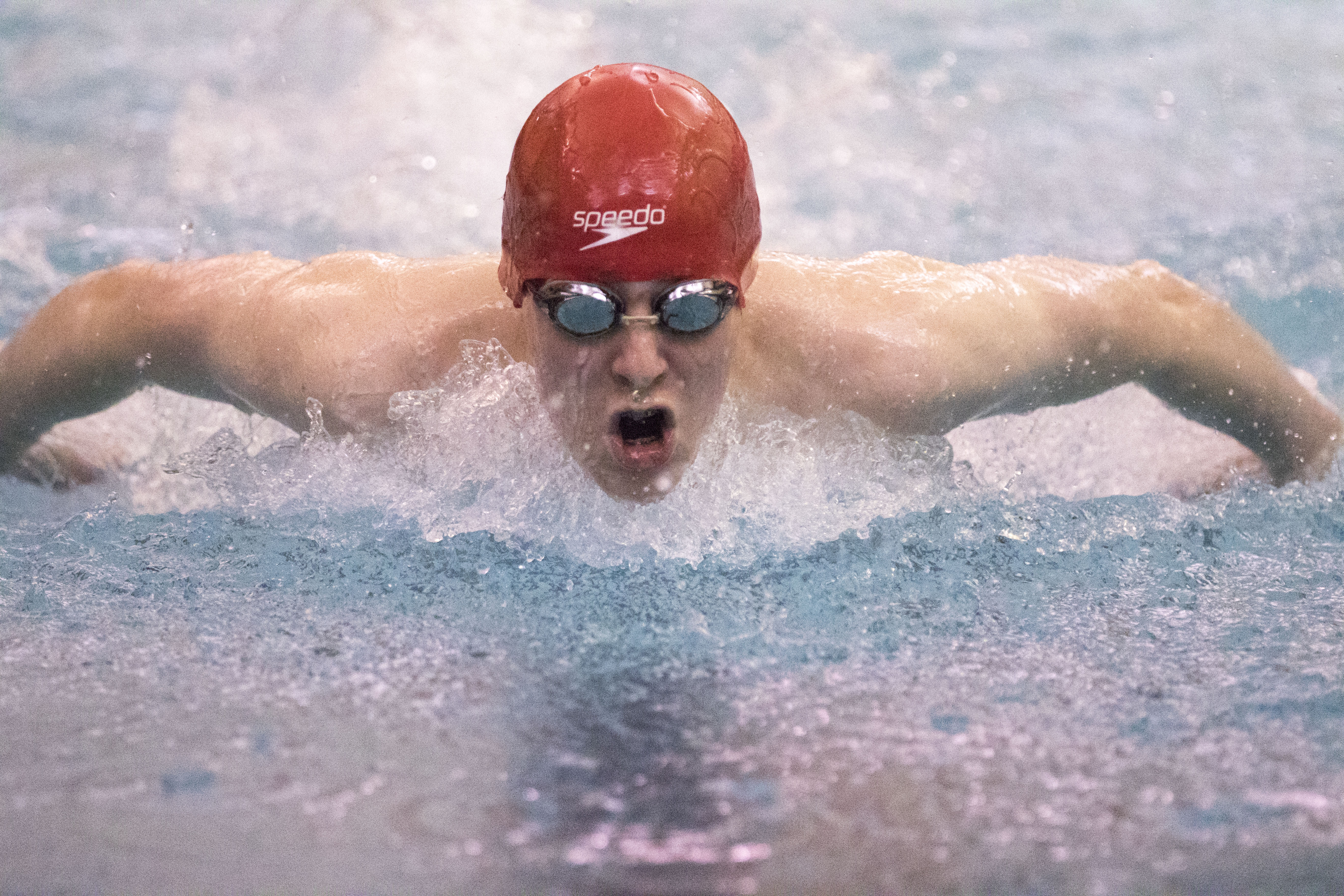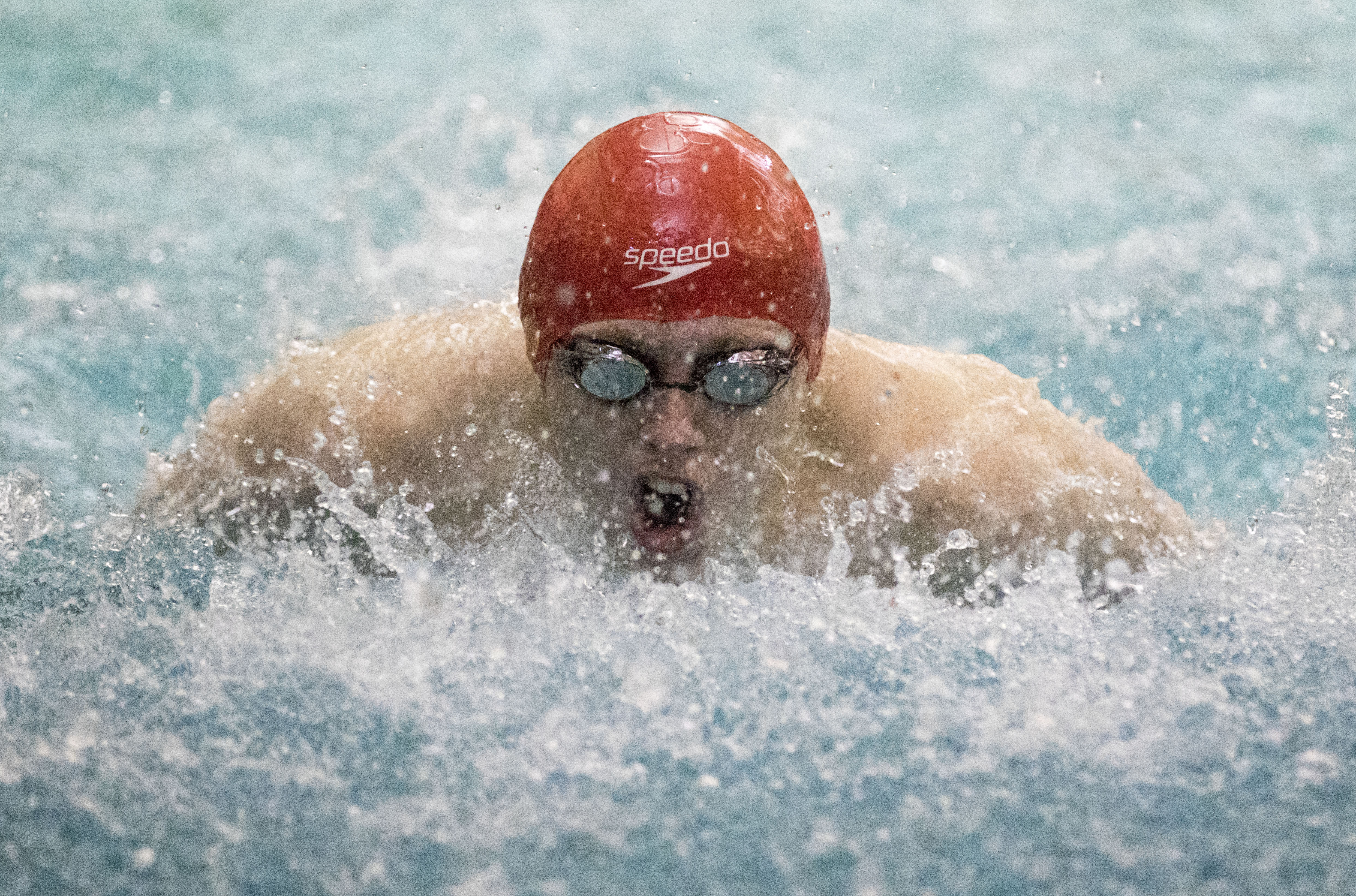 Free State High sophomore Evan Eskilson competes in the 100 yard butterfly event at the Sunflower League Boys Swimming and Diving Championships Saturday afternoon in Olathe.