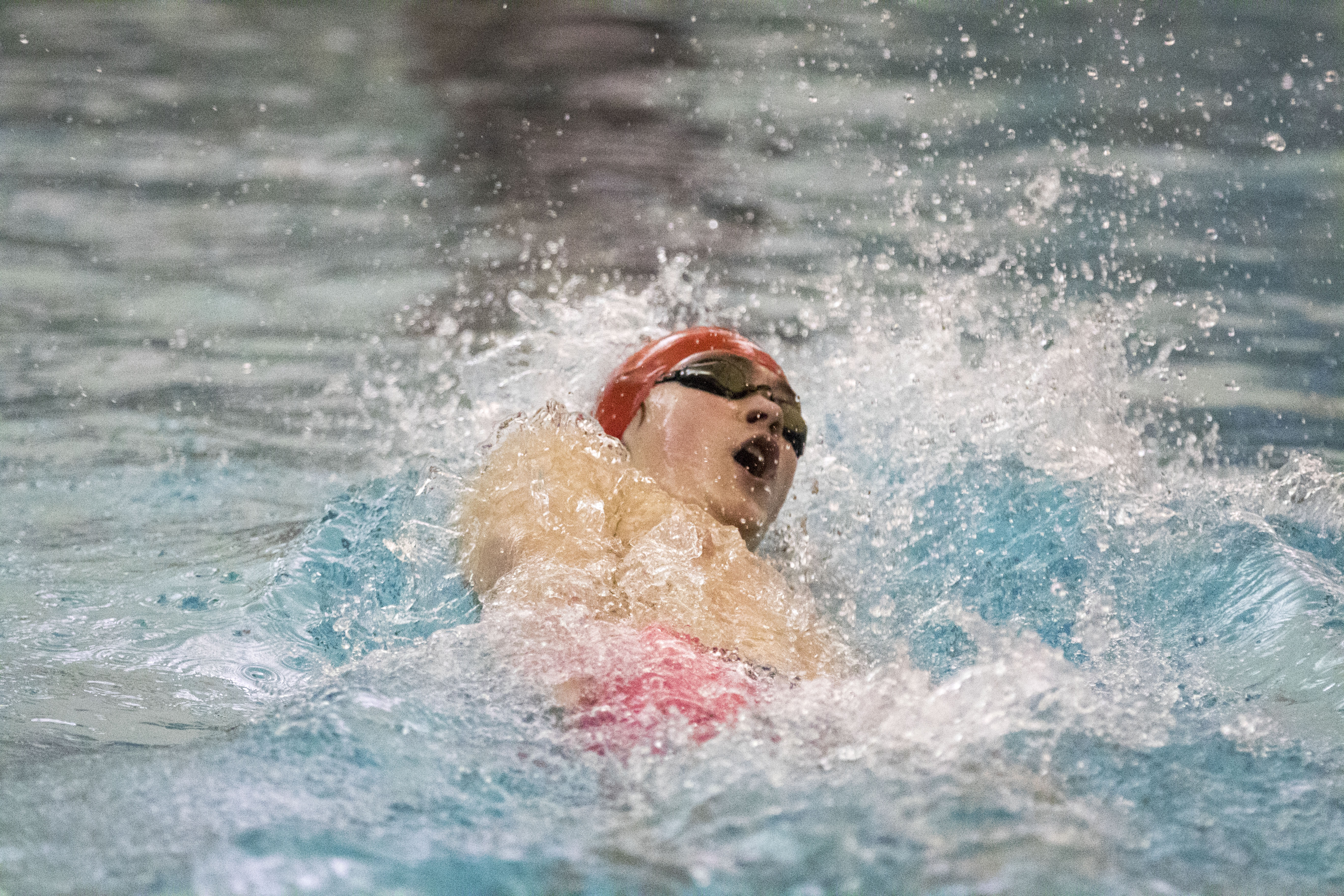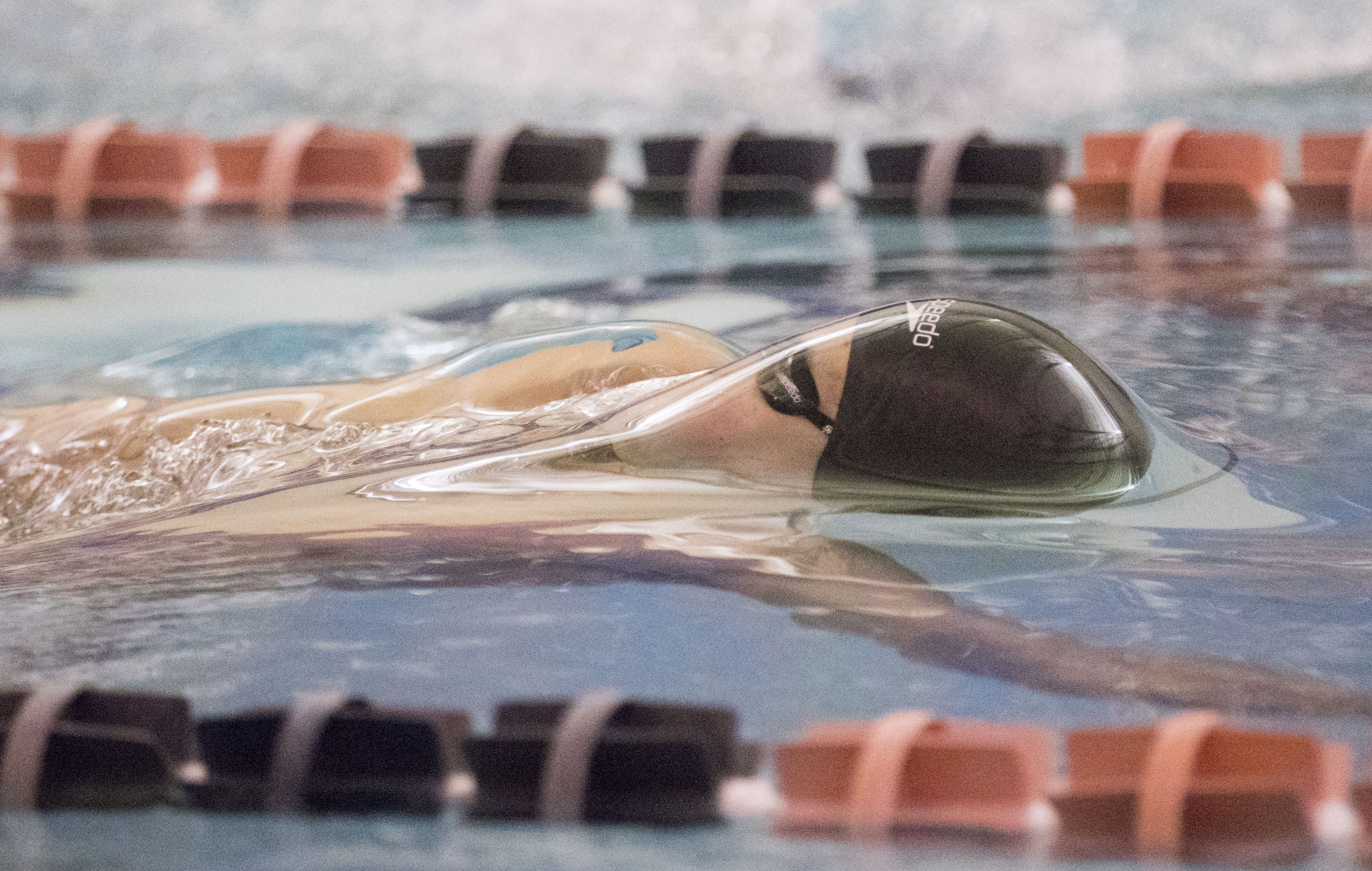 Free State High sophomore Evan Eskilson emerges from under the water while competing in the 100 yard backstroke event at the Sunflower League Boys Swimming and Diving Championships Saturday afternoon in Olathe.