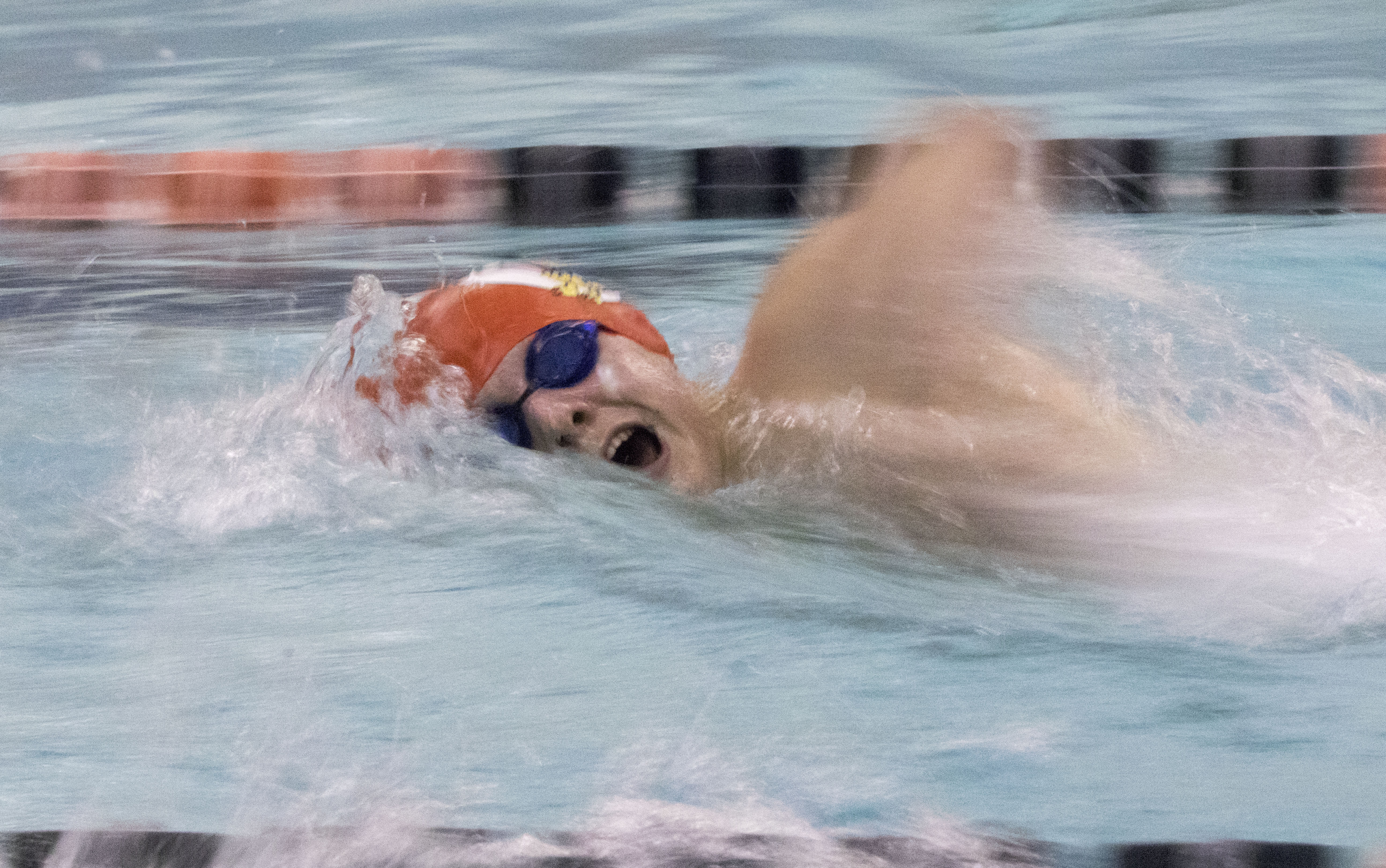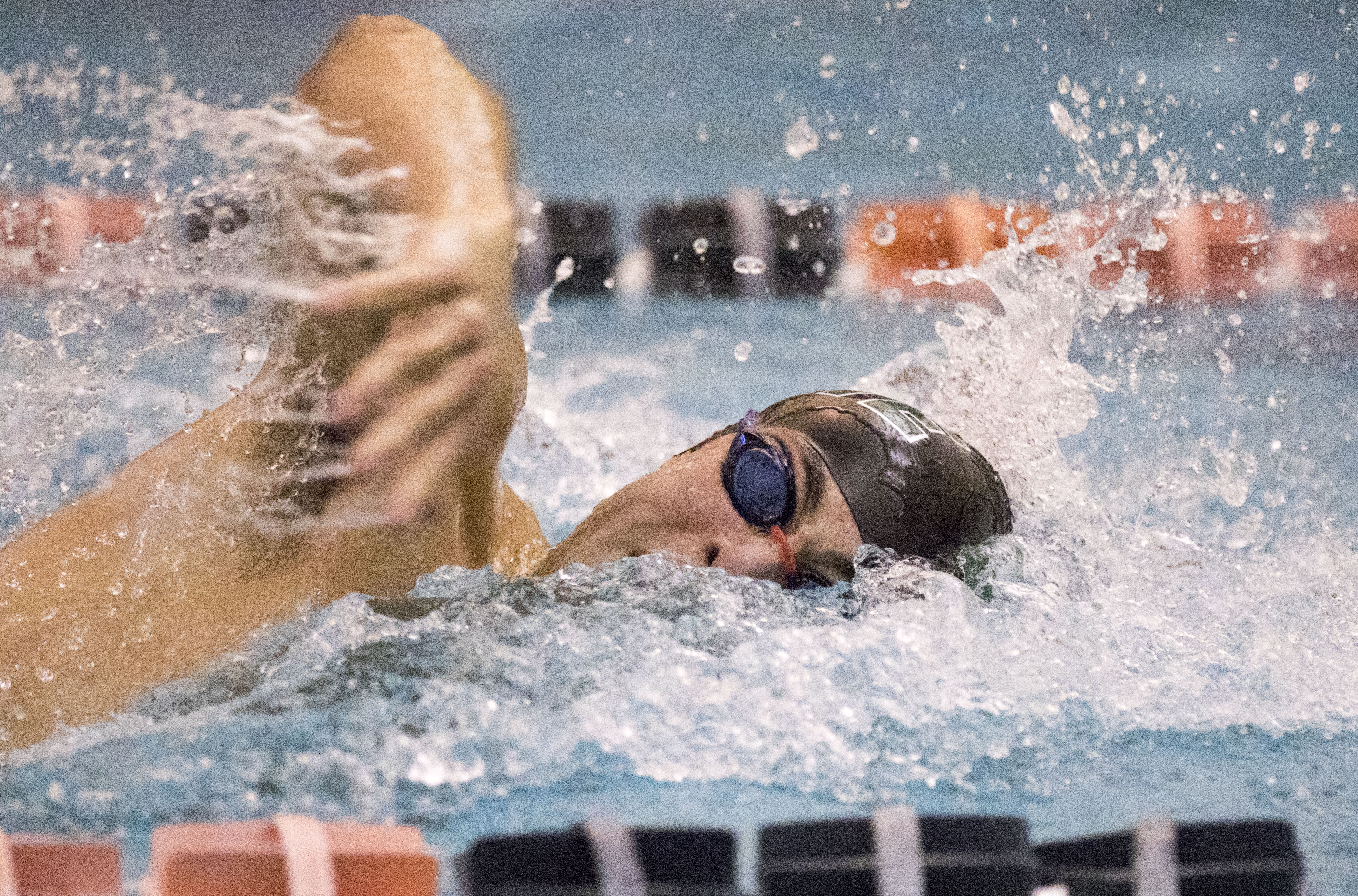 Lawrence High sophomore Stephen Johnson competes in the 500 yard freestyle event at the Sunflower League Boys Swimming and Diving Championships Saturday afternoon in Olathe.