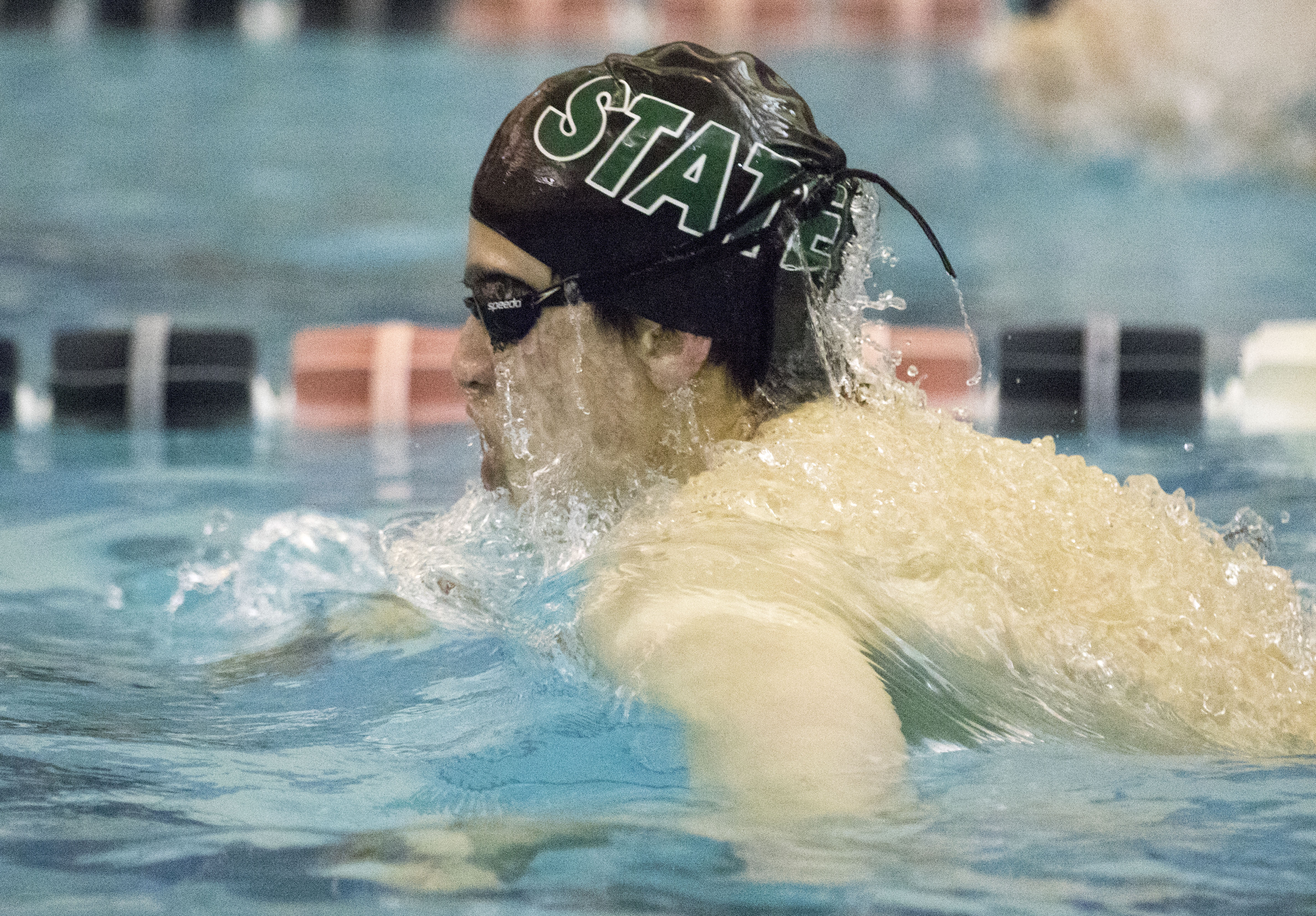 Free State High junior Evan Yoder competes in the 100 yard breaststroke event at the Sunflower League Boys Swimming and Diving Championships Saturday afternoon in Olathe.