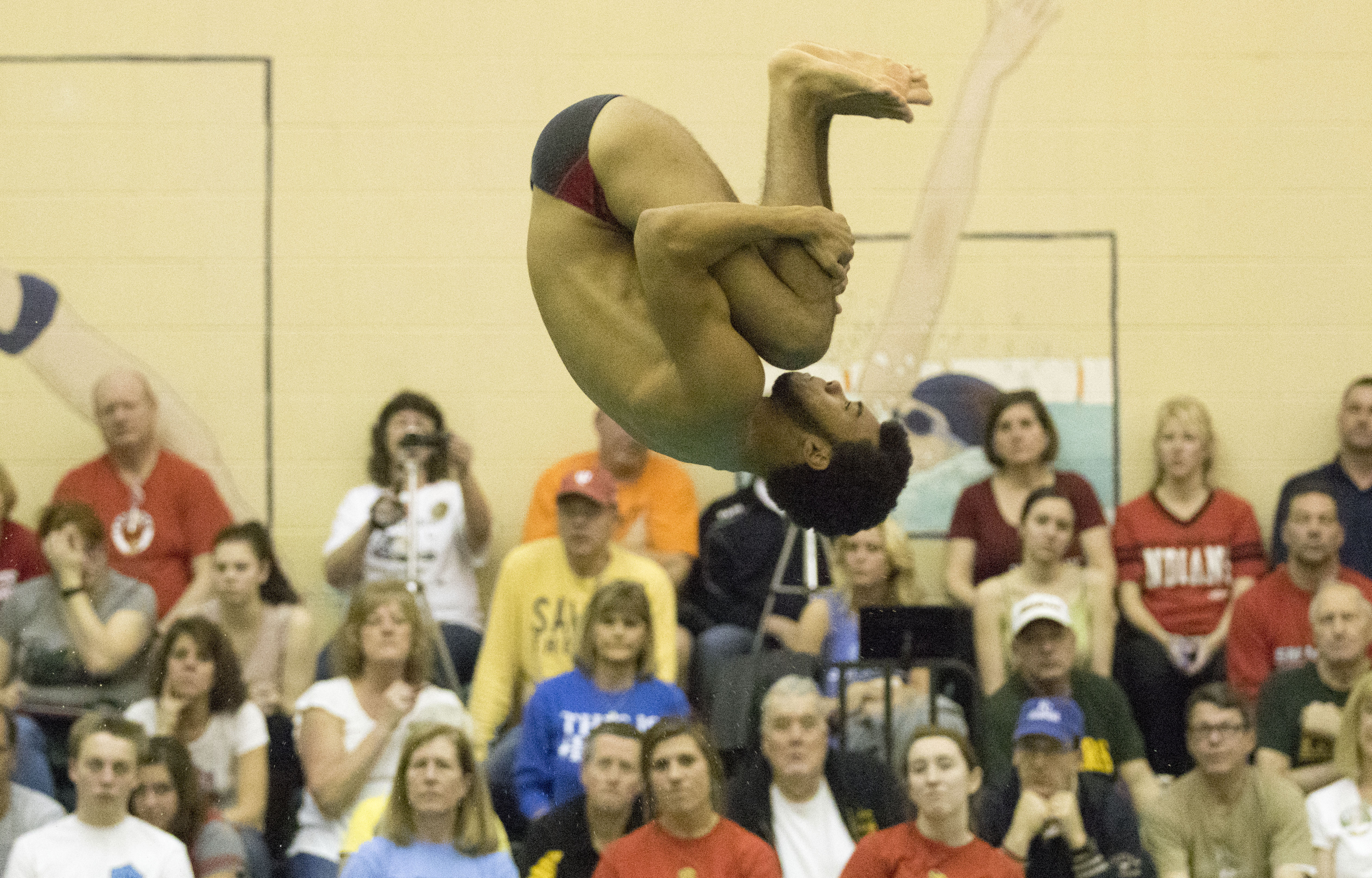 Lawrence High senior Izaiah Bowie tucks as he does a flip while the crowd watches during the one meter diving event at the Sunflower League Boys Swimming and Diving Championships Saturday afternoon in Olathe.