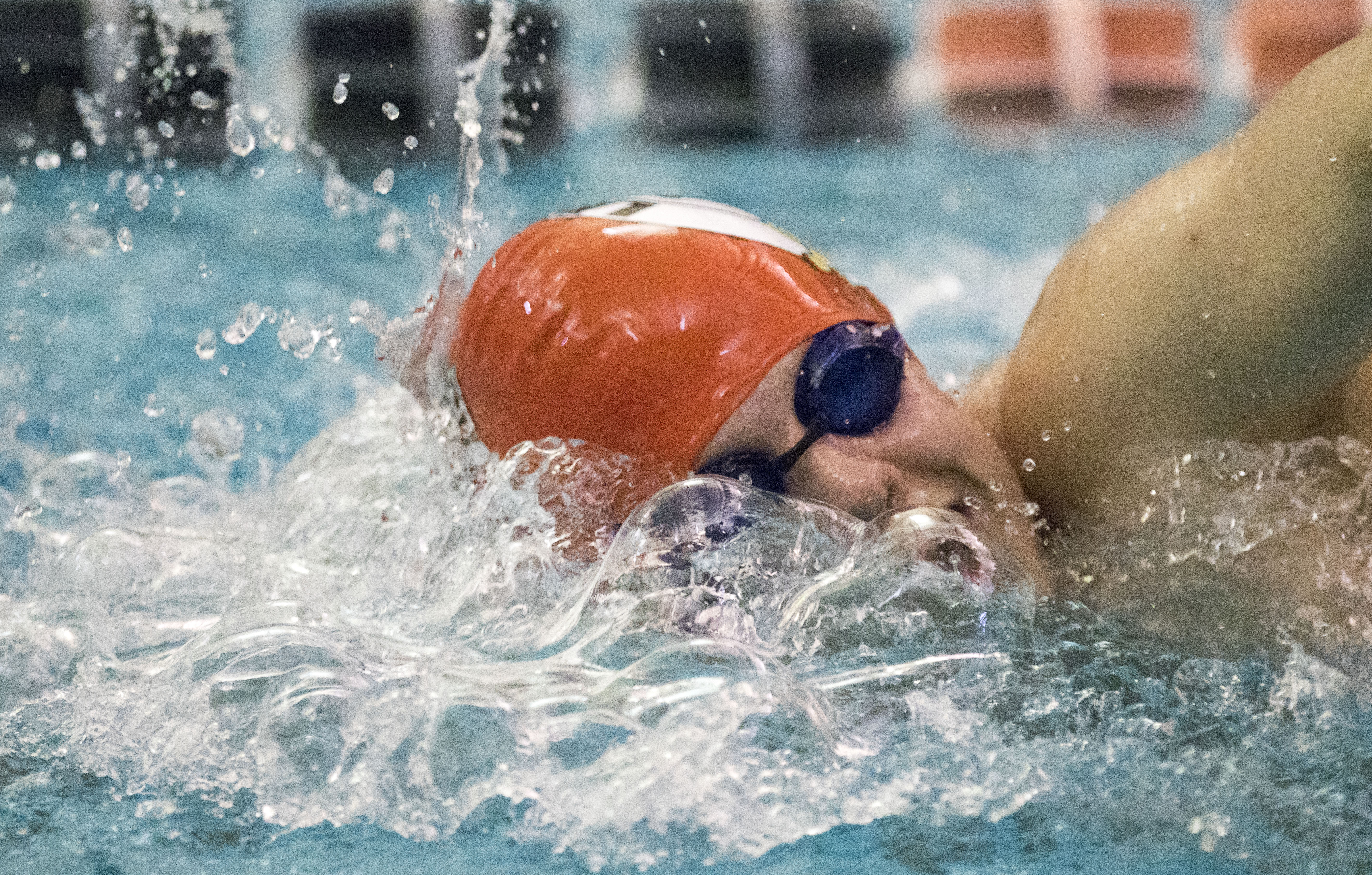 Lawrence High sophomore Alex Heckman competes in the 200 yard medley relay event at the Sunflower League Boys Swimming and Diving Championships Saturday afternoon in Olathe.